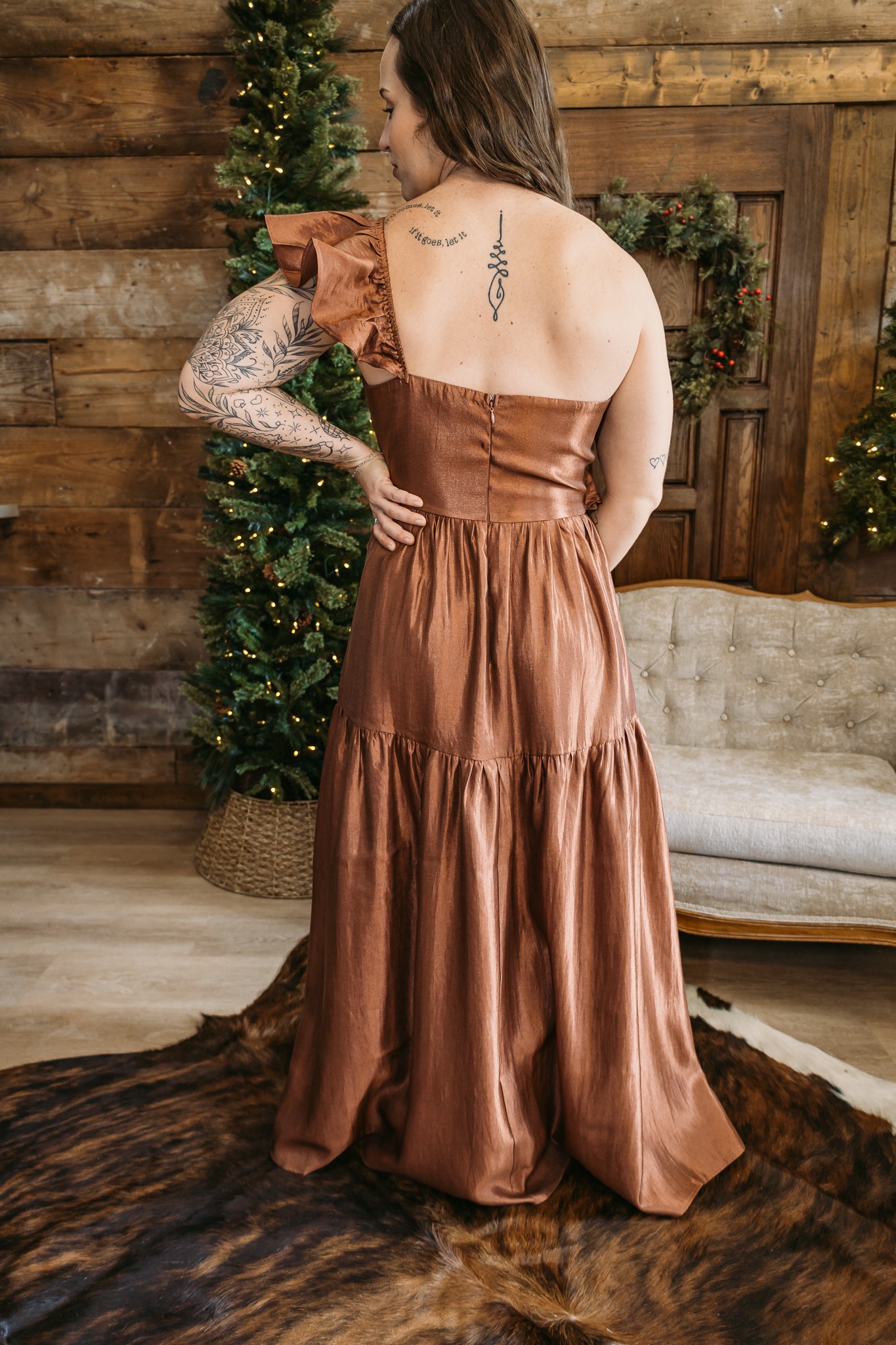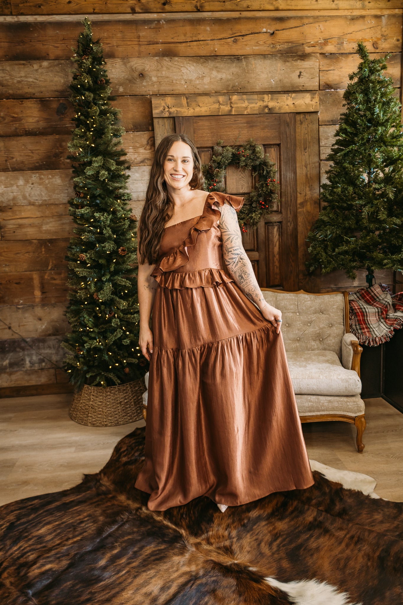 Meet Ember Glow — a warm, radiant statement piece with just the right touch of drama. This copper-toned satin maxi features a one-shoulder neckline with soft ruffle detailing and a beautifully flowy, tiered skirt that moves effortlessly with you. The subtle sheen catches the light perfectly, giving this dress an elevated yet wearable feel.