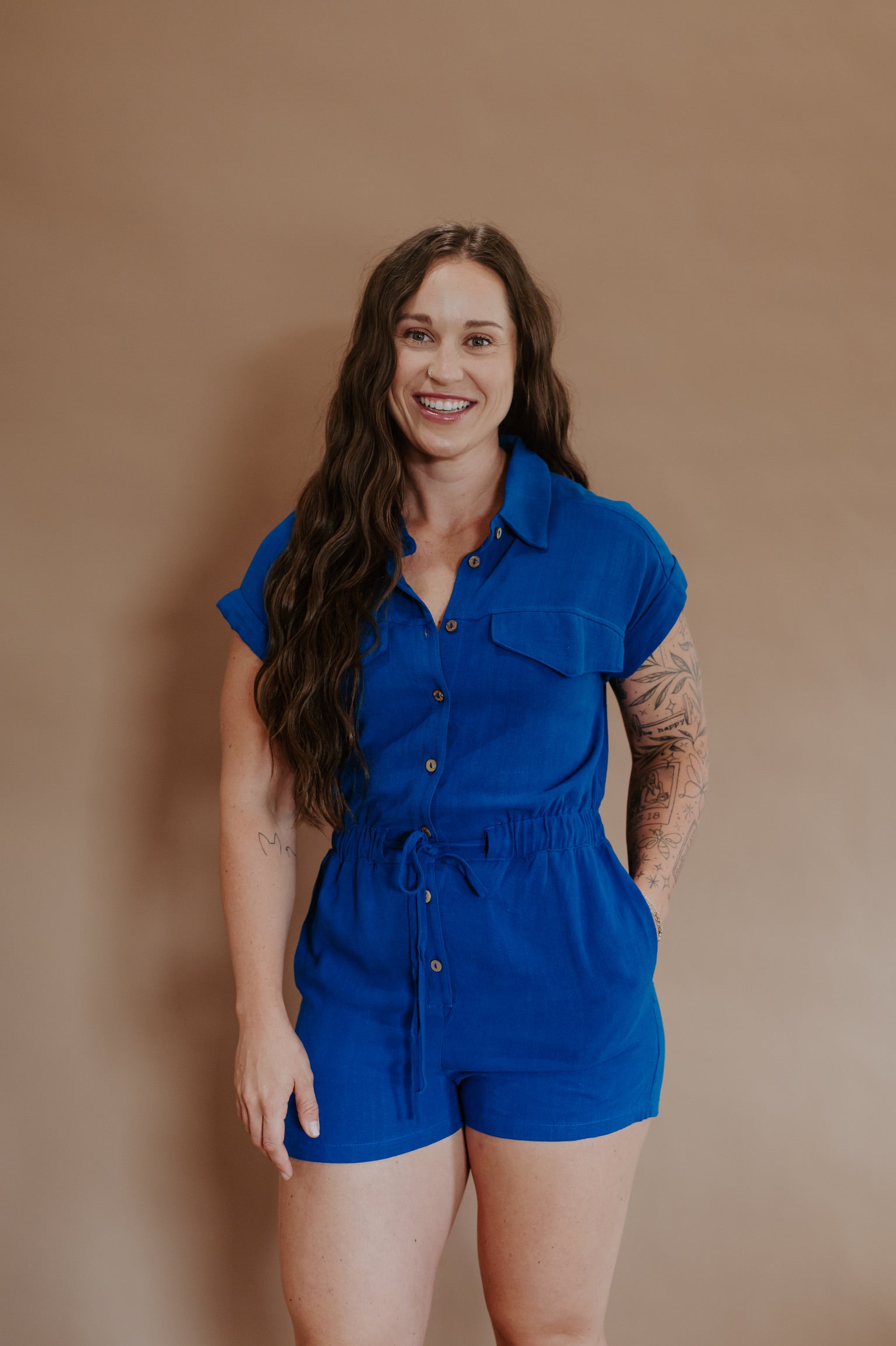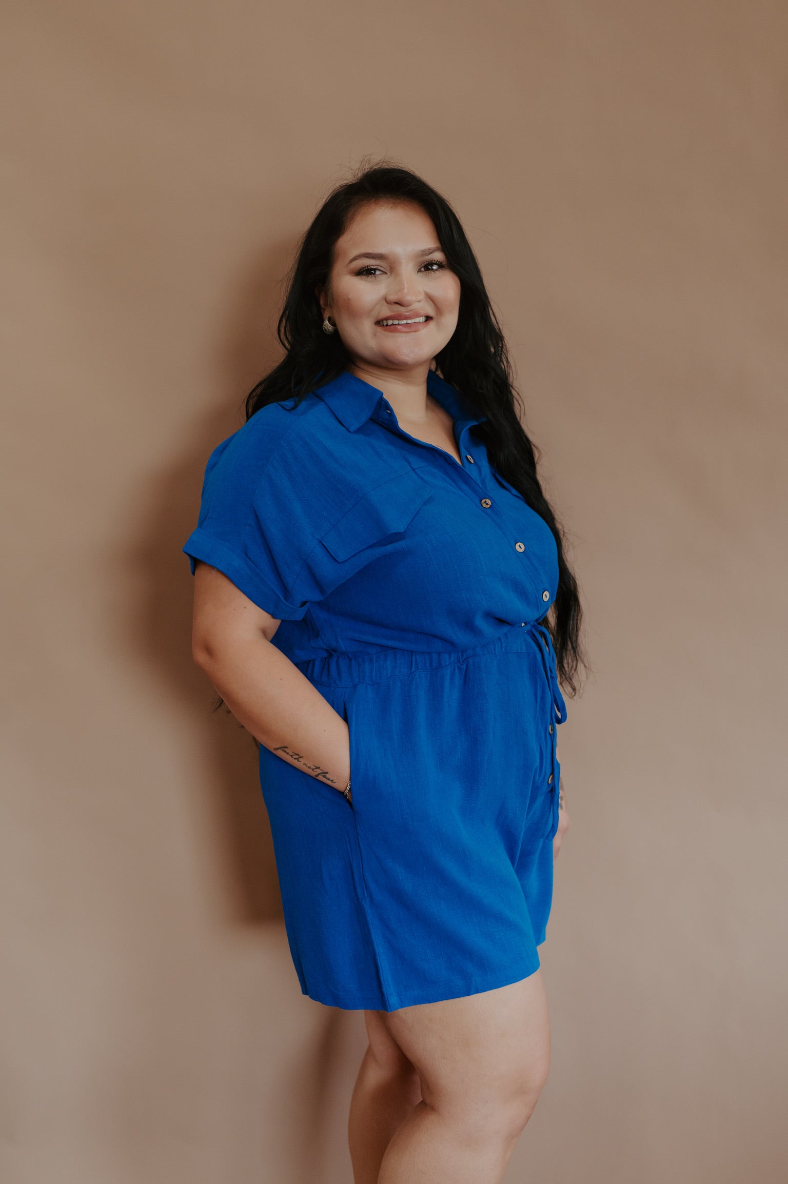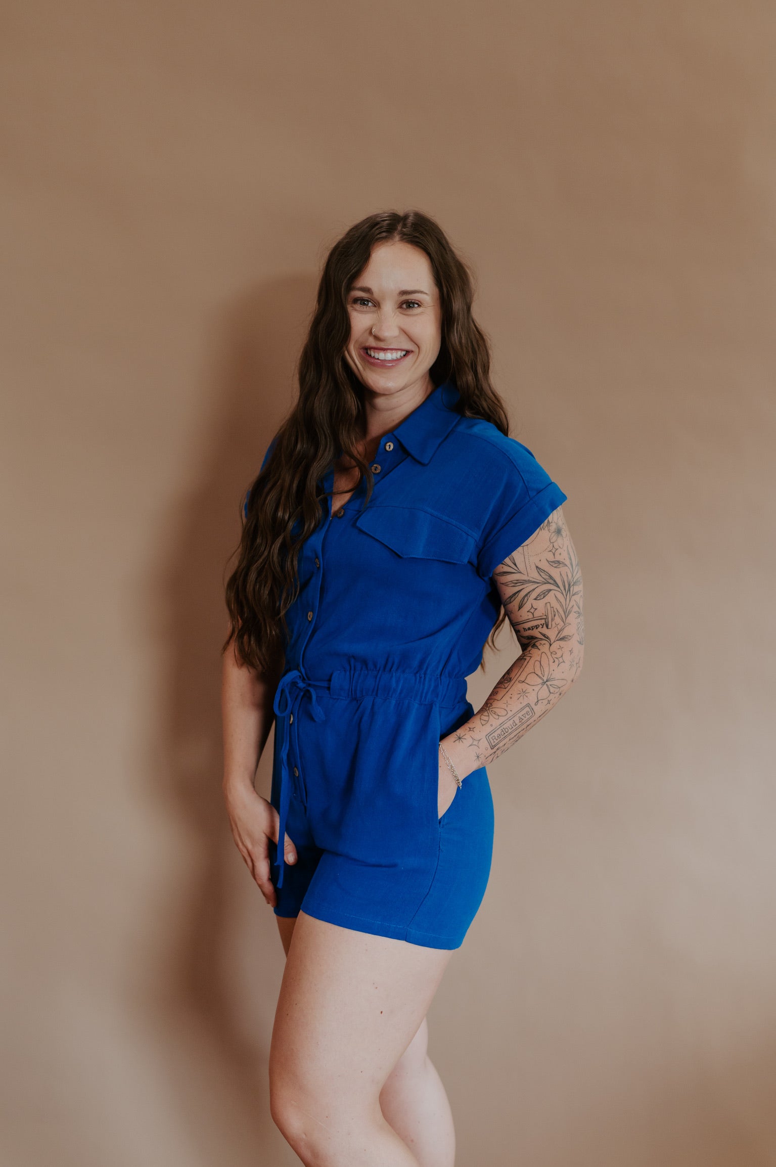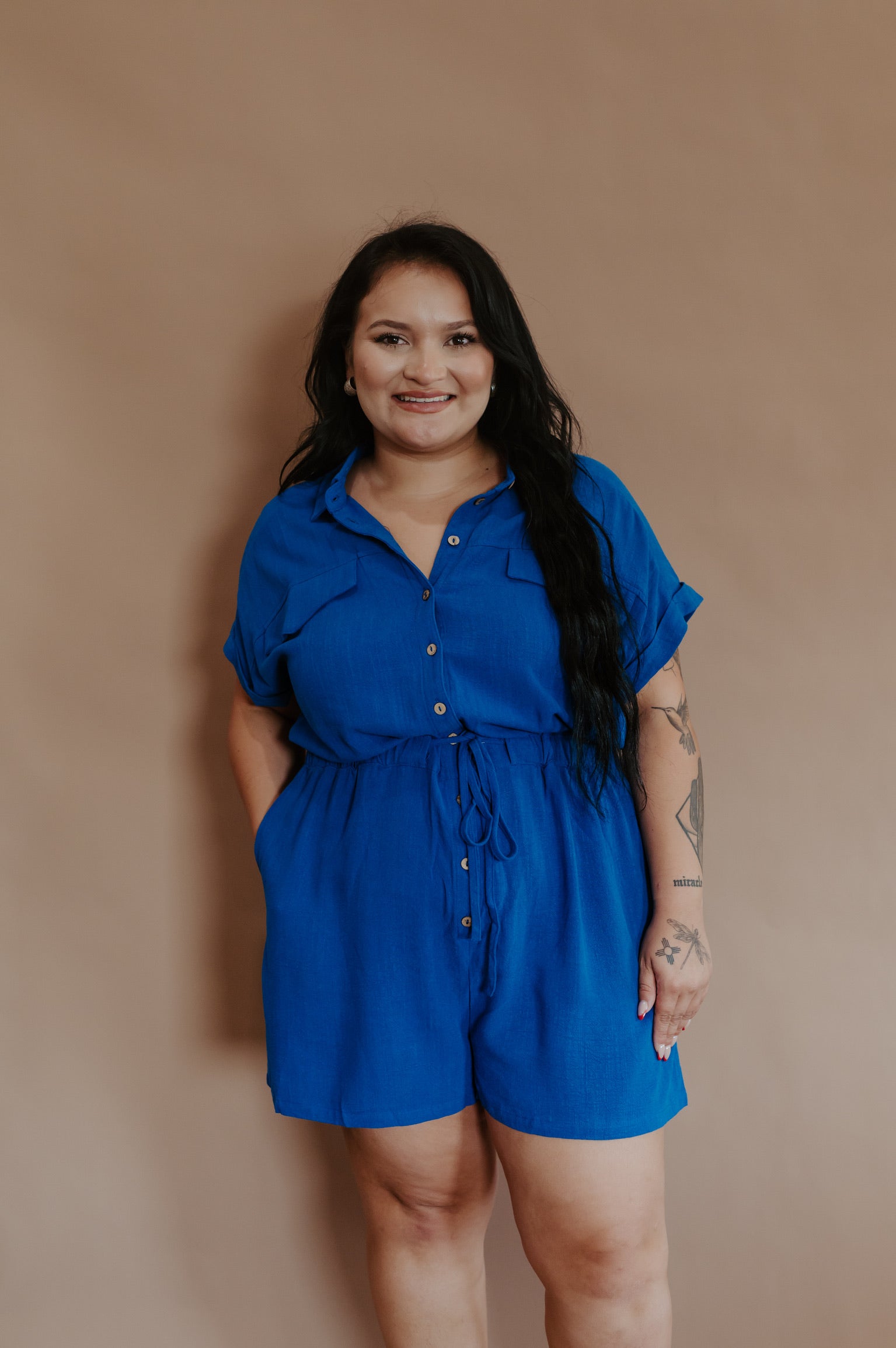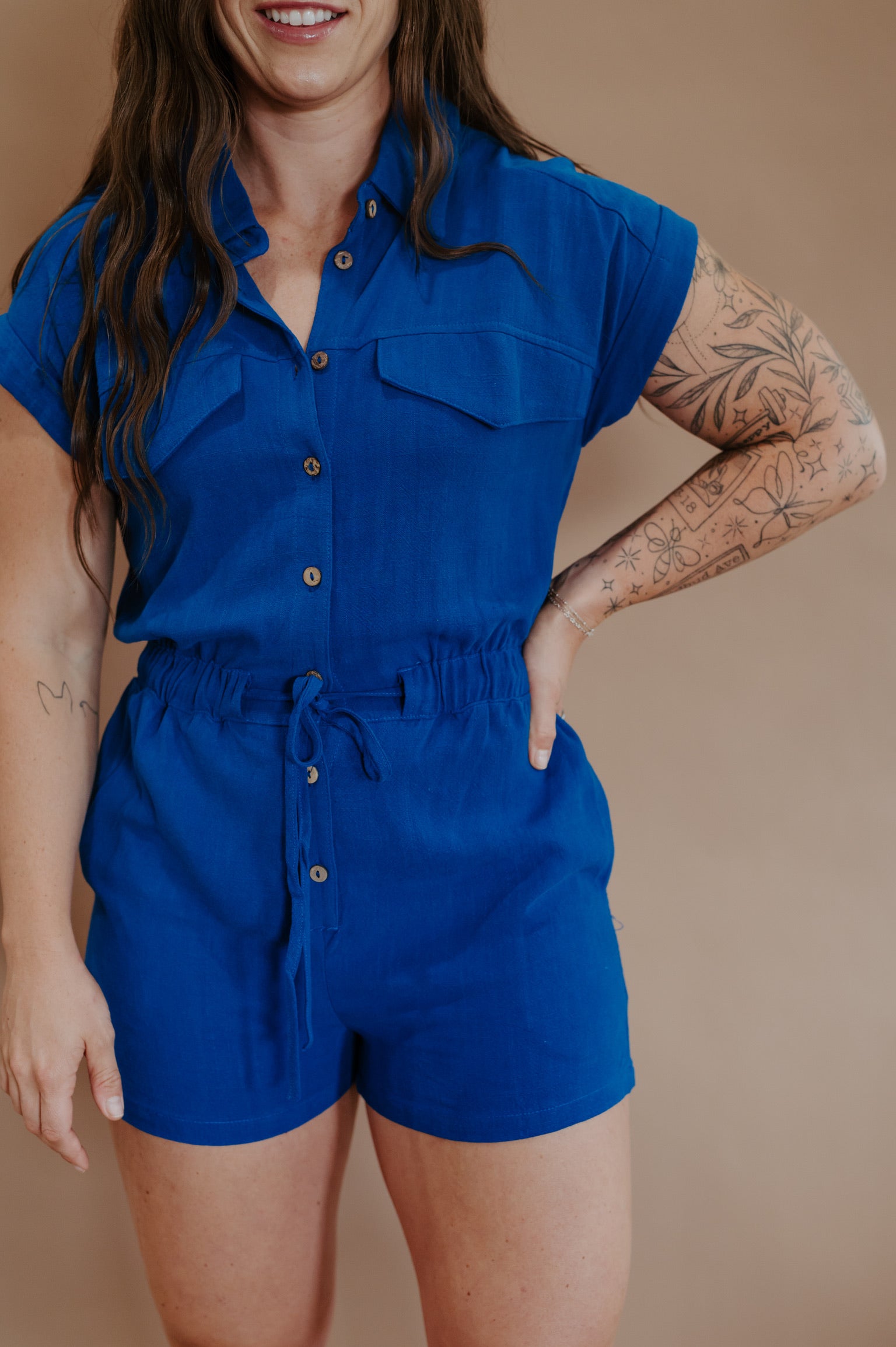 This playful royal blue romper features a charming button front and a tie waist that lets you customize your fit with ease. Perfect for sunny days or casual outings, it combines comfort and style effortlessly, making it a fun addition to your wardrobe.