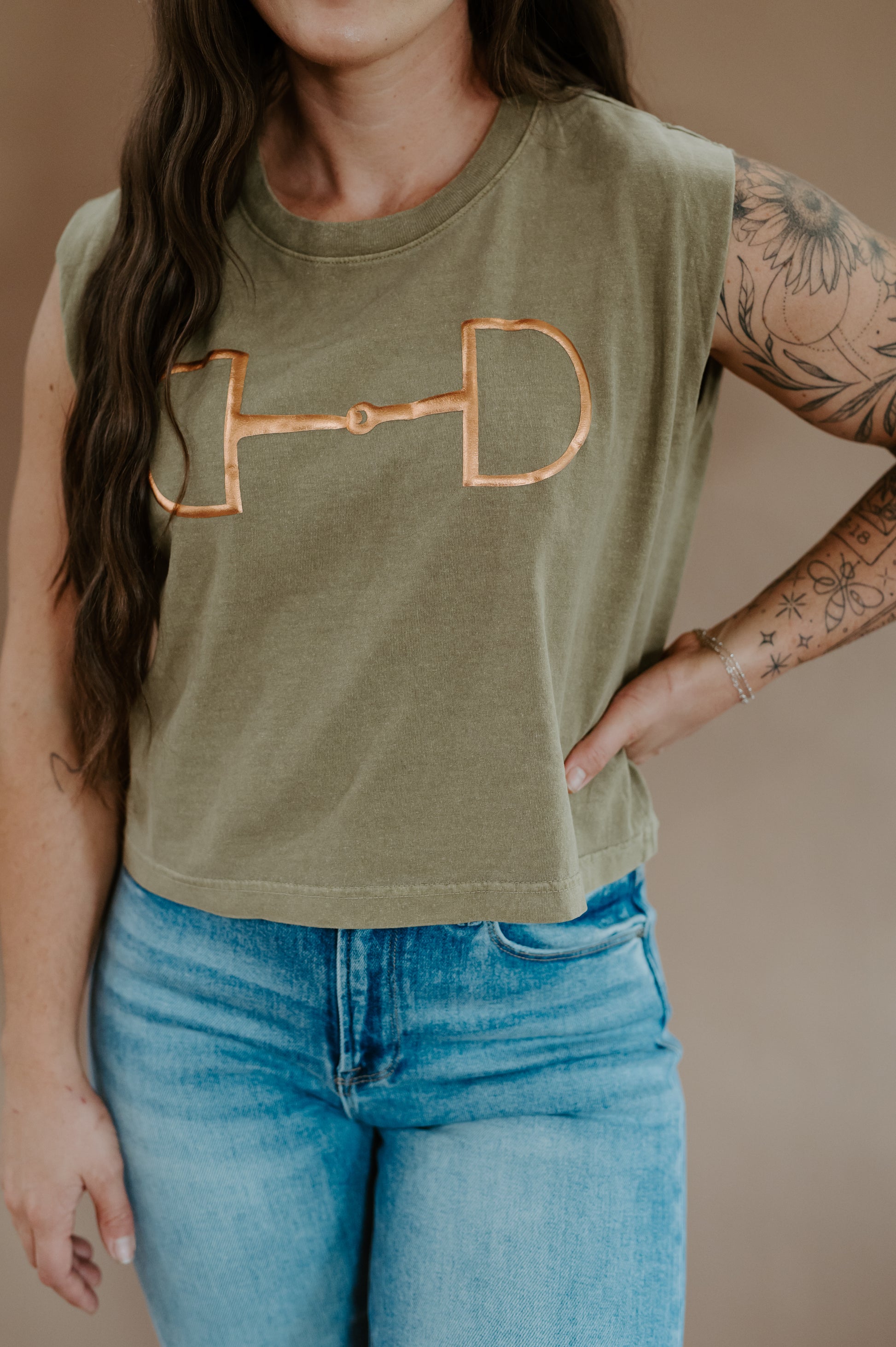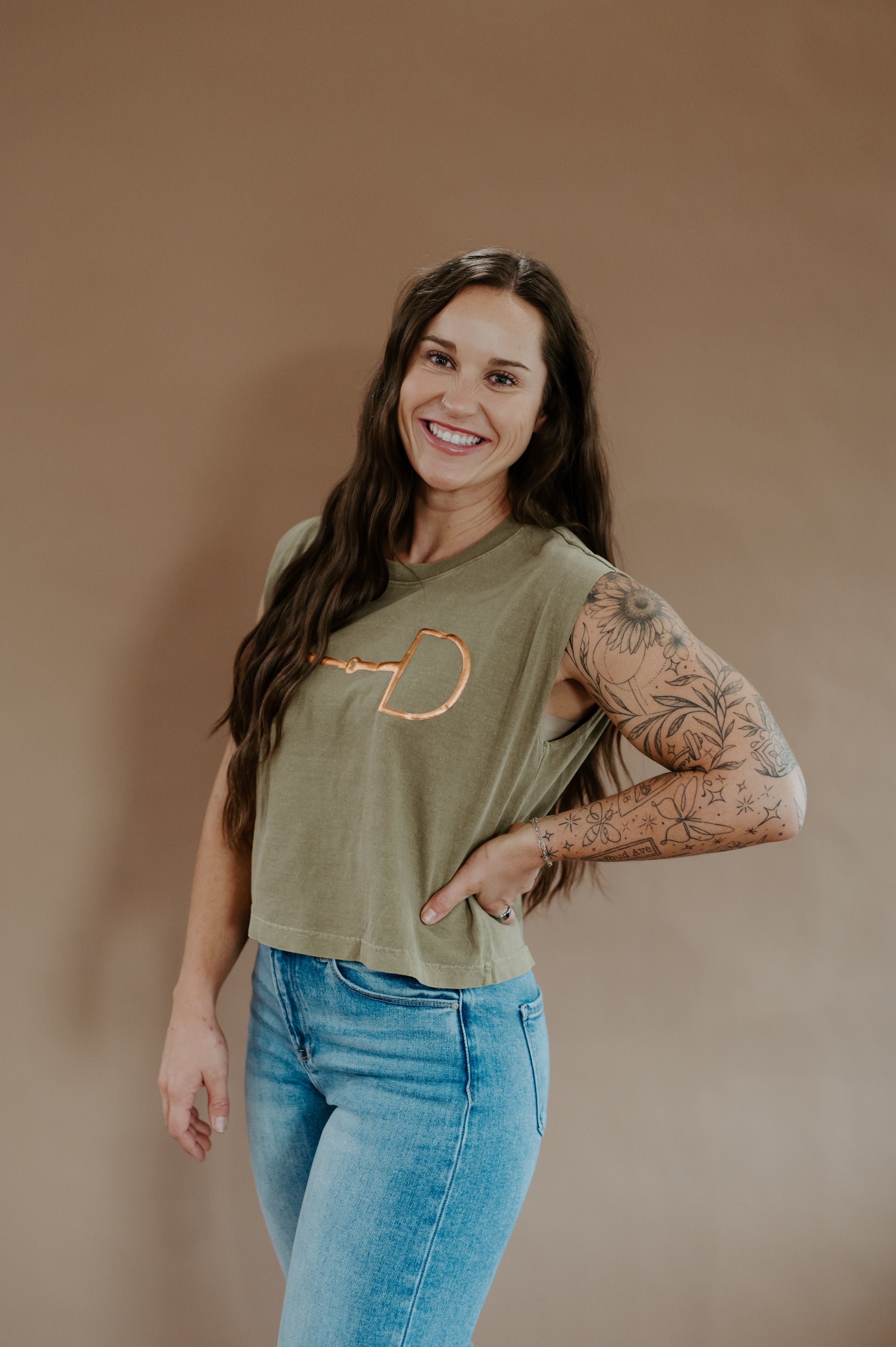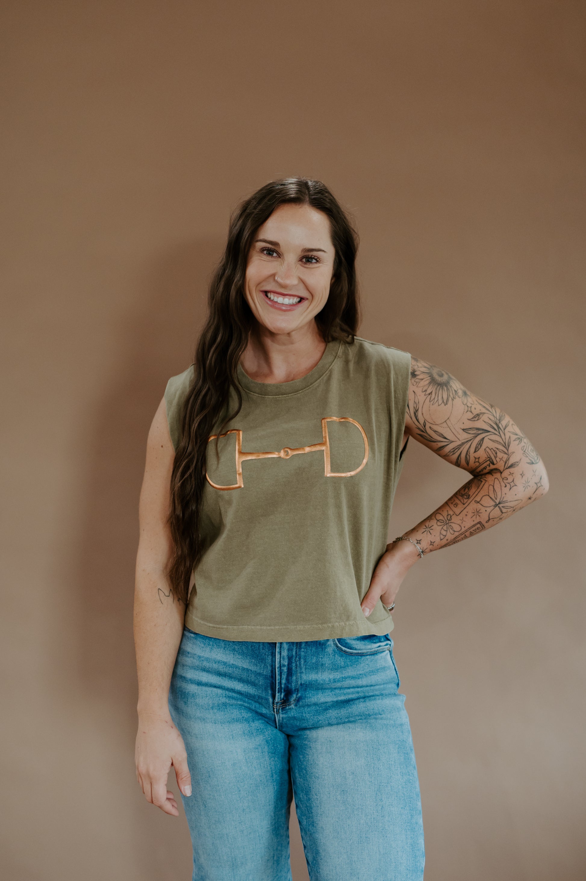 Saddle up in style with our Olive Bit Tee – the perfect blend of western charm and everyday comfort. This soft, olive green muscle tee features a bold copper bit graphic across the front, giving it that subtle equestrian touch while keeping it modern and chic. The relaxed, cropped fit pairs effortlessly with high-rise denim, cutoffs, or even layered under a jacket for rodeo nights.