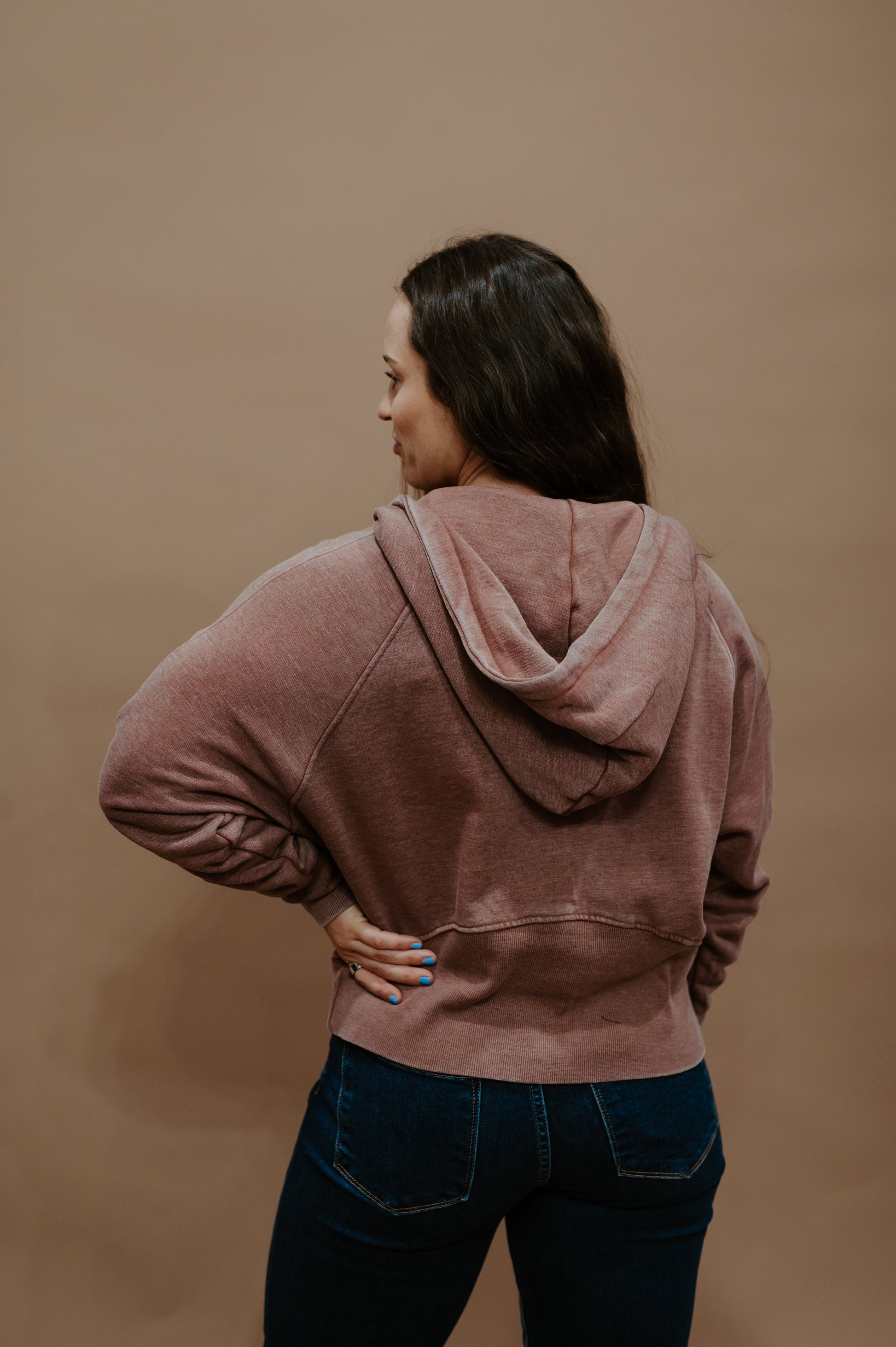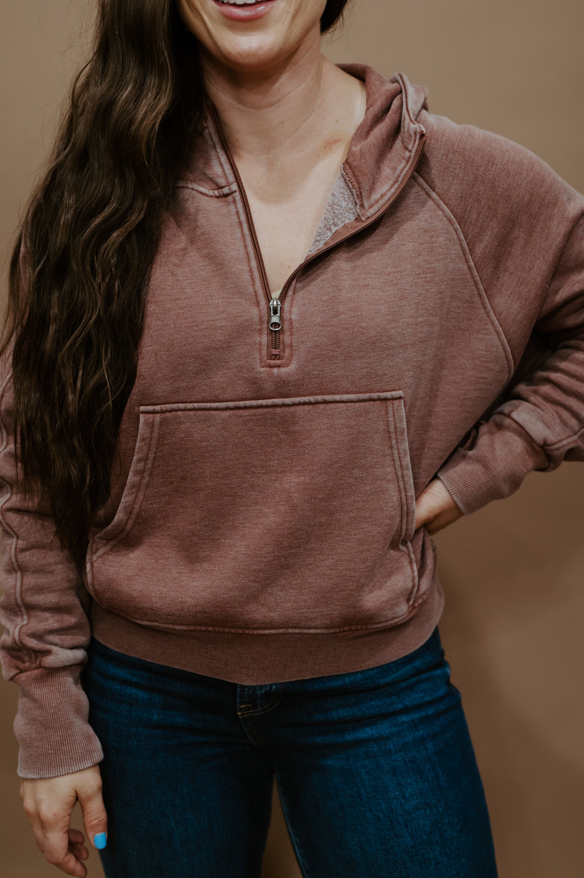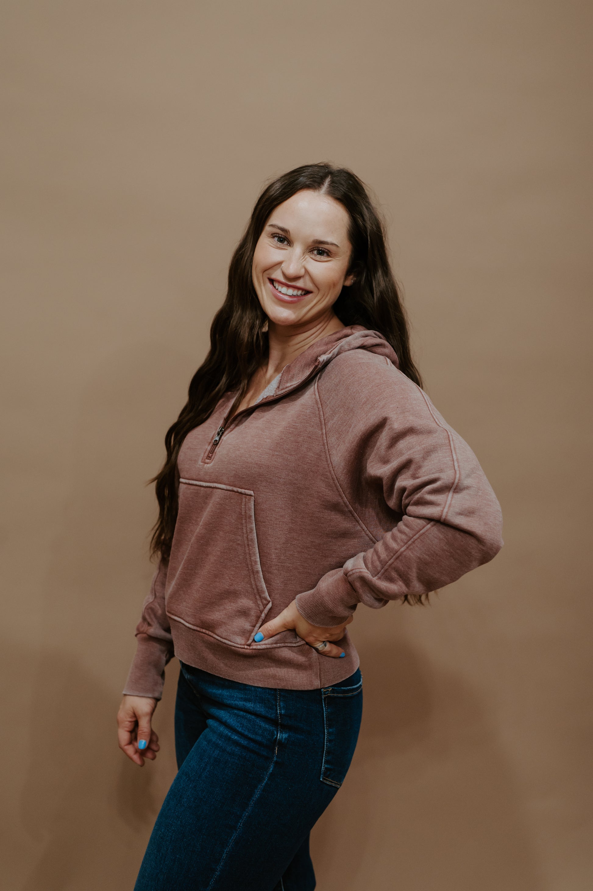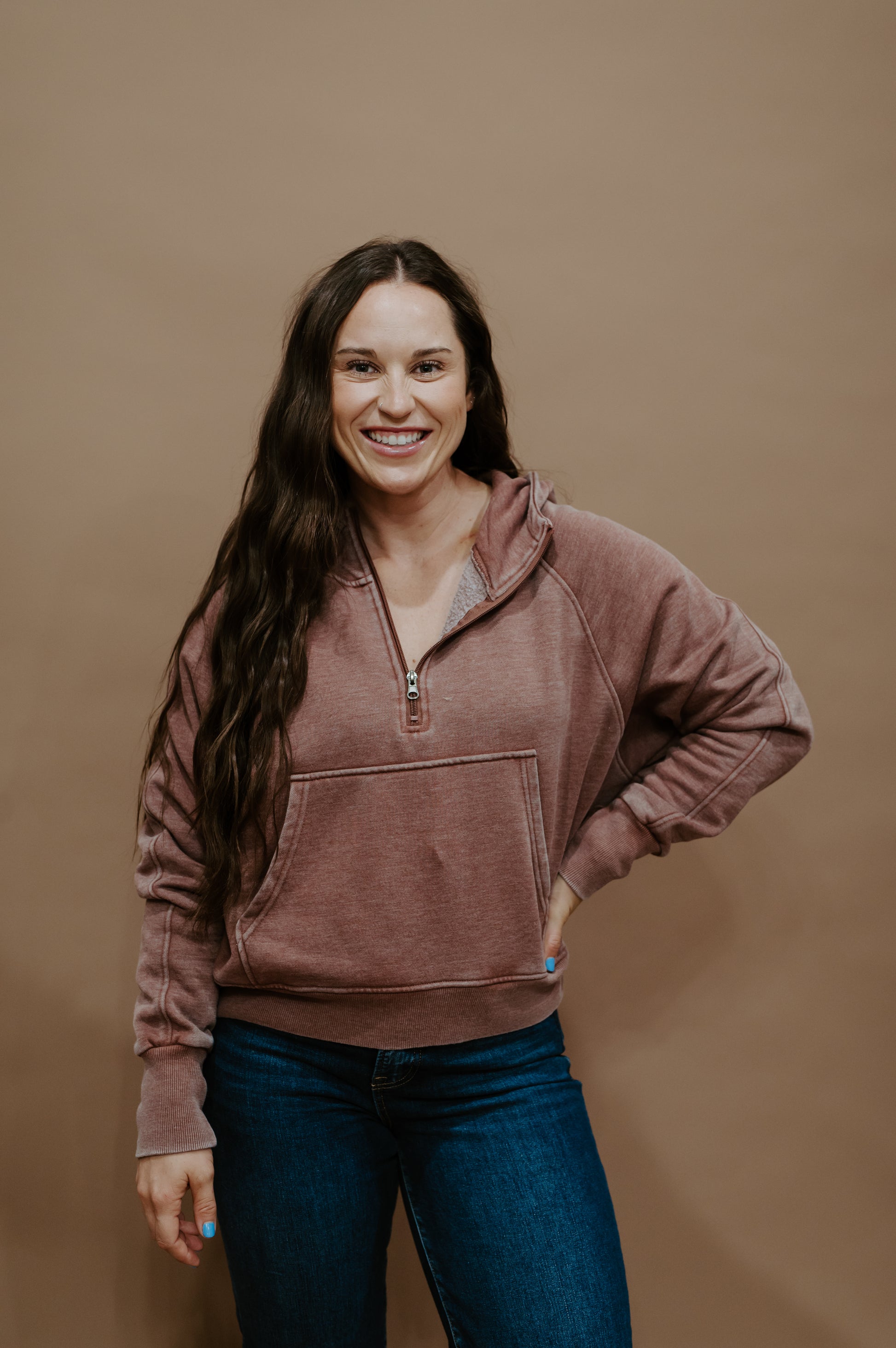 This mauve quarter zip features a soft, lived-in wash, oversized fit, and a roomy kangaroo pocket that keeps it casual yet stylish. Perfect for layering with leggings or denim — whether you’re headed to class, coffee, or just lounging at home.