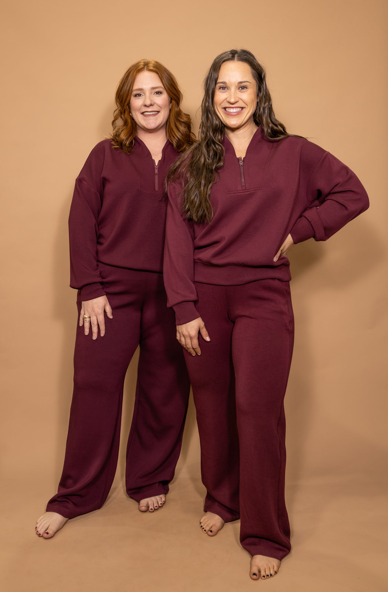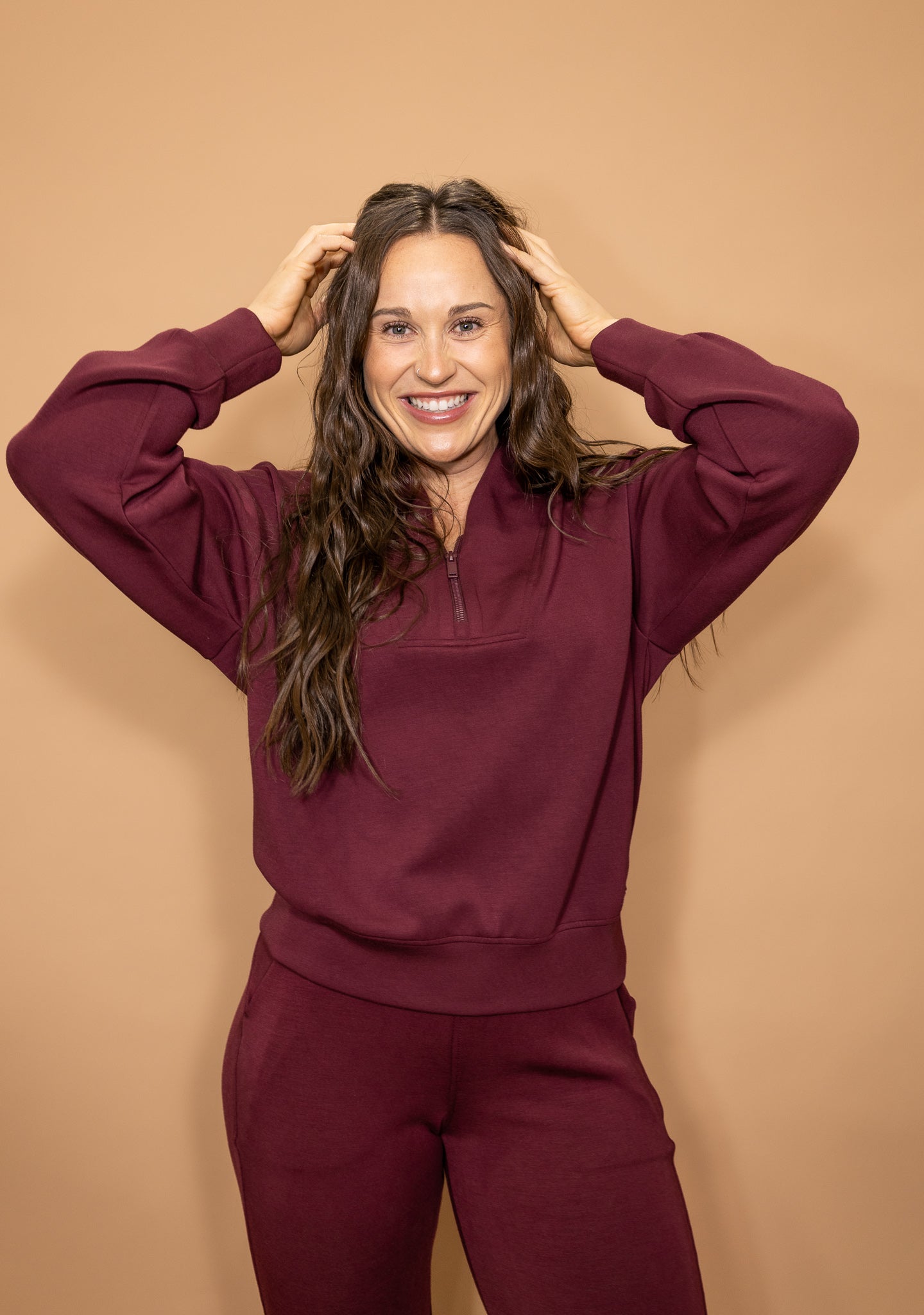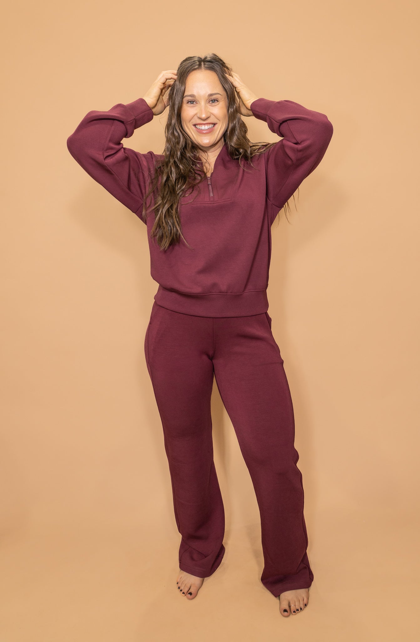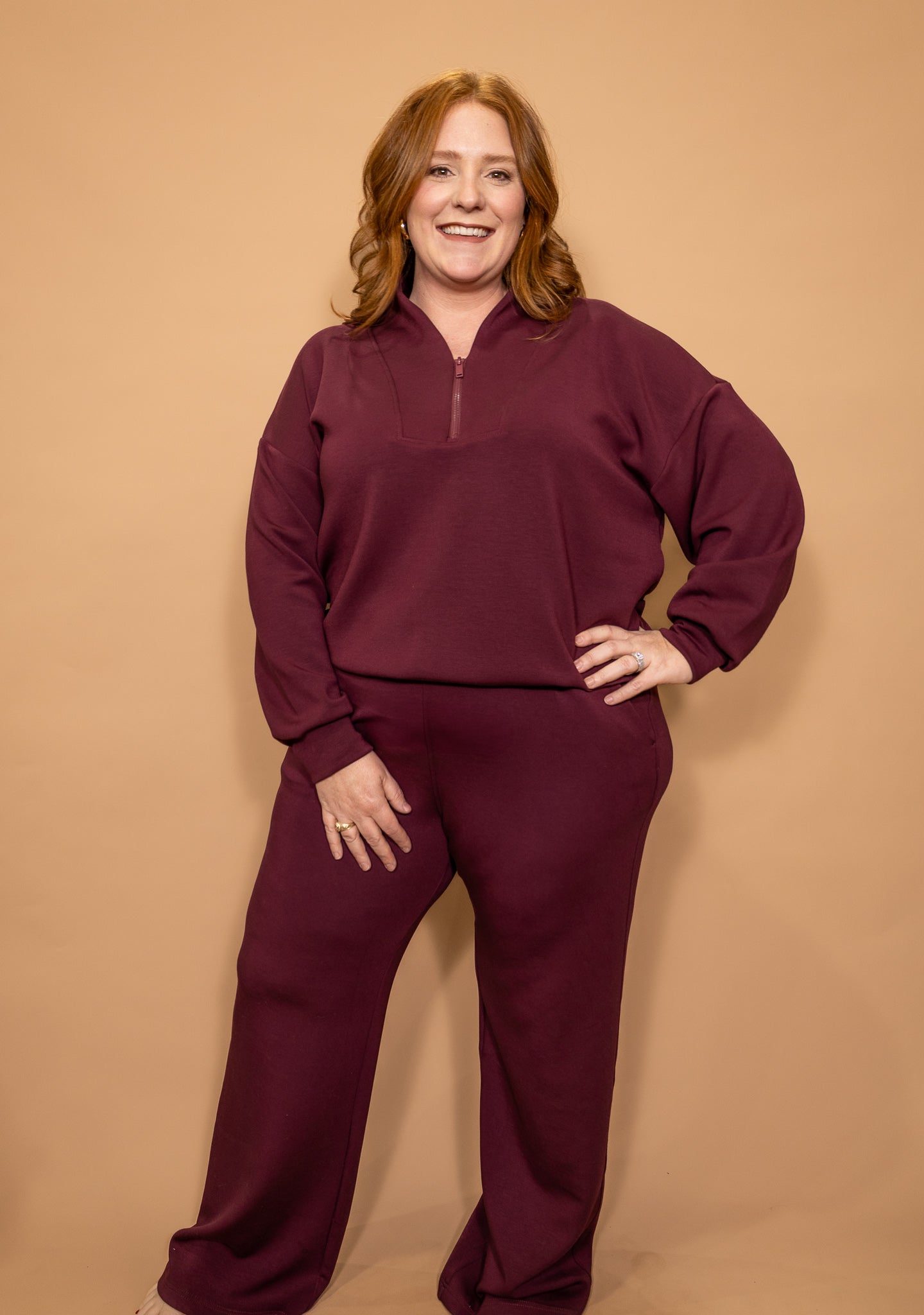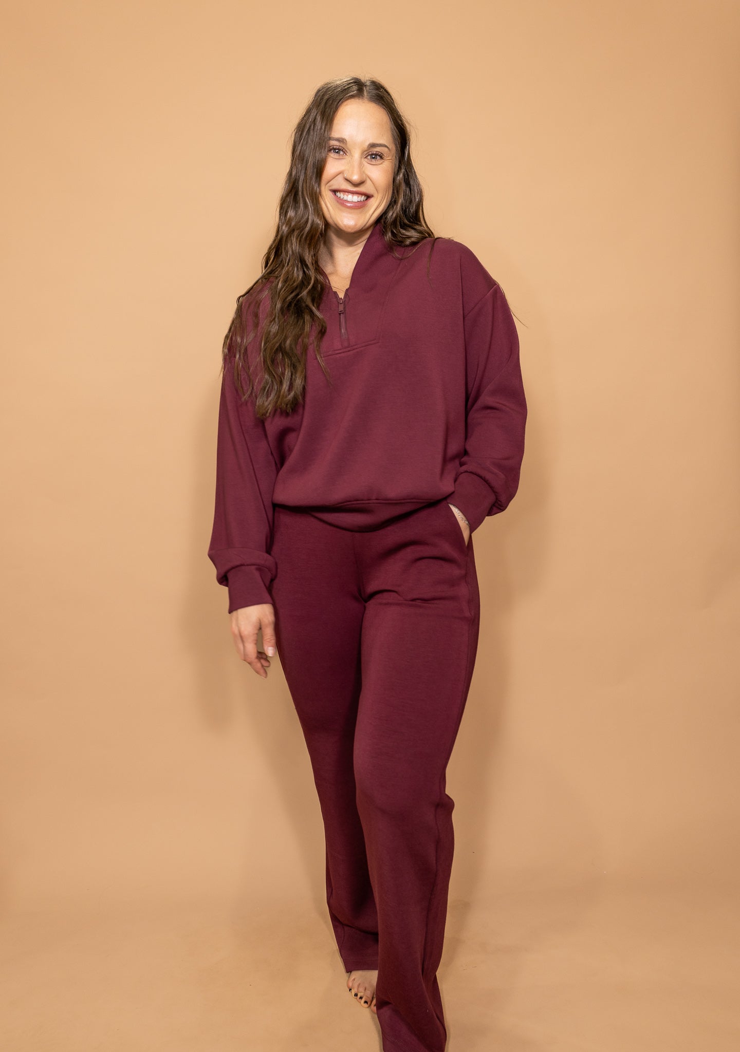 Meet your new go-to cozy set with a polished edge. Bordeaux Babe features a rich wine-colored fabric with a relaxed, flattering fit that feels as good as it looks. The half-zip top adds an elevated touch while keeping things comfy, and the matching pants bring effortless style you can dress up or down. Perfect for running errands, travel days, or lounging in style—this set is equal parts chic and comfortable.