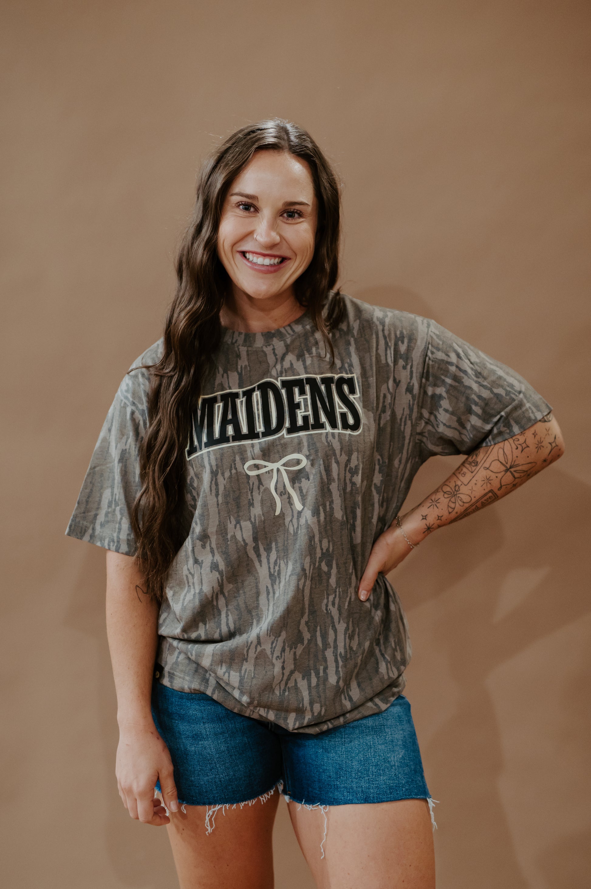 Celebrate your hometown pride with our Camo “Maidens” Tee! Made with bottomland mossy oak fabric, this tshirt is perfect for game day. The playful Maidens design on the front adds a fun touch to your outfit. Go ahead, show off your quirky side with this unique tee!