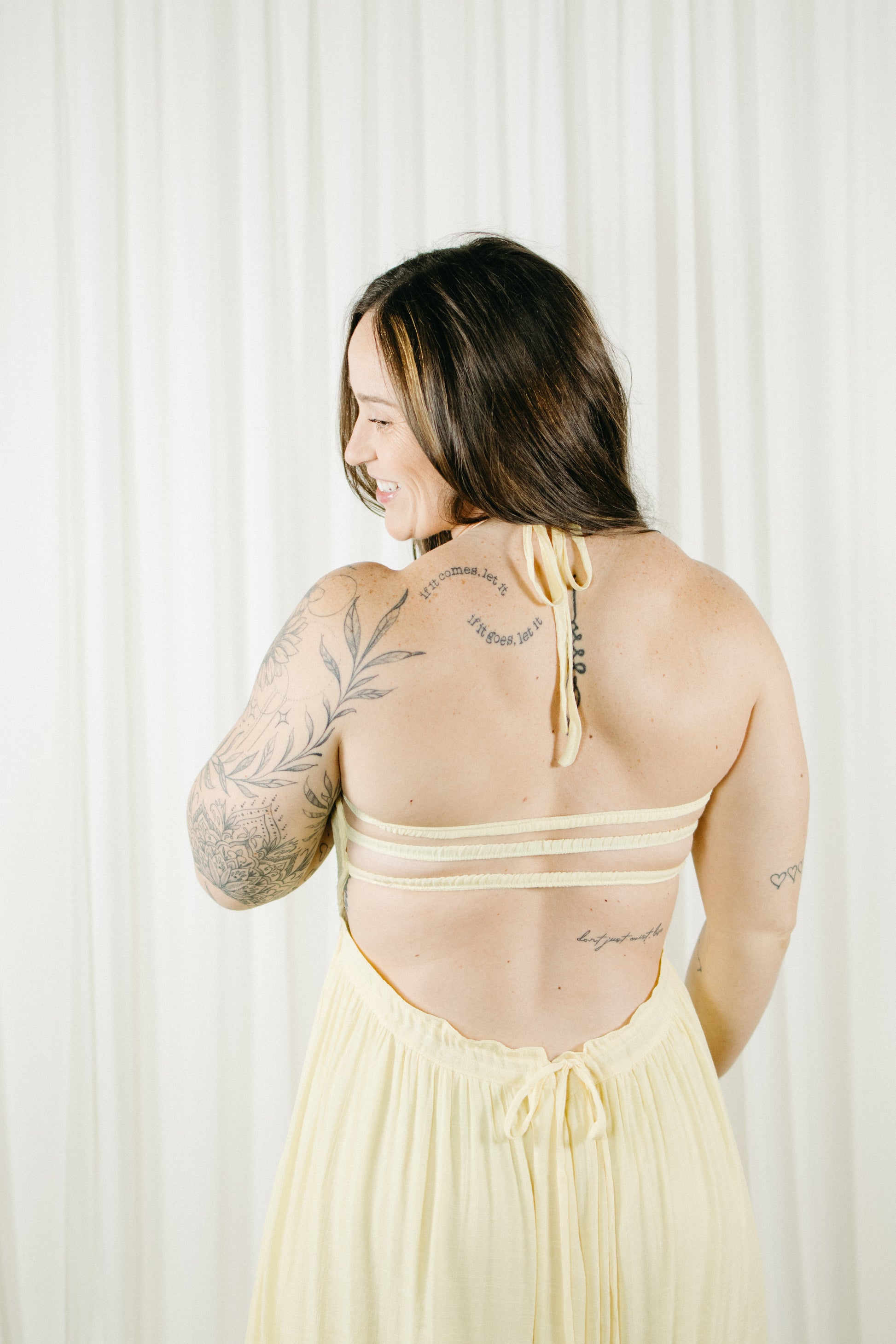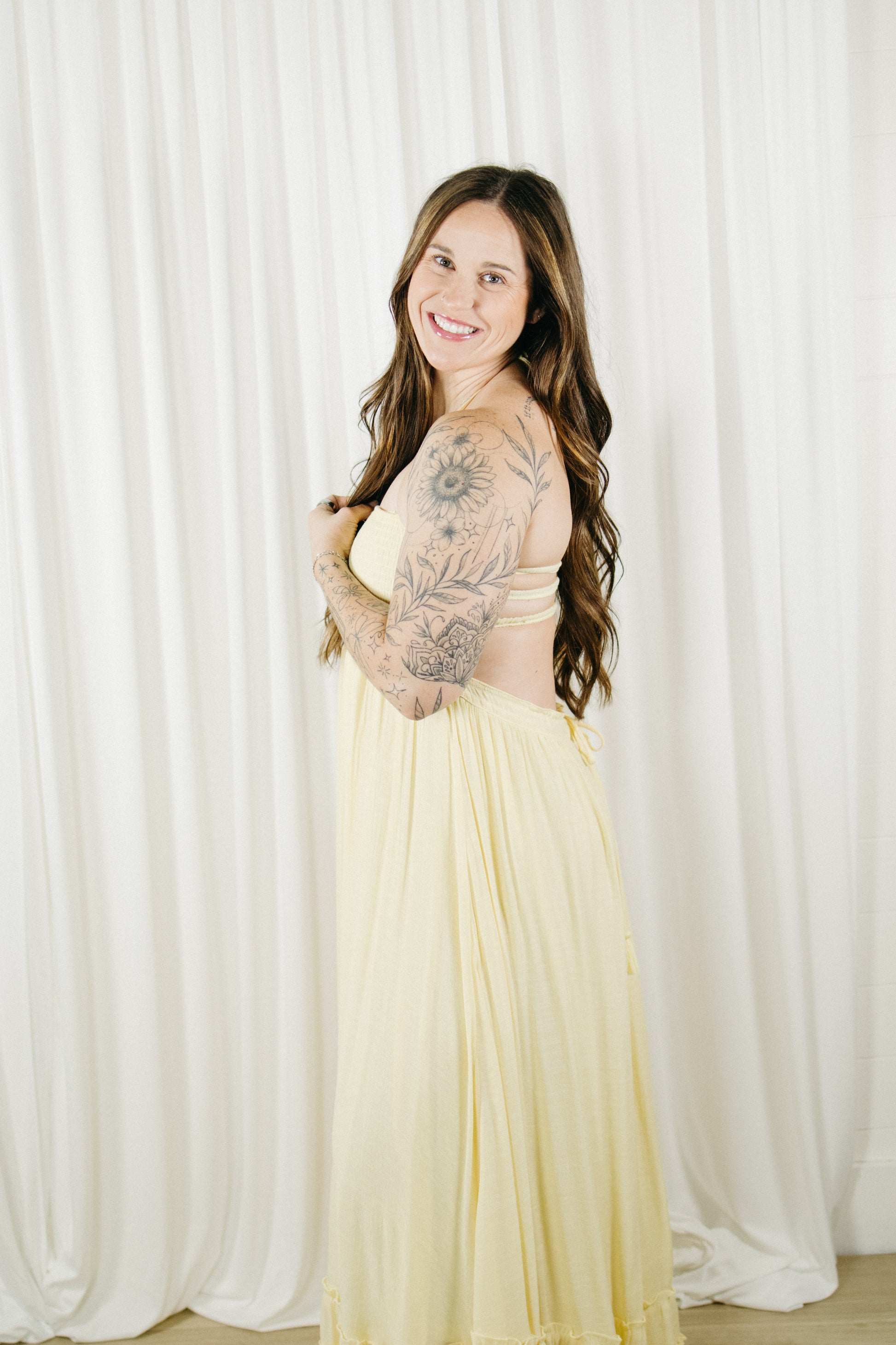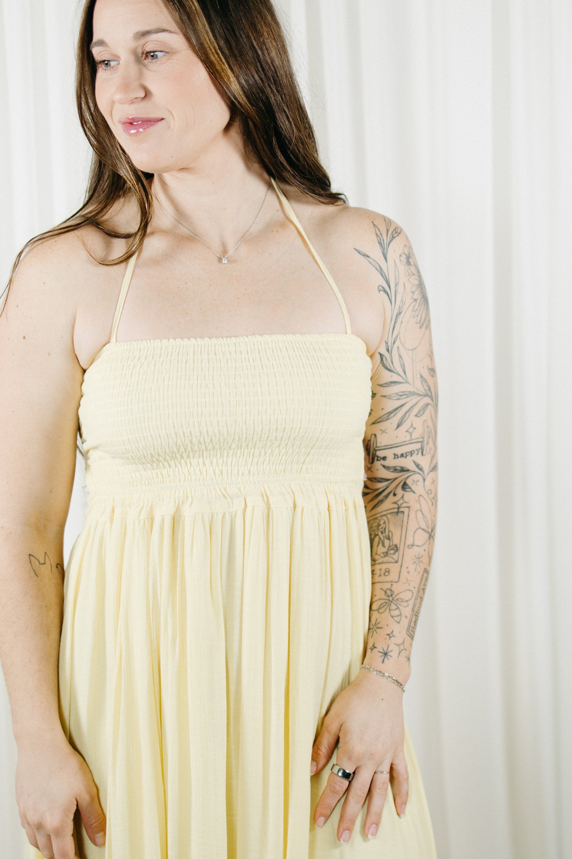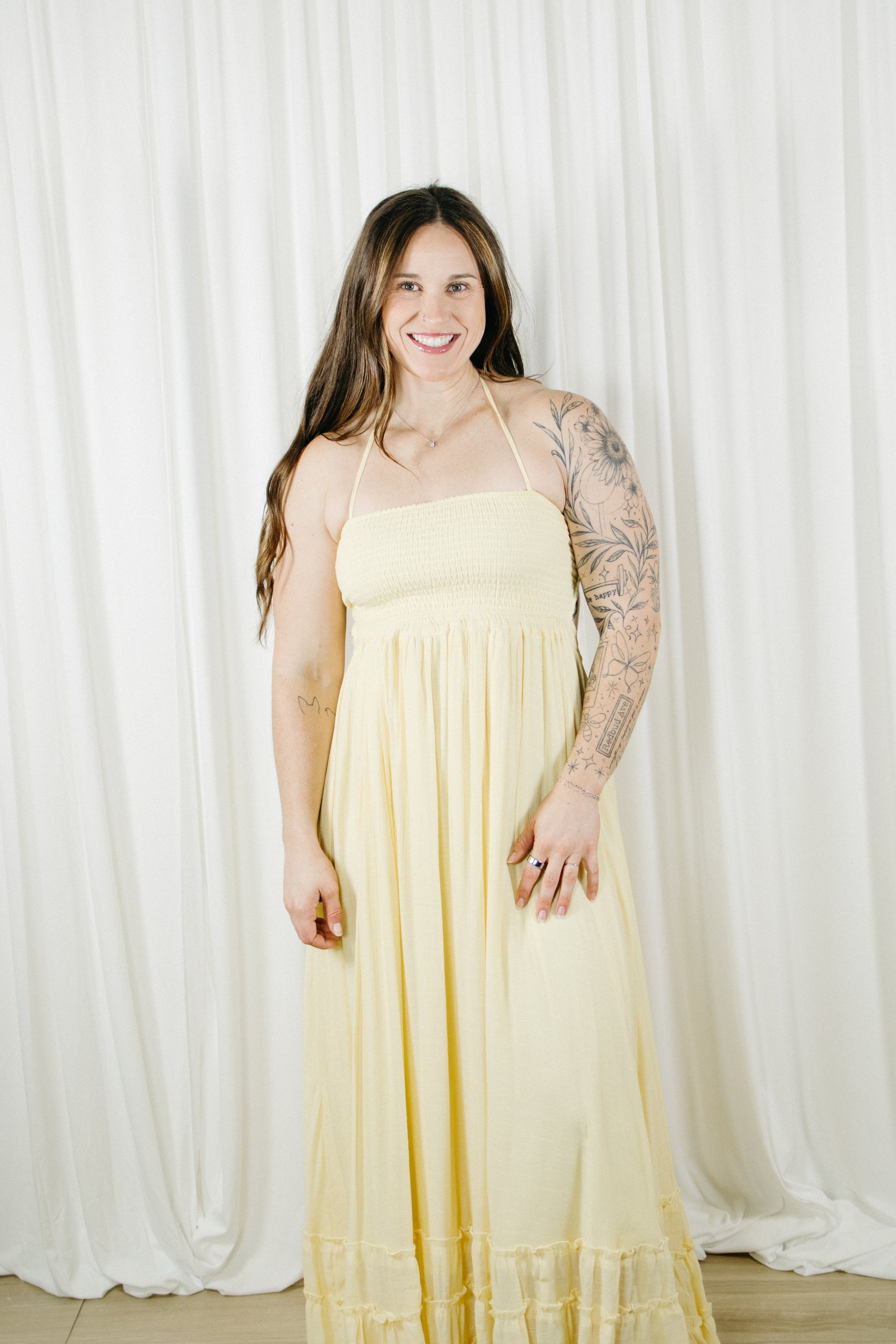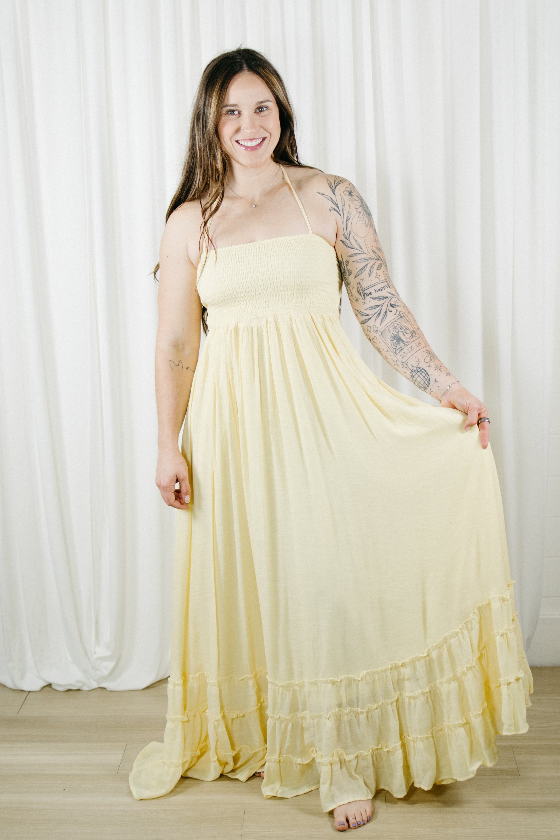 This butter yellow maxi is made to float with you, featuring a smocked bodice for the perfect fit and a flowy skirt with the sweetest ruffle detail. The halter neckline keeps it feminine, while the open back with adjustable ties adds just the right amount of wow.