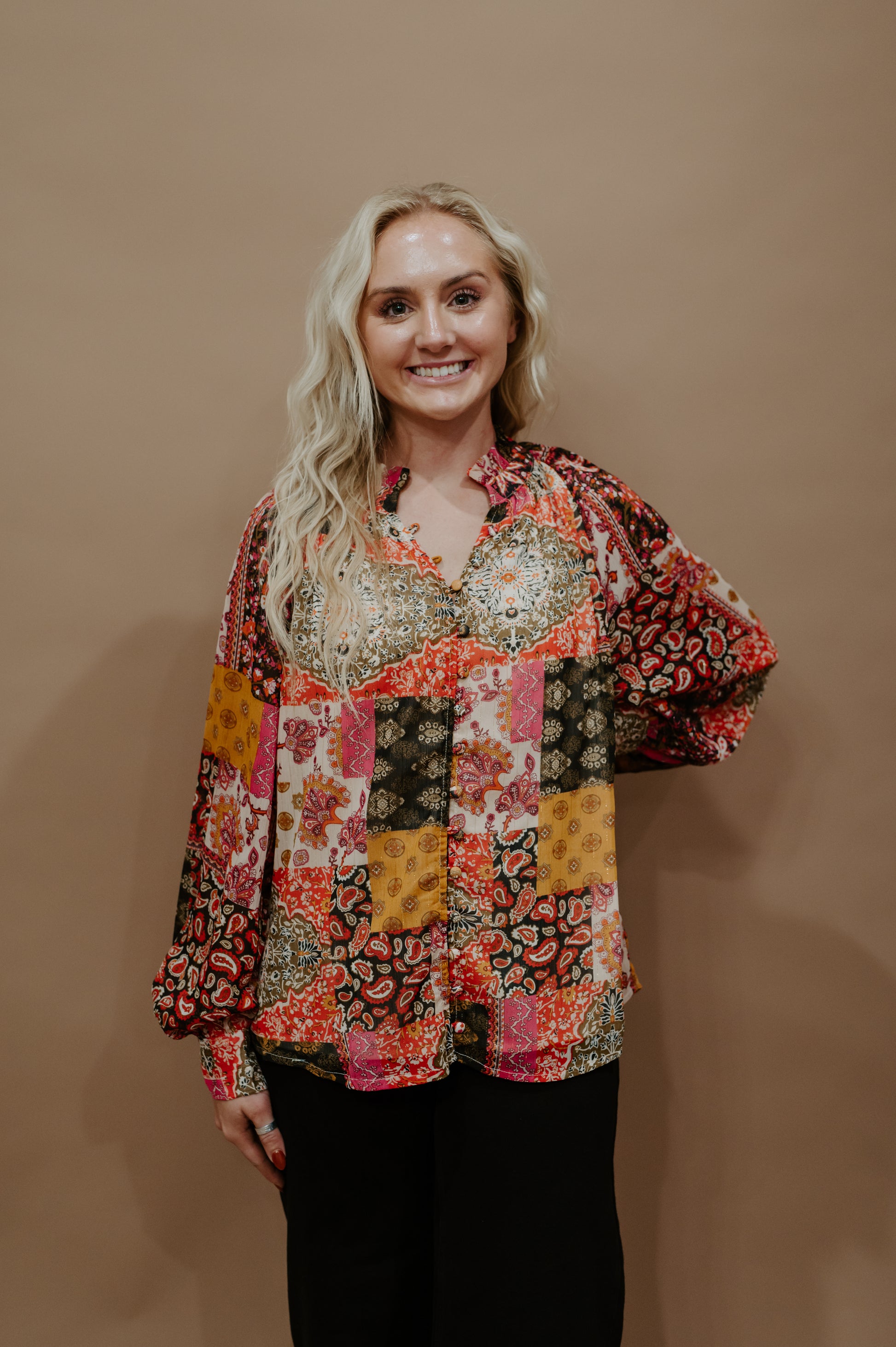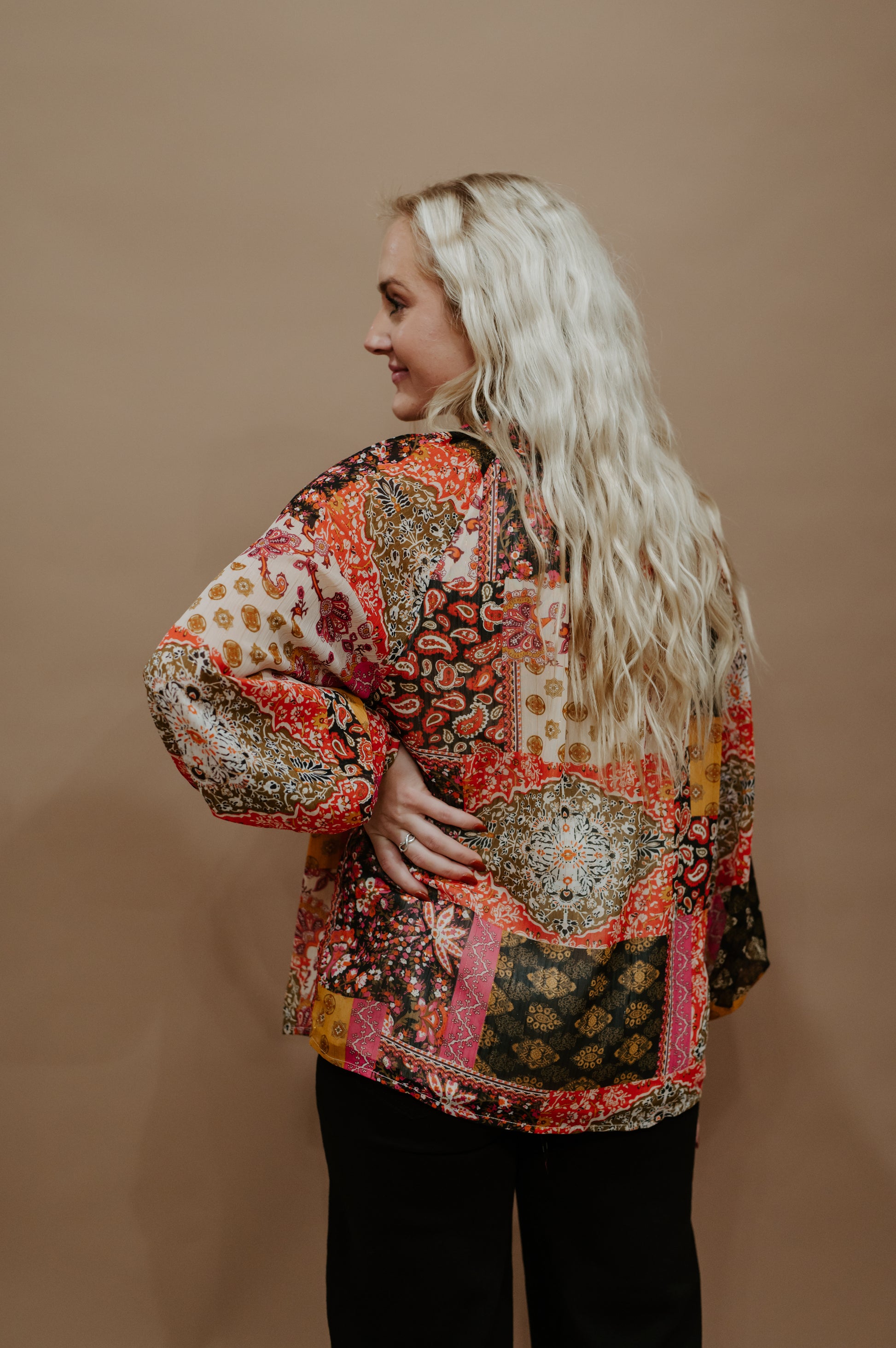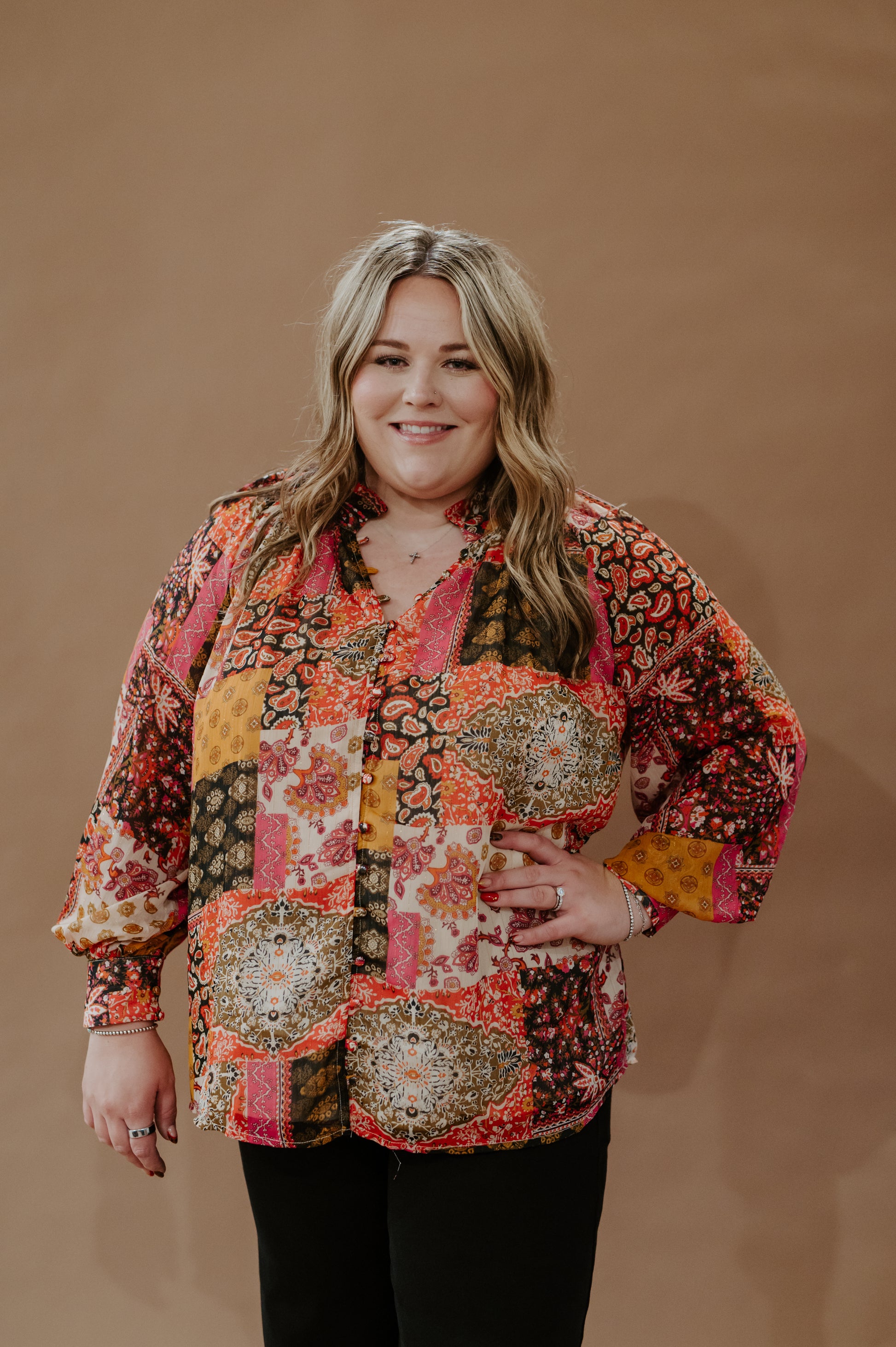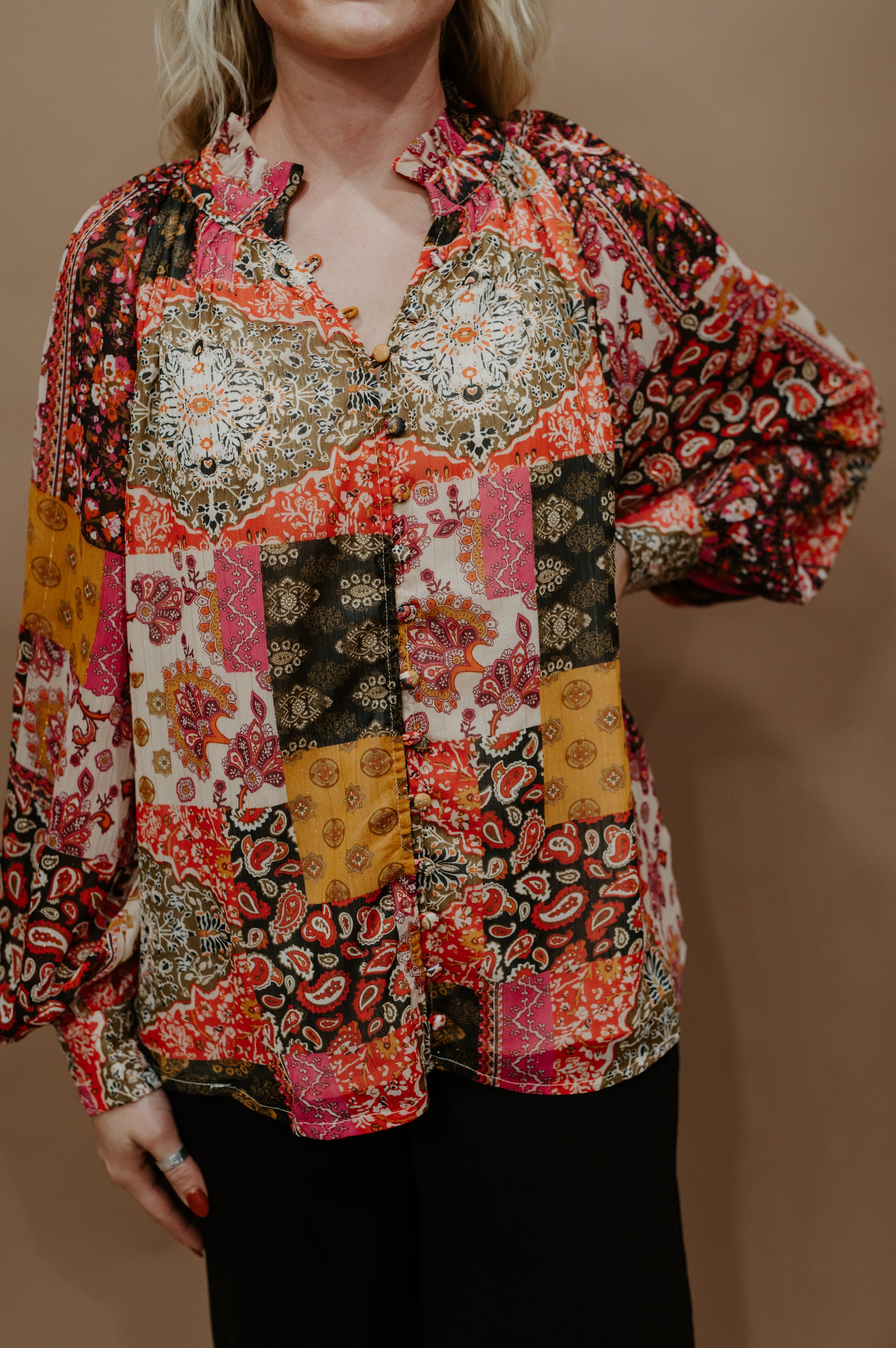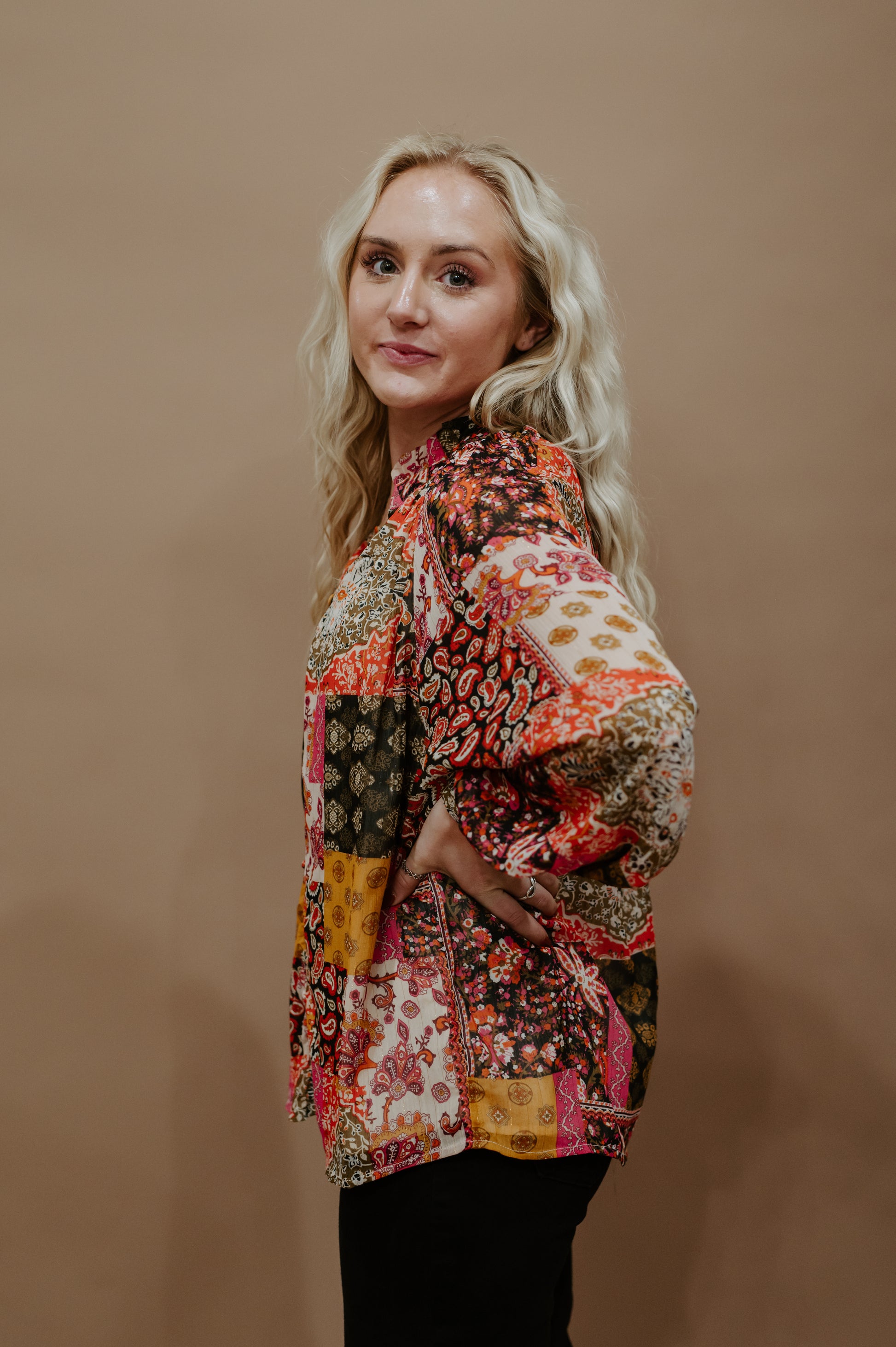 Bold, boho, and full of life – the Desert Bloom Blouse is a statement piece made for standing out. With its vibrant patchwork of paisley and floral prints in warm desert-inspired tones, this button-down top brings effortless personality to any outfit. The relaxed fit and flowy long sleeves keep it comfortable while the striking colors do all the talking.