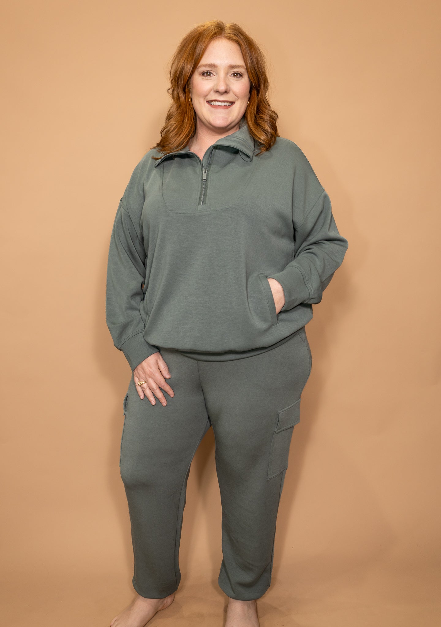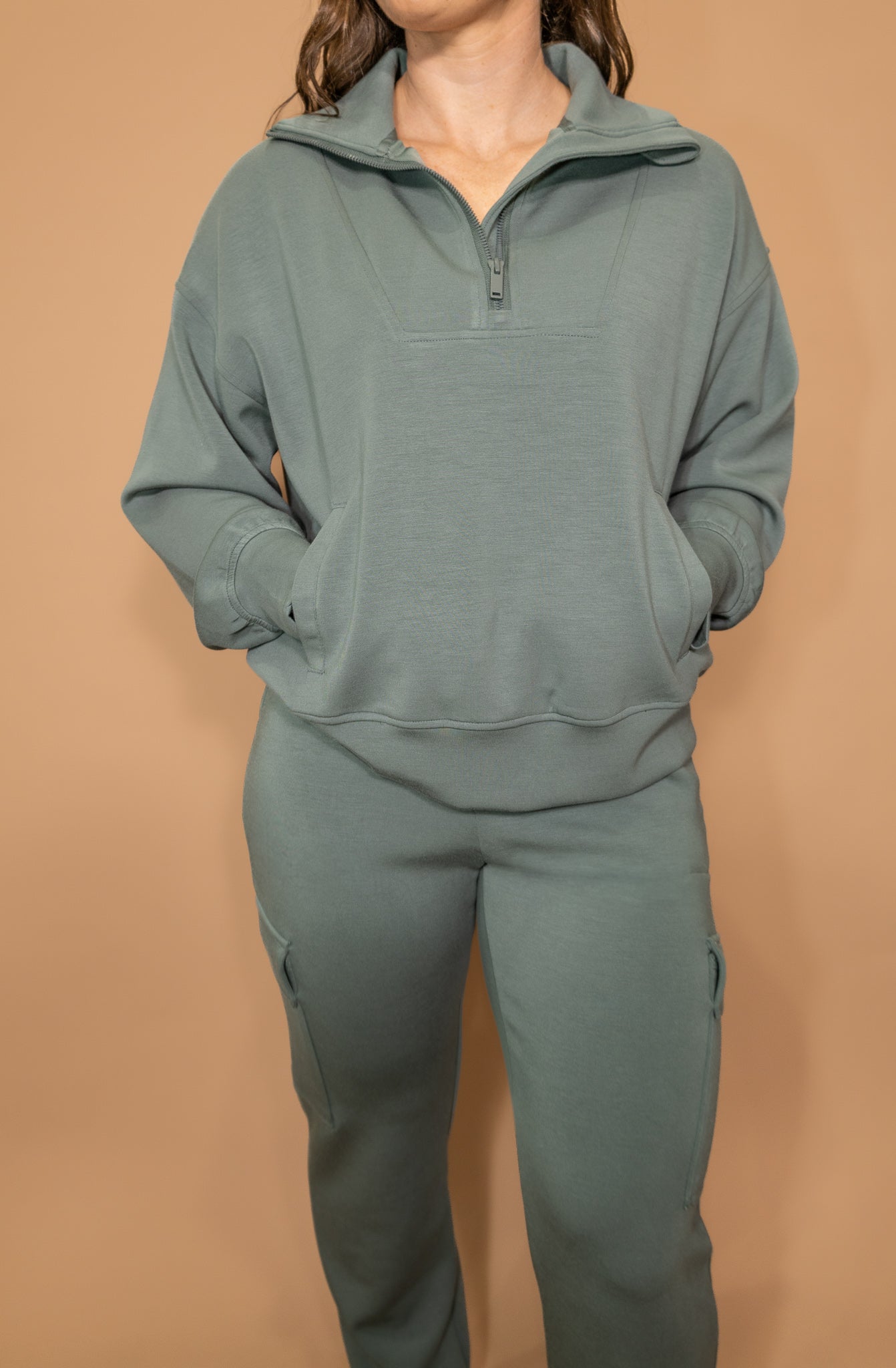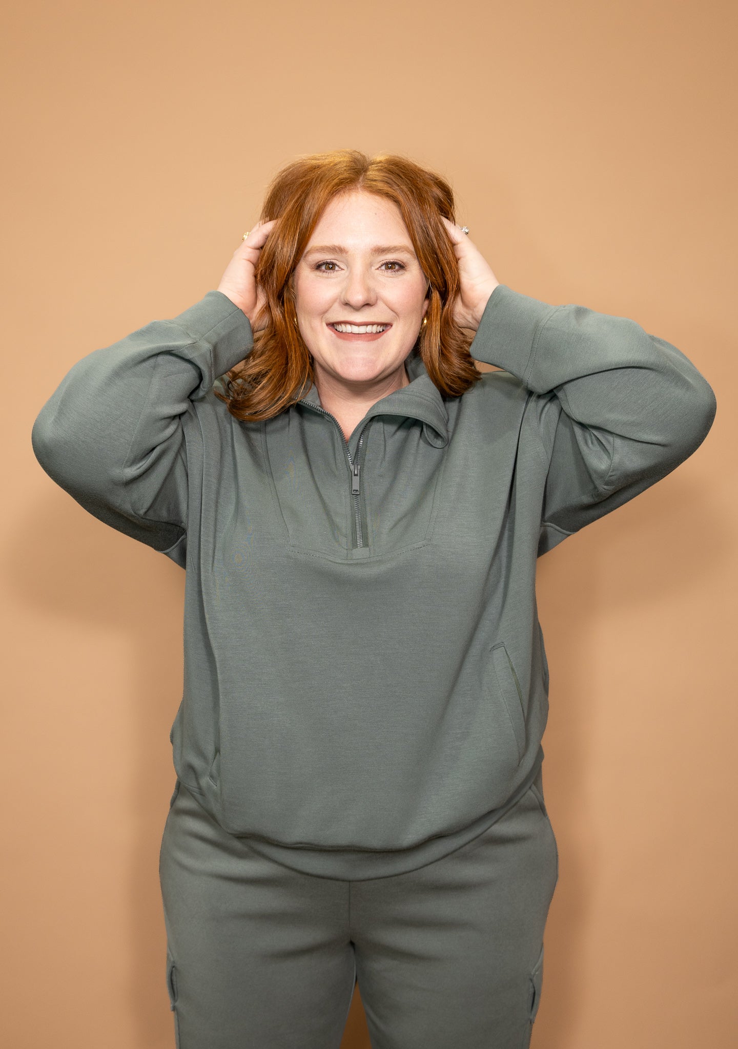 Cozy meets elevated in the Green Glow Set—your new go-to for effortless comfort with a pulled-together feel. This matching set features a relaxed half-zip pullover with a soft, stretchy feel and a laid-back silhouette, paired with coordinating jogger-style pants for all-day wearability. The muted green tone is flattering and easy to style, making this set perfect for lounging, travel days, or casual outings when you still want to look cute without trying too hard.