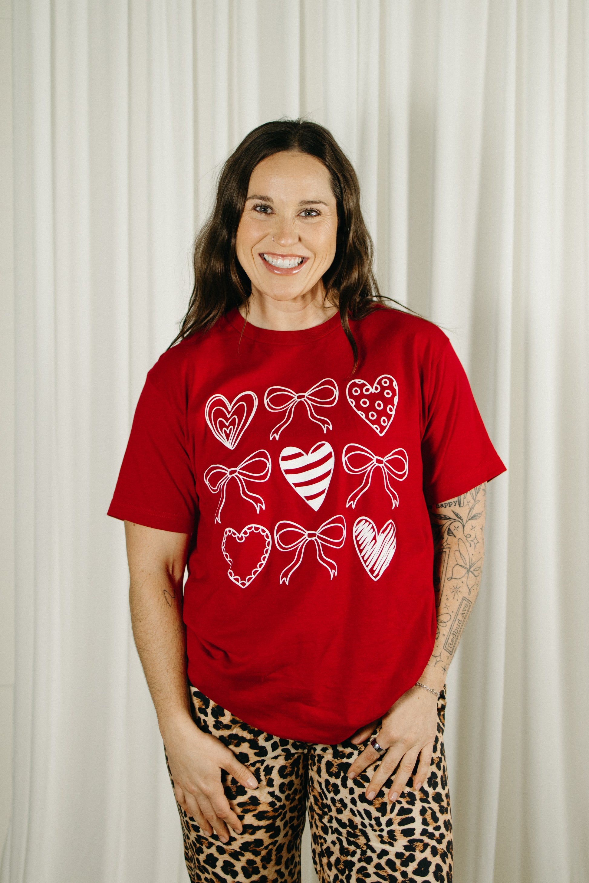 This red graphic tee features a playful mix of hearts and bows for the sweetest statement look. Soft, breathable, and easy to style, it’s the kind of tee you can dress up with denim and boots or keep casual with sneakers for everyday wear. The bold red base paired with crisp white detailing makes it perfect for Valentine’s season—but cute enough to wear year-round.
