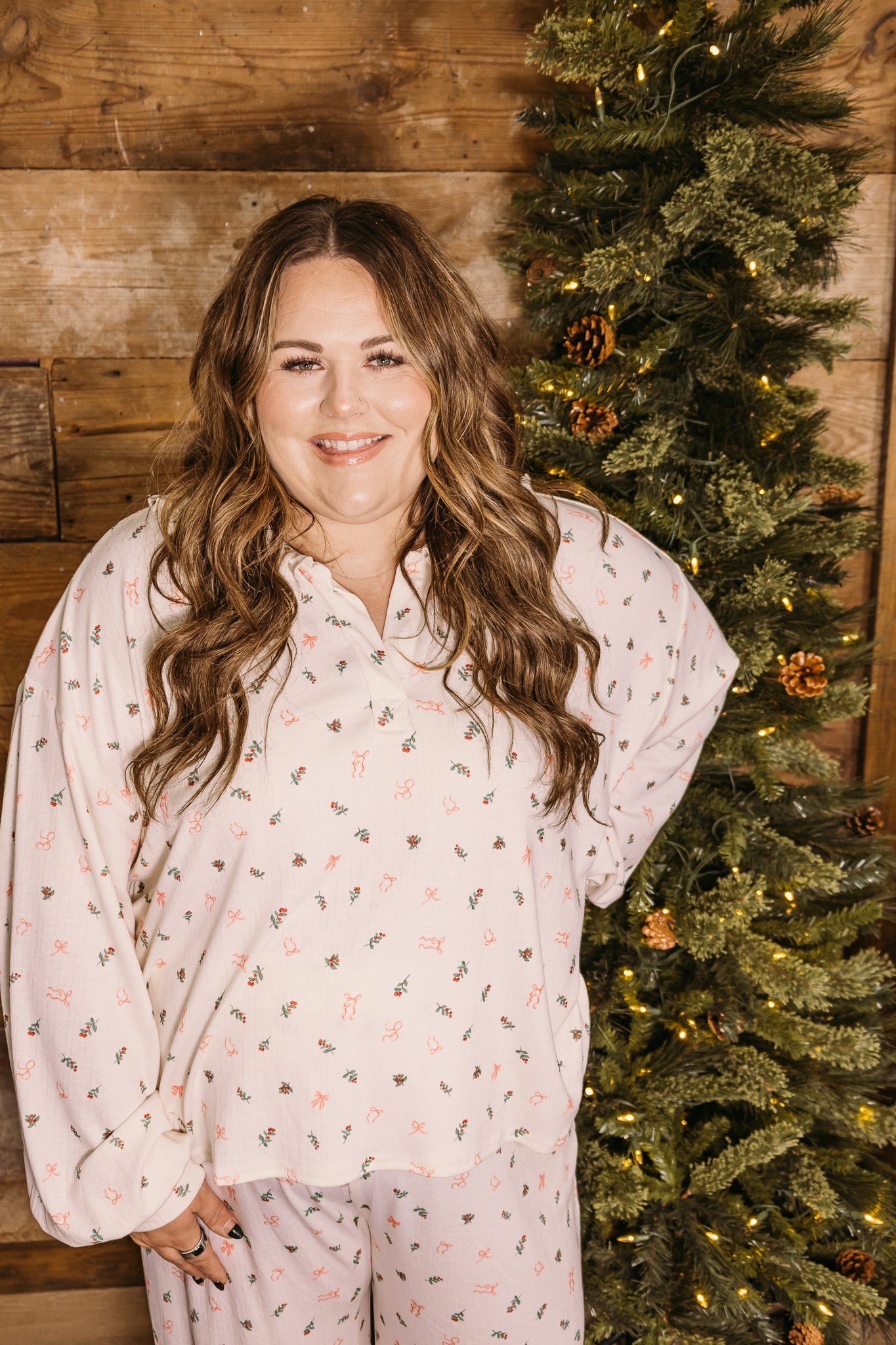 Sweet, cozy, and made for slow holiday mornings — the Holly Dreams pajama set is pure Christmas comfort. Featuring a soft neutral base with delicate holly and bow details, this set brings a gentle, feminine feel to your nighttime routine. The relaxed long-sleeve top pairs perfectly with the matching comfy pants for all-night comfort and all-day lounging.