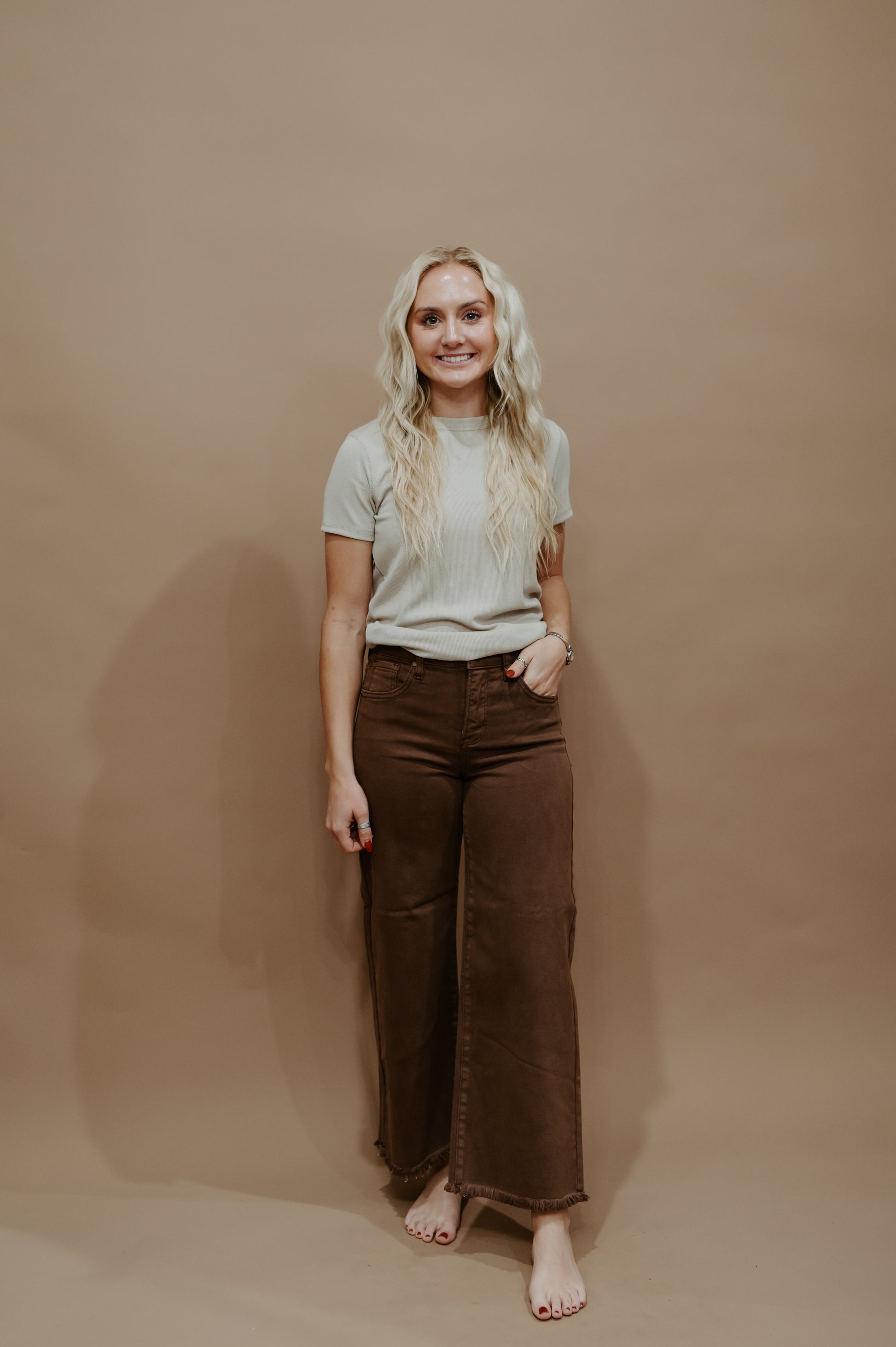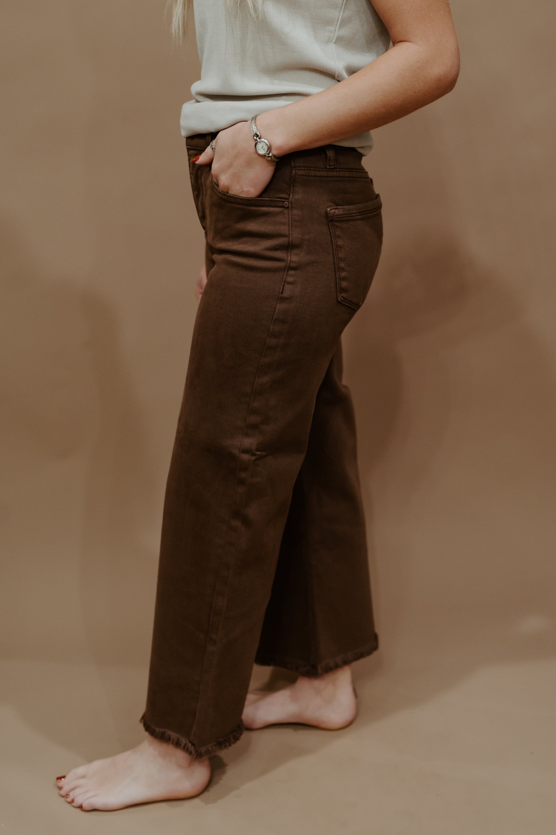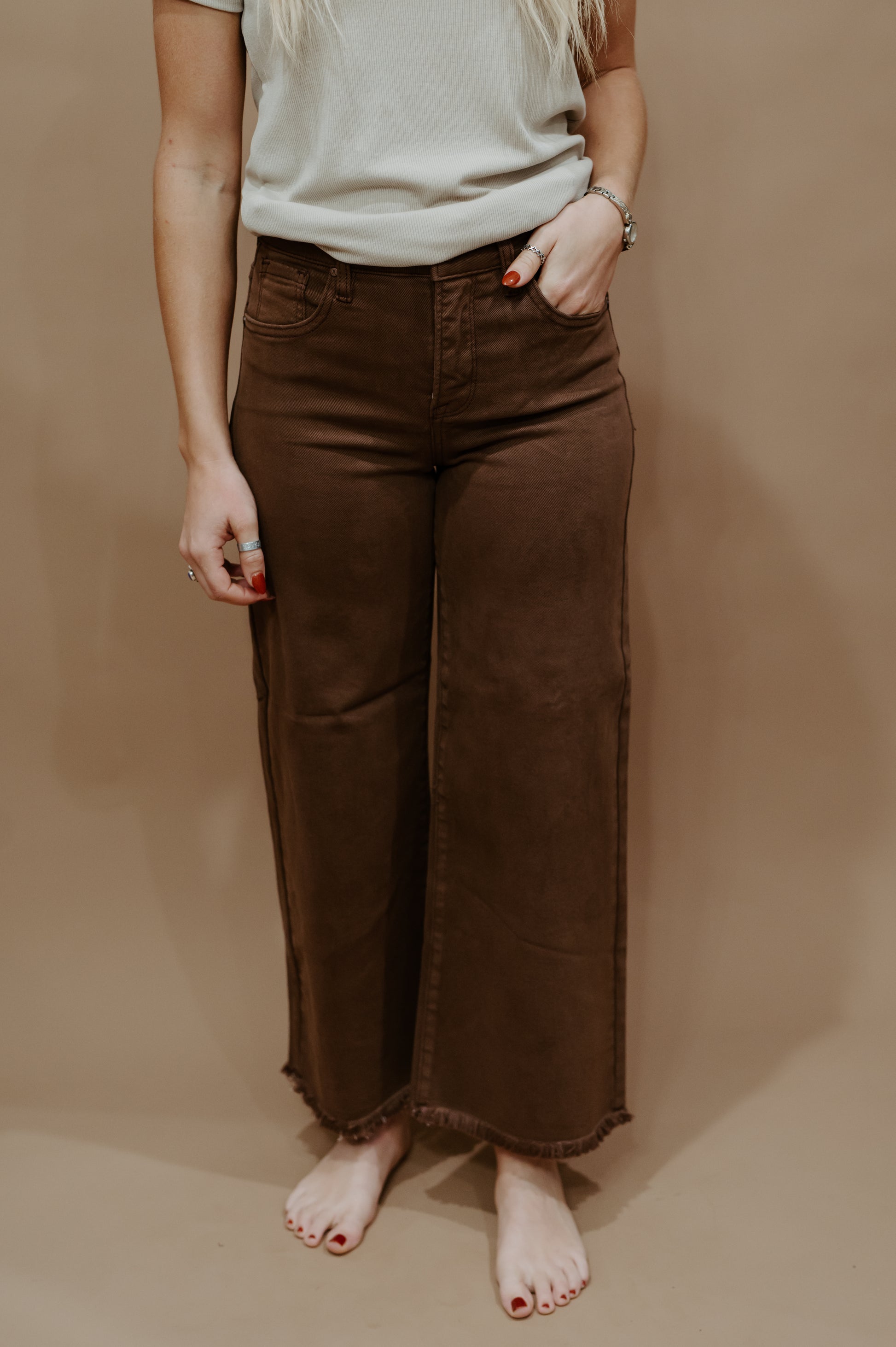 Fresh, modern, and a little unexpected – the Josie Jeans bring a chic twist to classic denim. Designed in a warm chestnut brown, these wide-leg jeans feature a cropped fit and a playful fringed hem that sets them apart. The high-rise cut flatters your shape while keeping them versatile enough for dressing up or down.