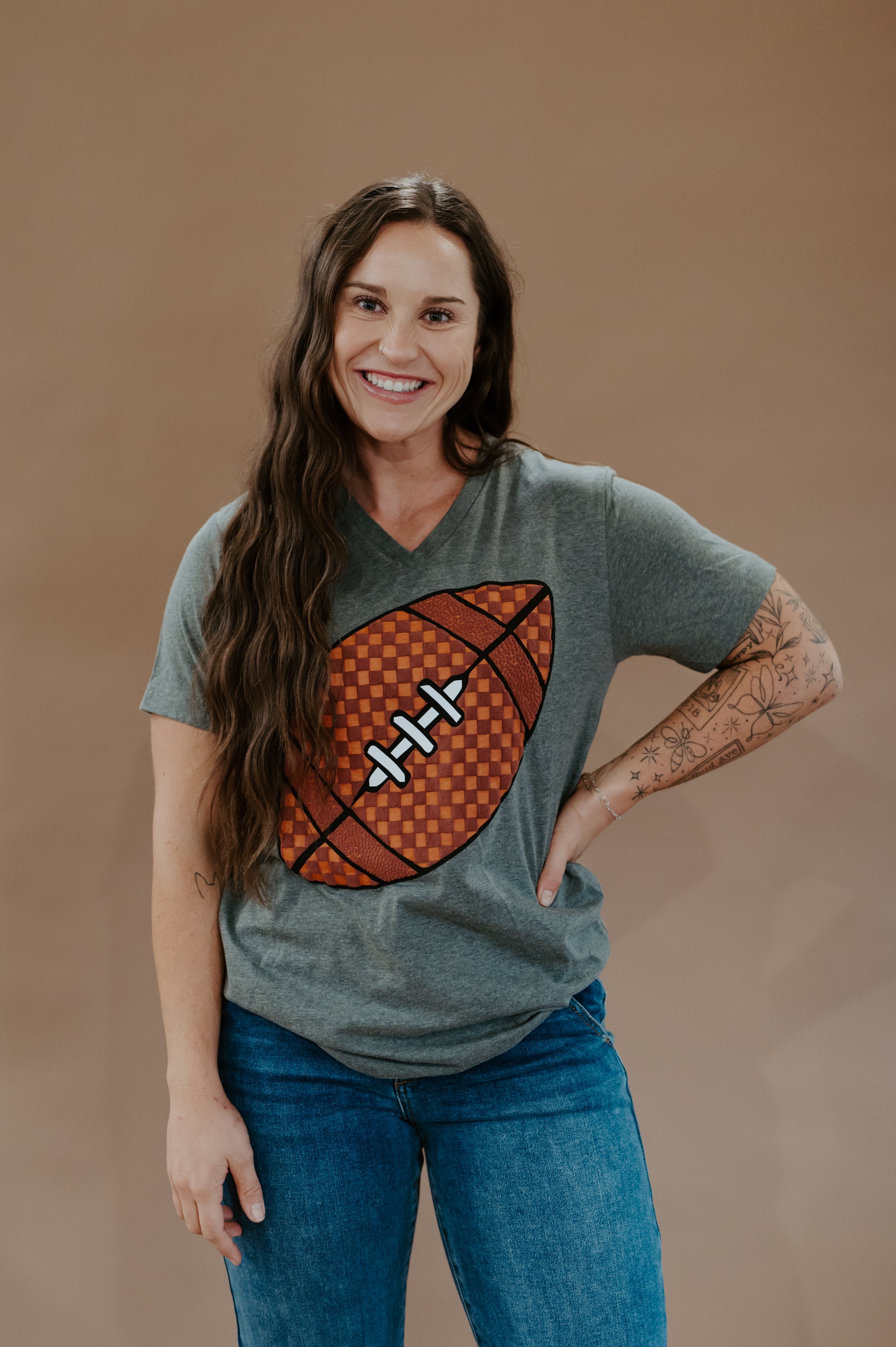 Get ready to score big with our Kick Off Tee! This grey football tee features a fun and unique puff print checkered design that is sure to make a statement on and off the field. Perfect for any football fan looking to add some flair to their wardrobe. Game on!