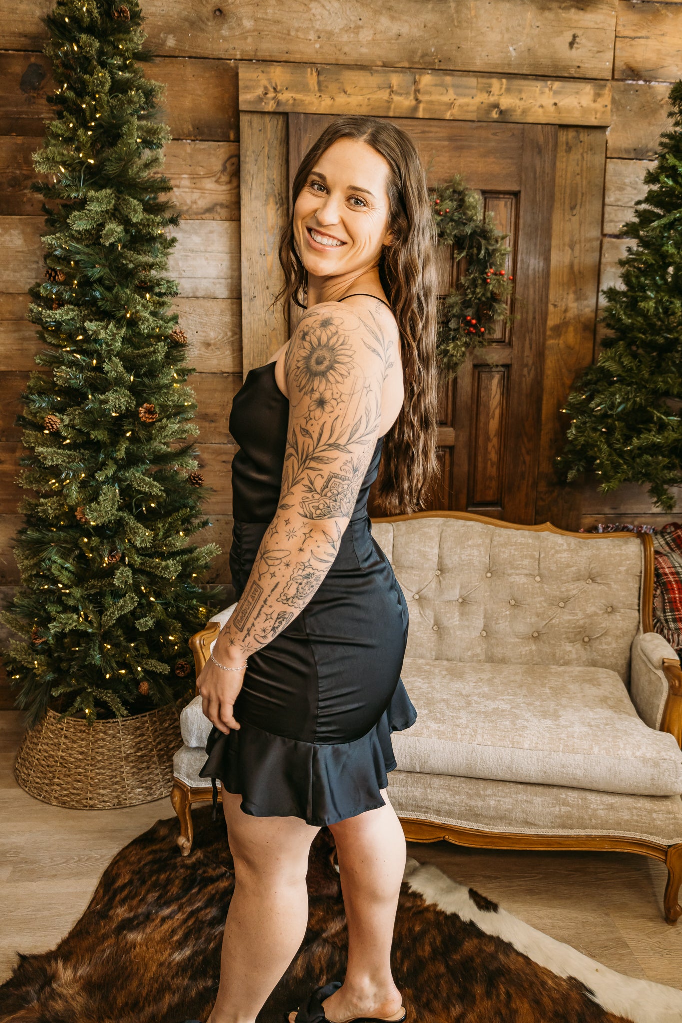 Every closet needs a Little Black Dress — and this one understood the assignment. This sleek satin mini features delicate spaghetti straps, a soft draped neckline, and flattering side ruching with an adjustable tie detail. Finished with a subtle ruffle hem, it hugs in all the right places while still feeling comfortable and wearable.