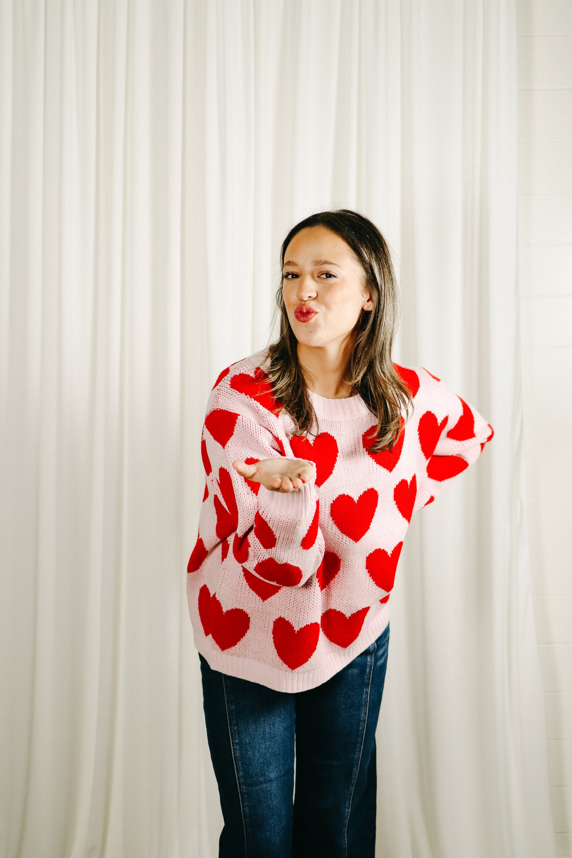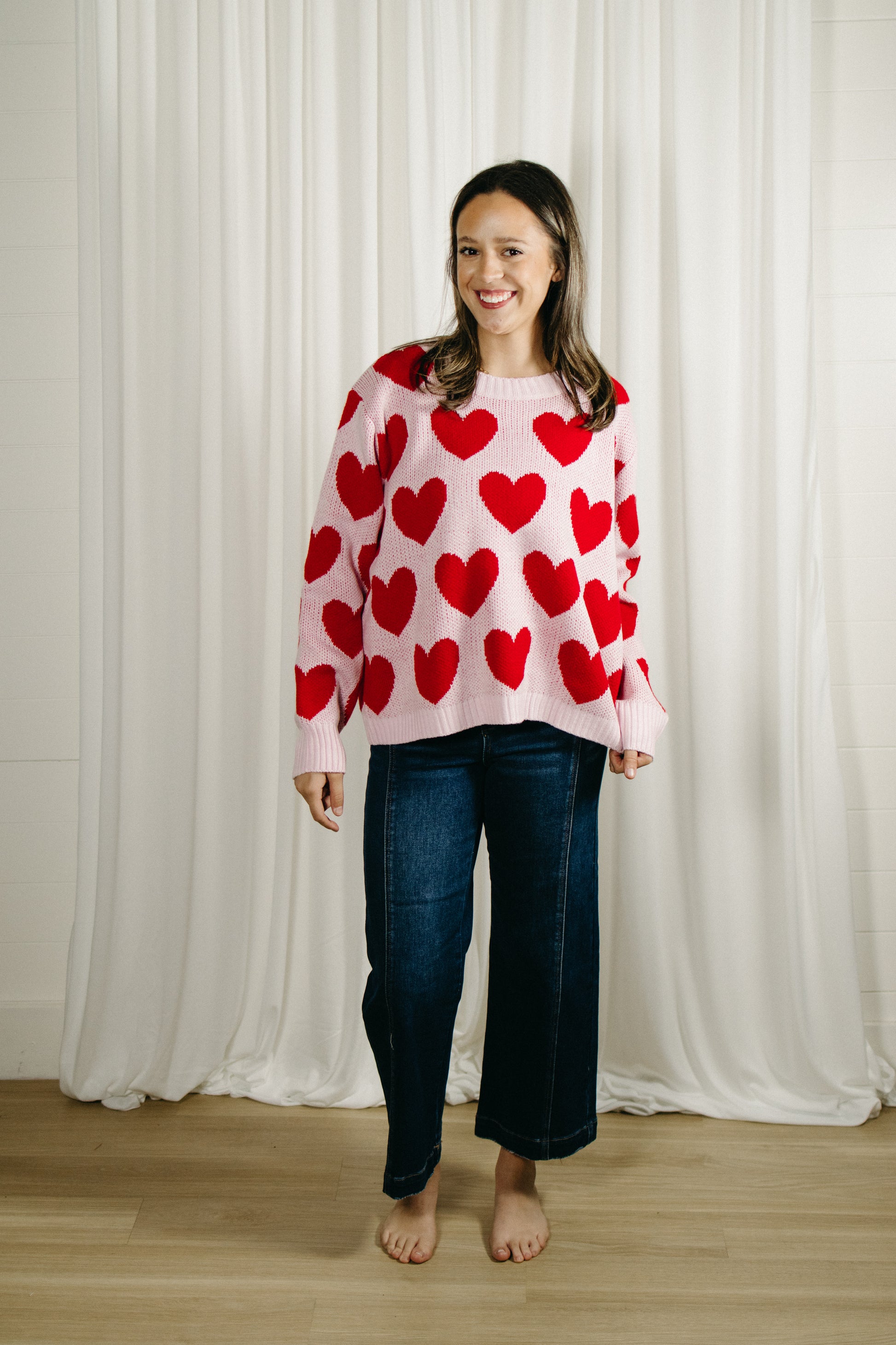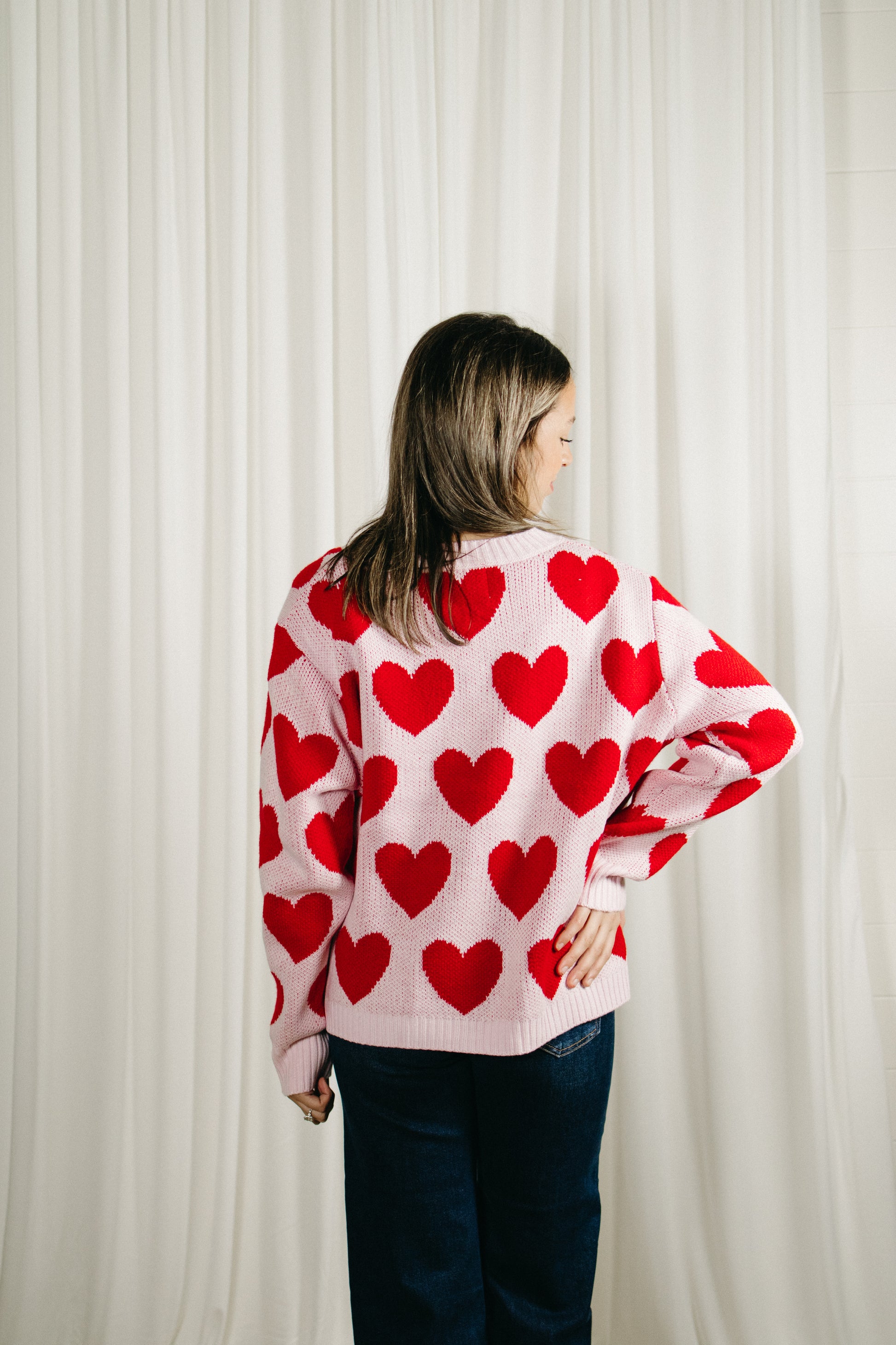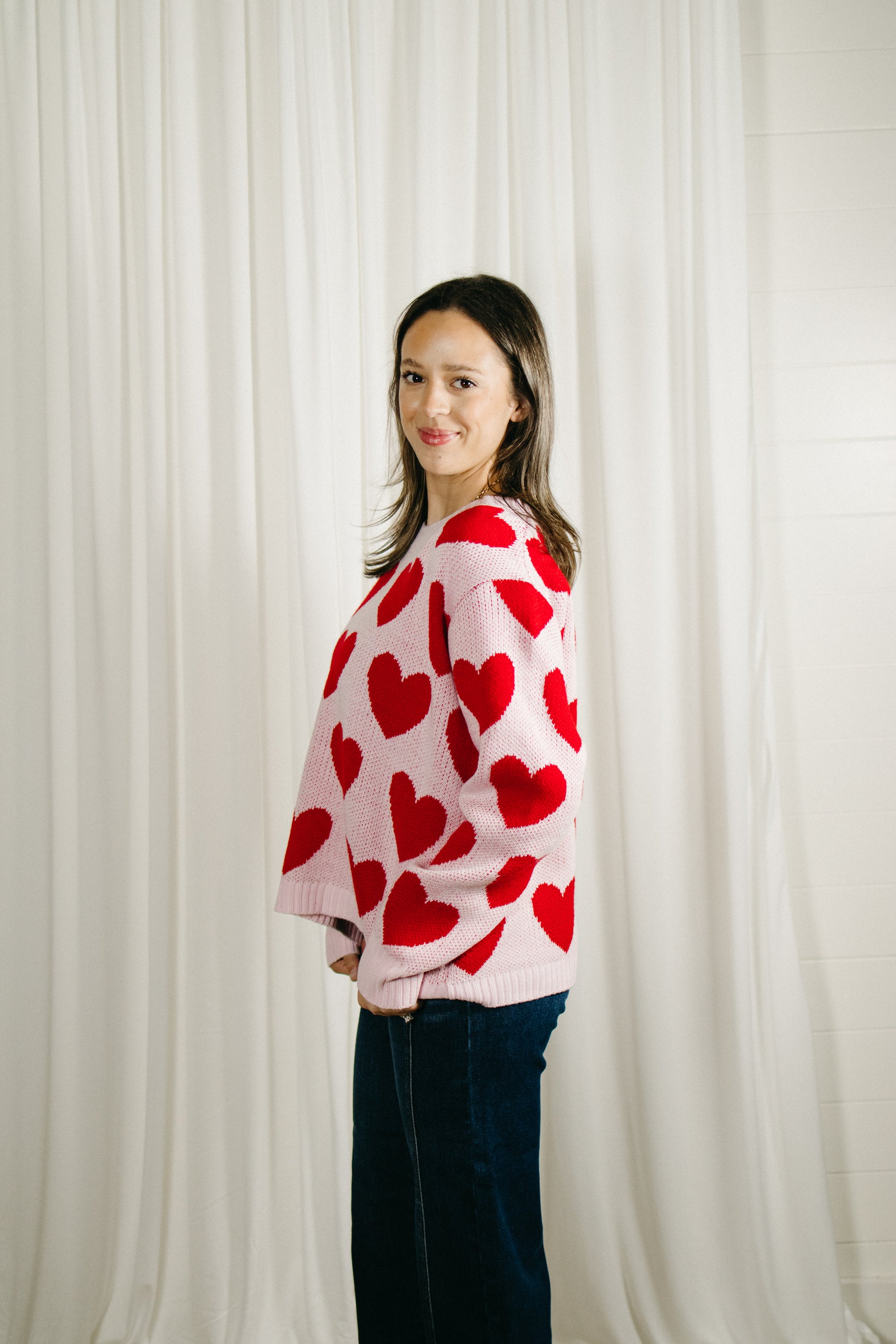 This pink sweater is sprinkled with bold red hearts for the perfect pop of playful charm. Featuring a relaxed, easy fit with a soft knit feel, it’s one of those throw-on-and-feel-cute pieces you’ll reach for again and again. Lightweight yet cozy, it pairs effortlessly with denim, trousers, or layered over a dress on cooler days.
