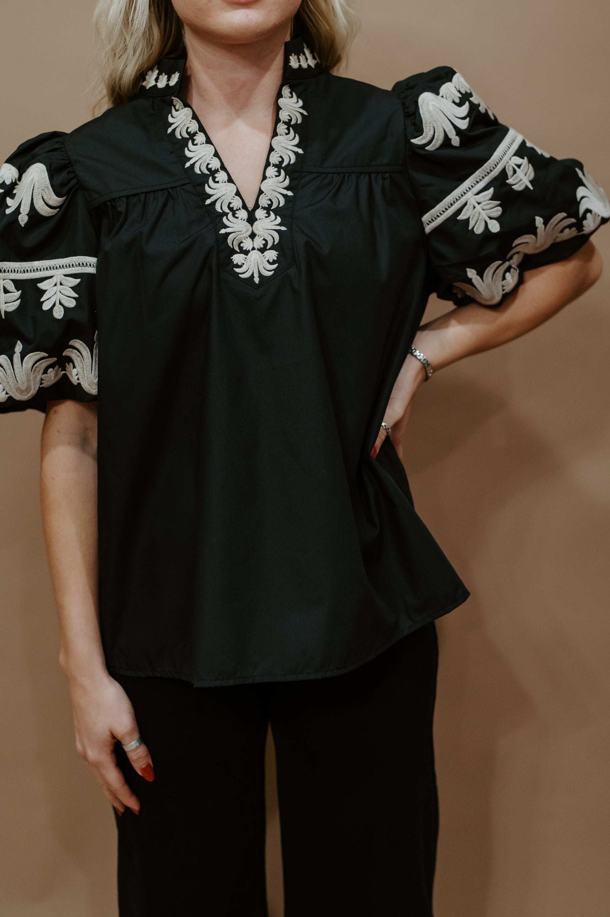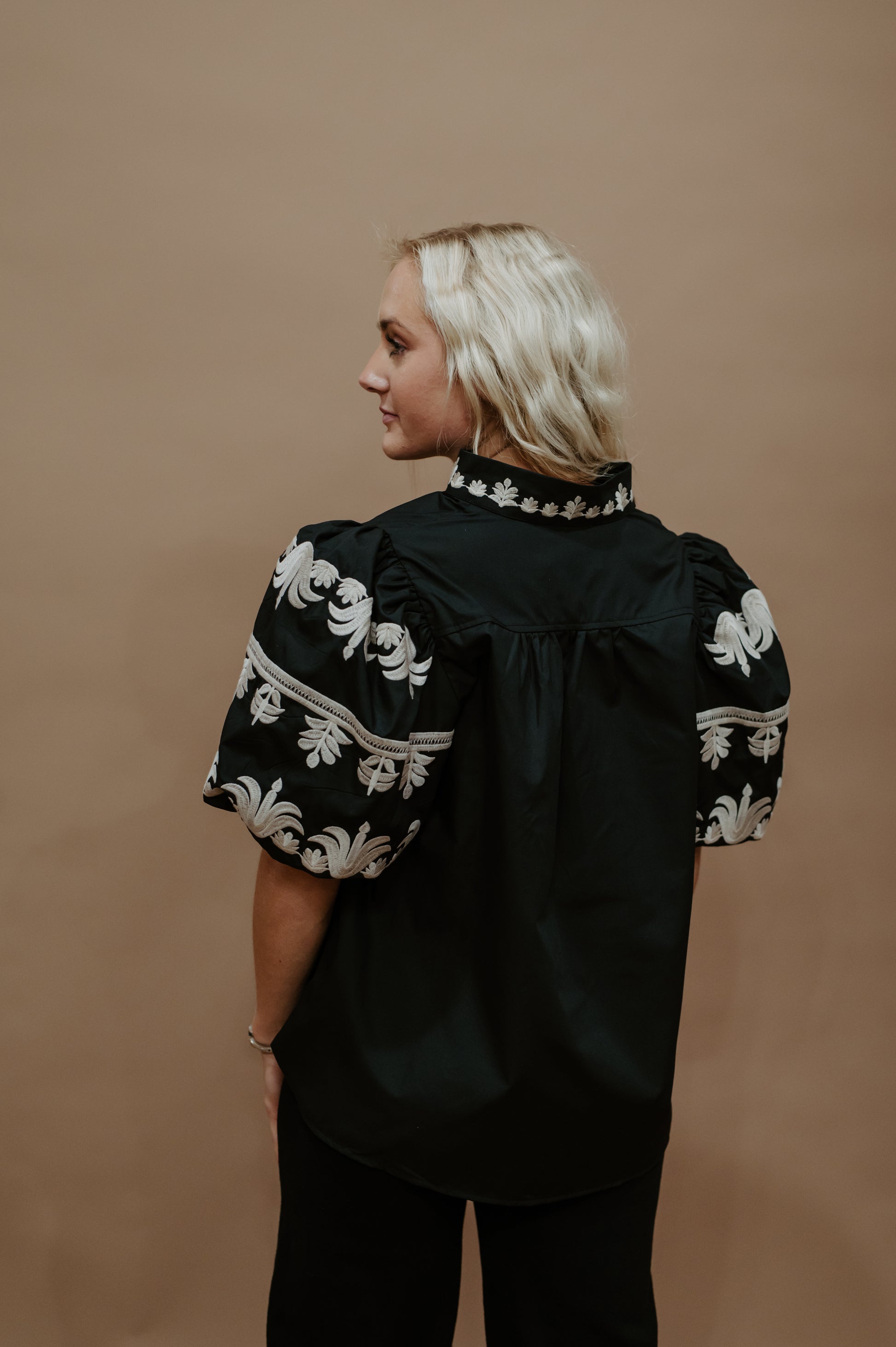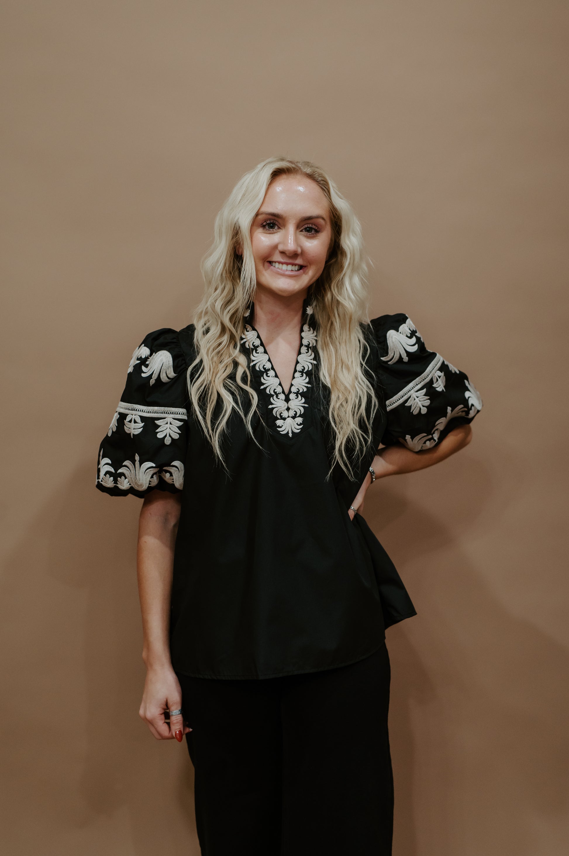 Where classic black meets desert-inspired charm. The Mesa Dawn Top features dramatic puff sleeves and intricate ivory embroidery along the neckline and sleeves, giving it that perfect mix of bold and feminine. The lightweight fabric keeps it breathable, while the embroidered detailing brings a timeless, western-glam edge.