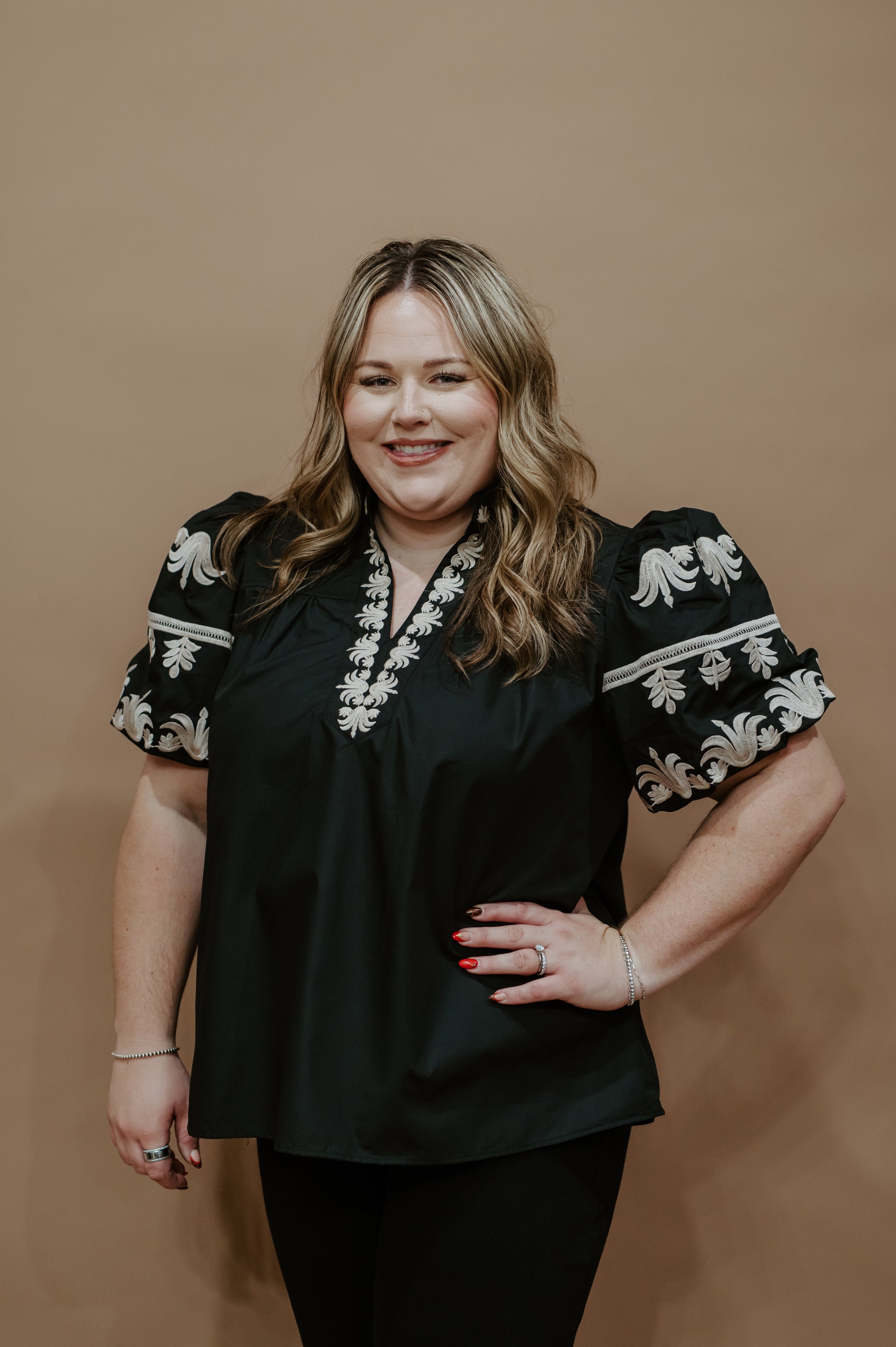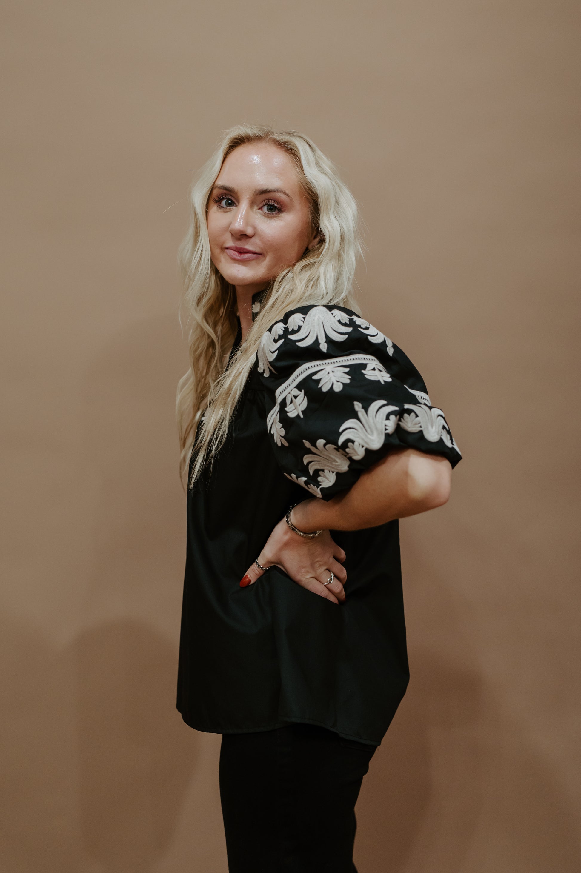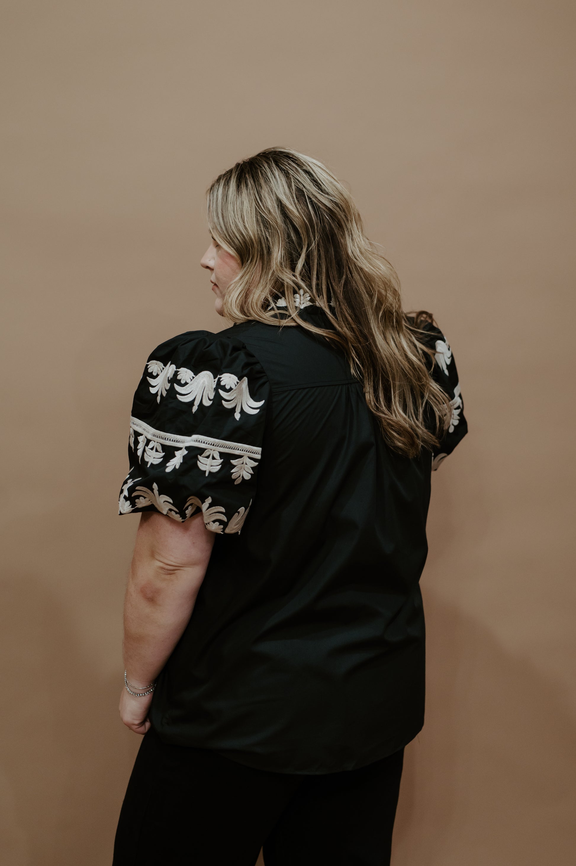 Where classic black meets desert-inspired charm. The Mesa Dawn Top features dramatic puff sleeves and intricate ivory embroidery along the neckline and sleeves, giving it that perfect mix of bold and feminine. The lightweight fabric keeps it breathable, while the embroidered detailing brings a timeless, western-glam edge.