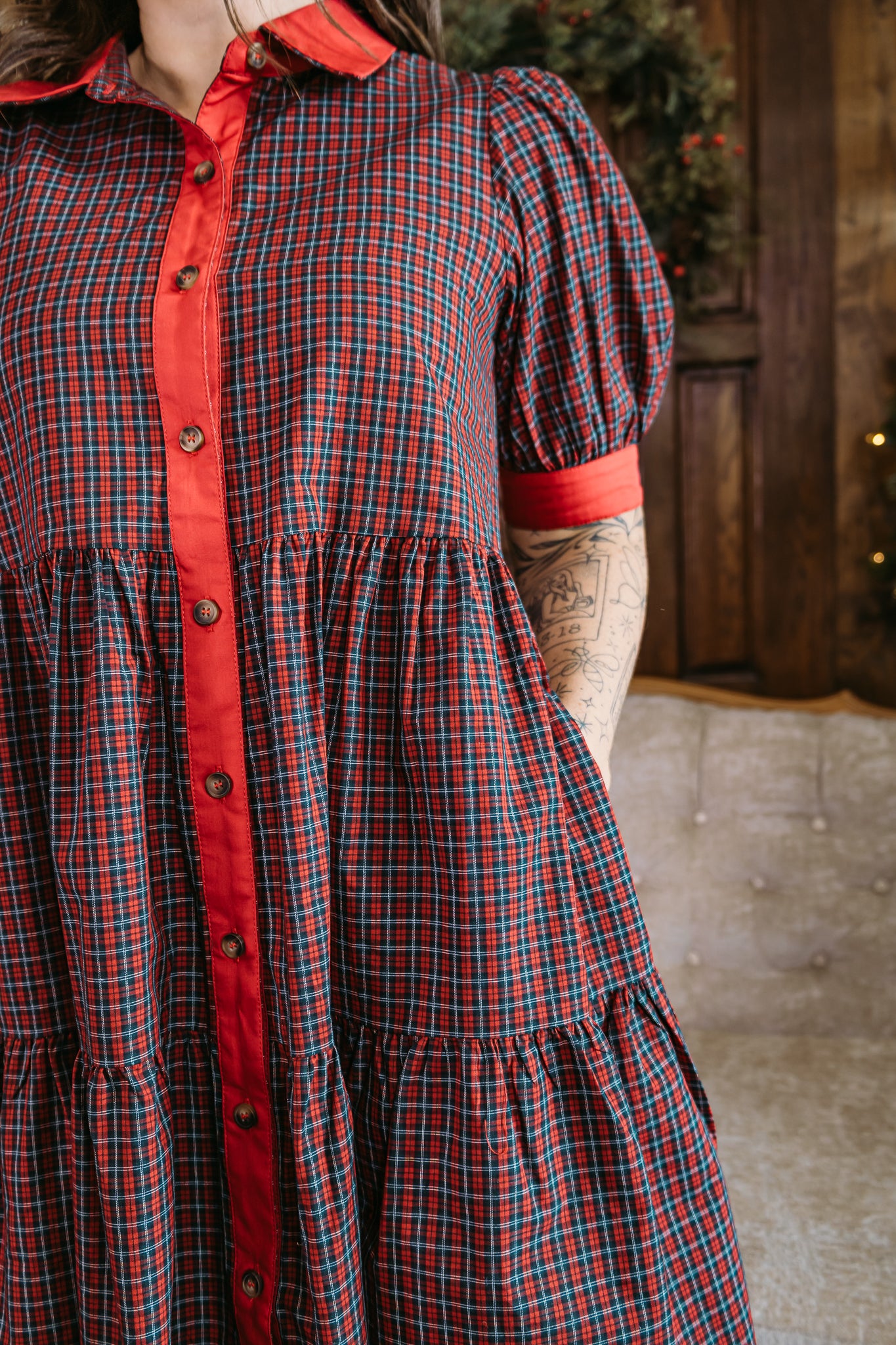 The Miss Merry dress brings classic Christmas plaid to life with a sweet tiered silhouette and bold red contrast details. Featuring a button-front design, puff sleeves with cuffed hems, and a flowy fit that’s easy to wear all season long, this one is perfect for holiday parties, family photos, or Christmas Eve service.