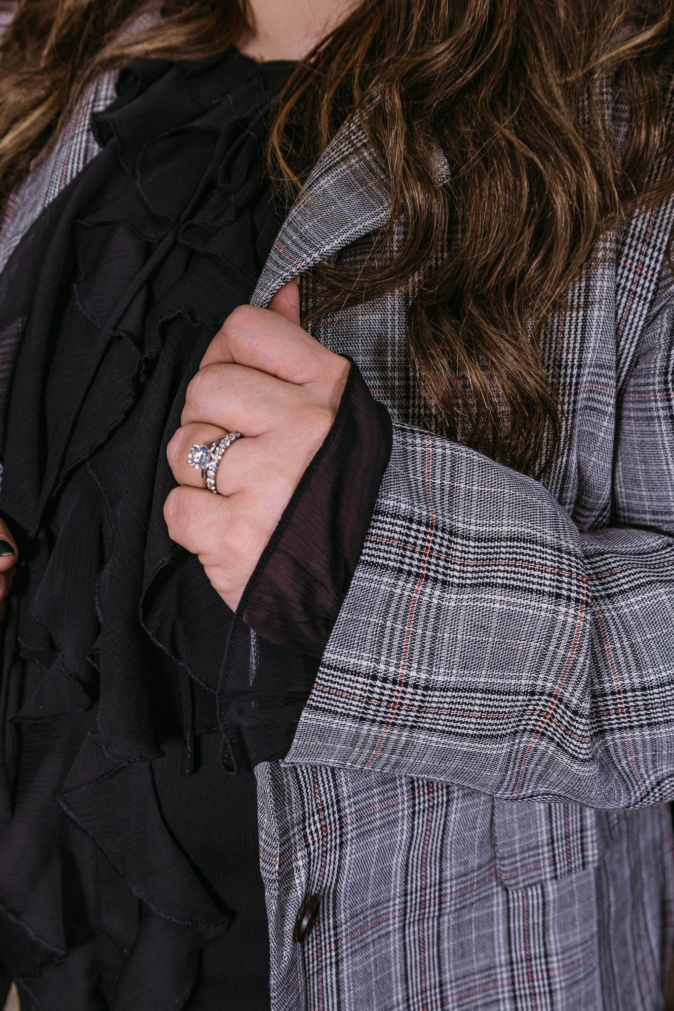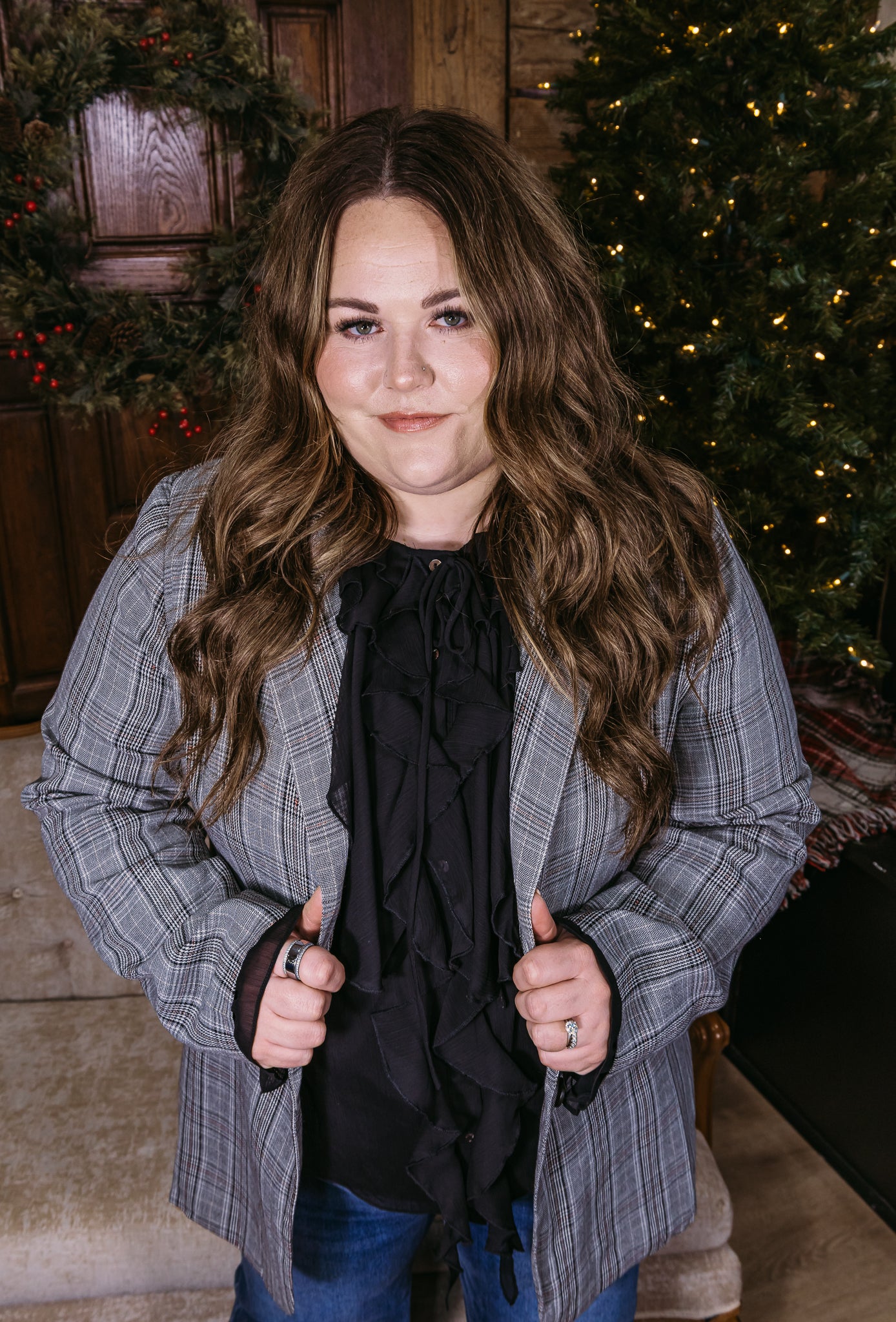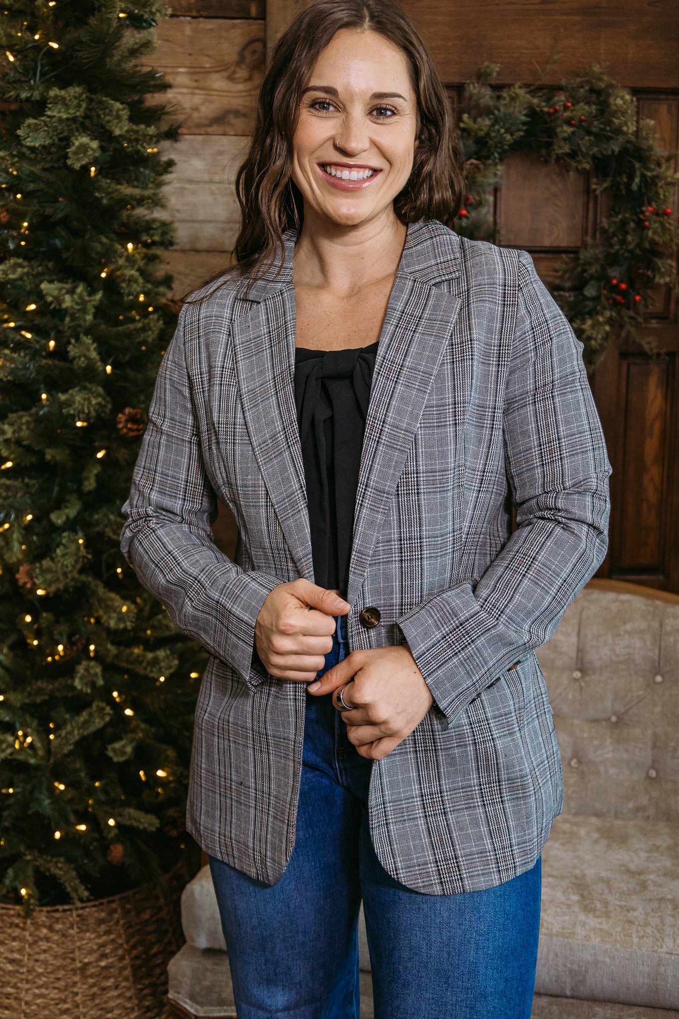 Say hello to Miss Midnight — the blazer that pulls every look together. This classic gray plaid blazer features a tailored fit, notched lapel, and single-button closure for a clean, structured silhouette. It’s professional enough for work but easy to style casually with denim for an elevated everyday look.