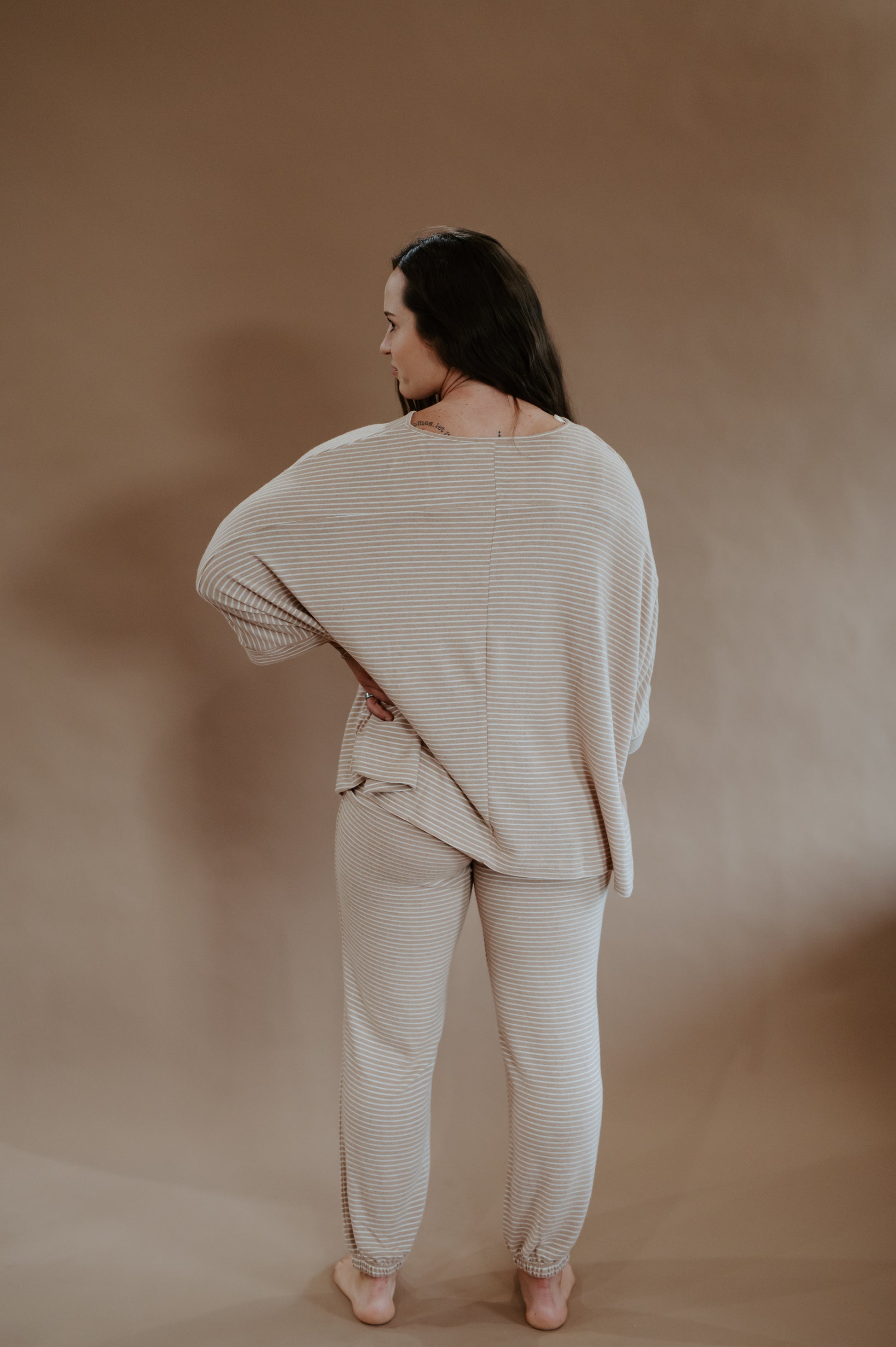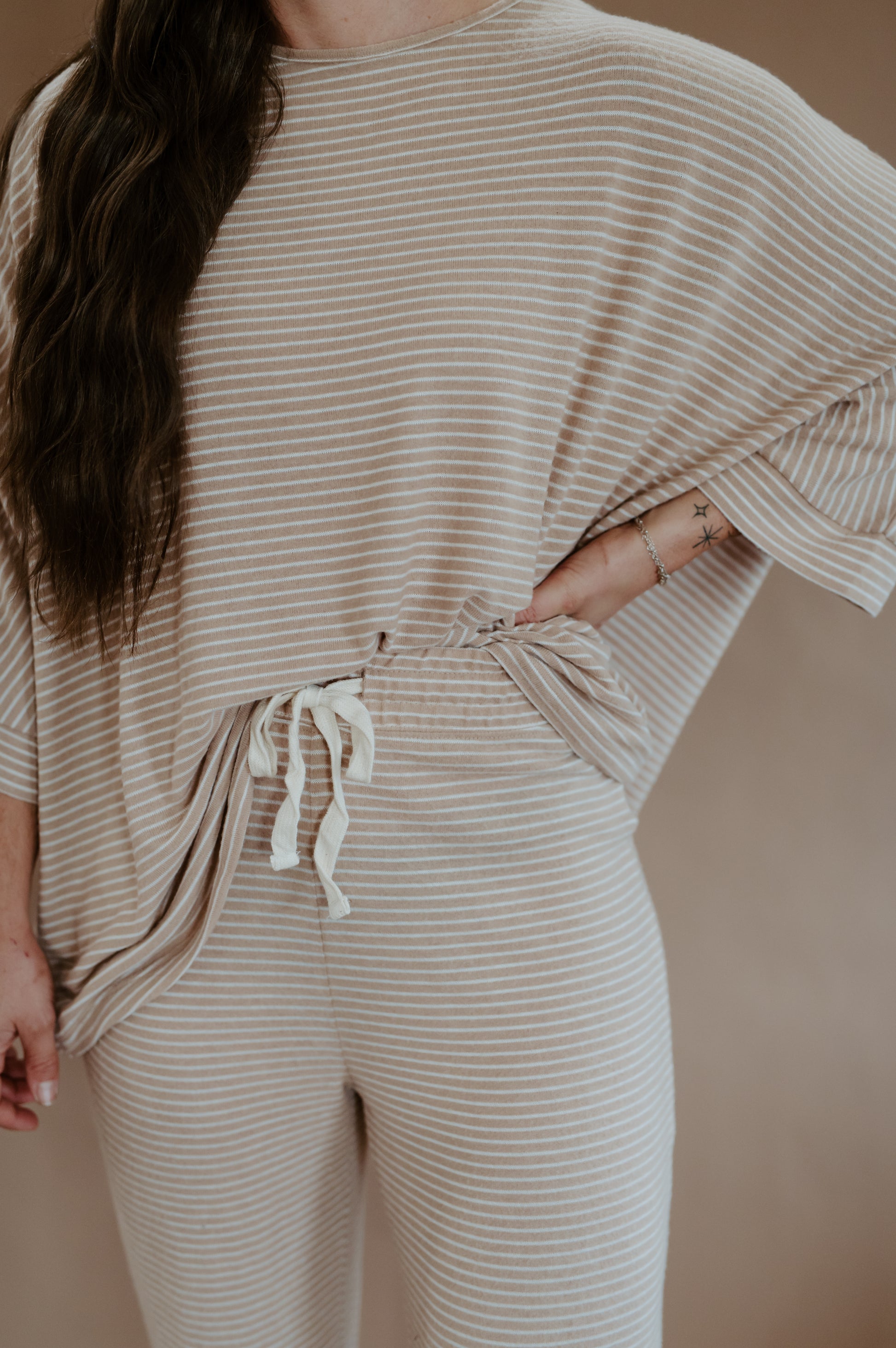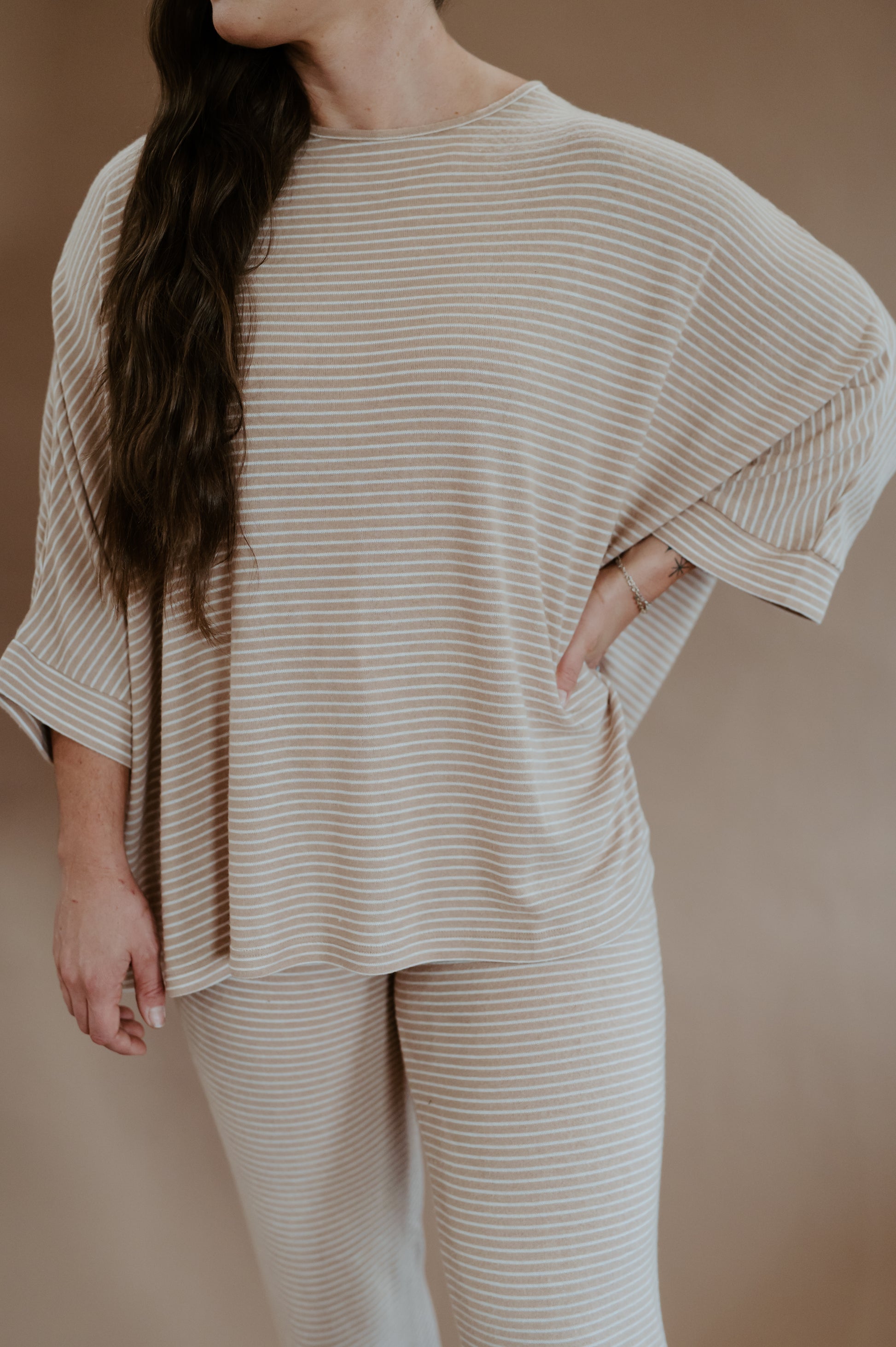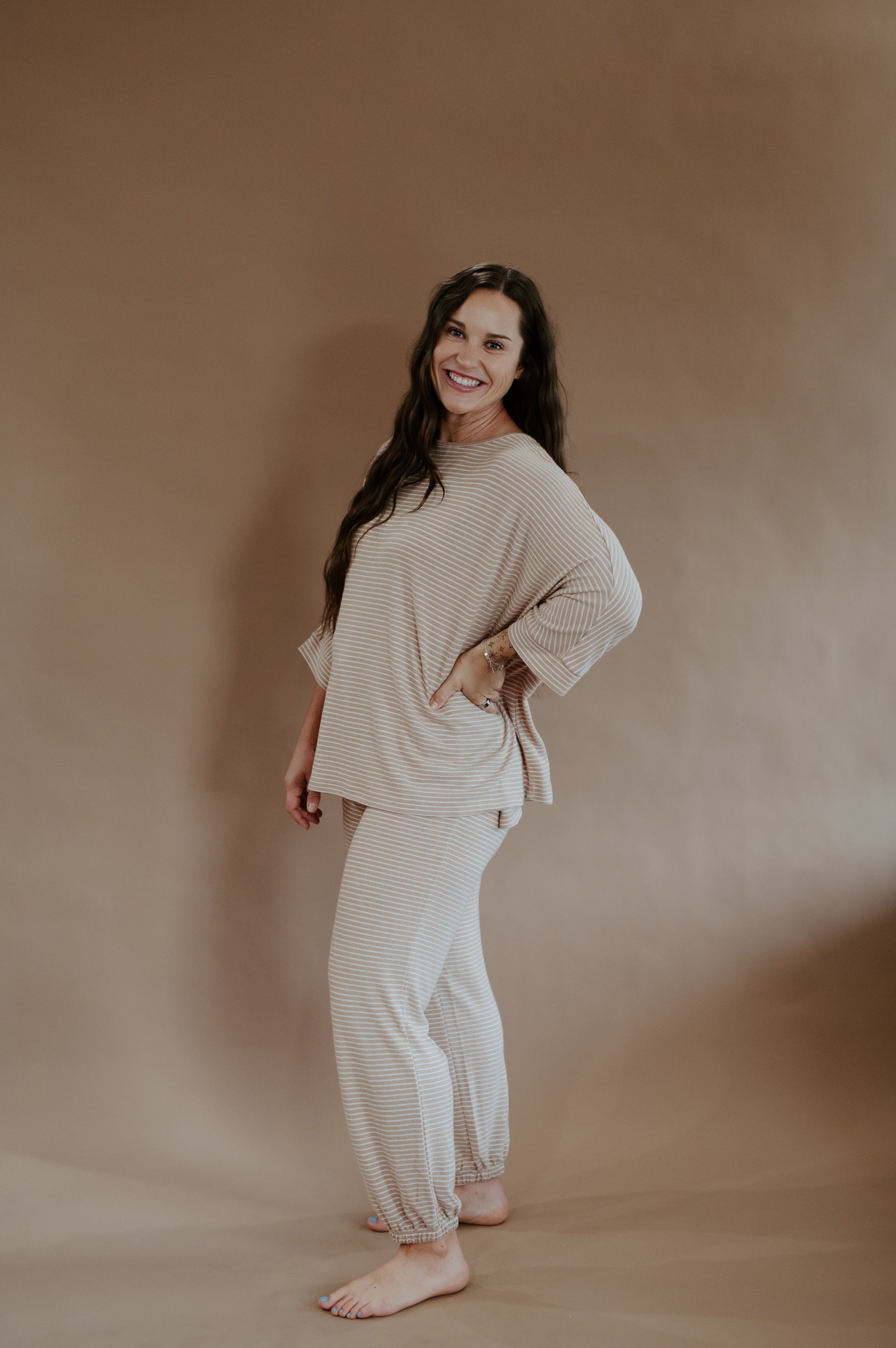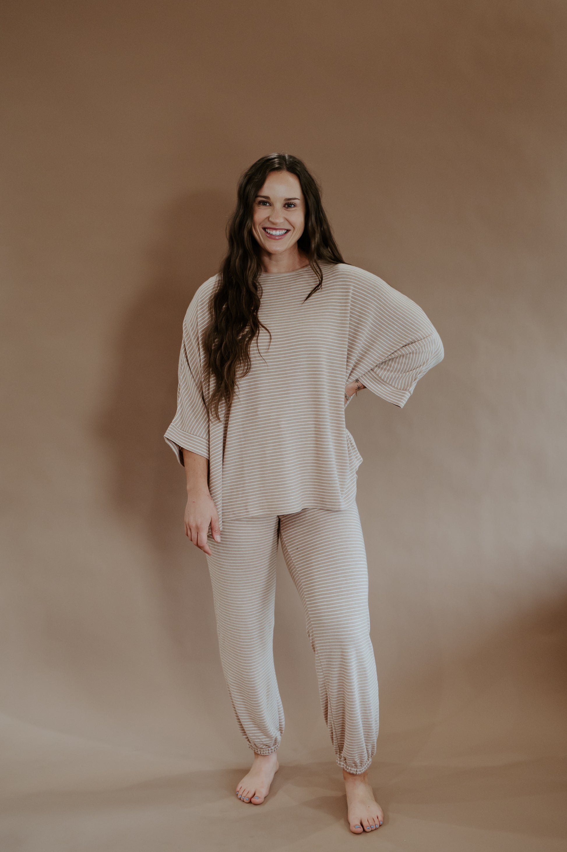 ✨ The Oatmeal Glow Set was made for slow mornings, road trips, and everything in between. With its soft striped top and matching jogger pants, this two-piece look brings comfort without sacrificing style. The relaxed fit keeps it casual, while the neutral oat-and-cream tones give it that fresh, modern western glow.