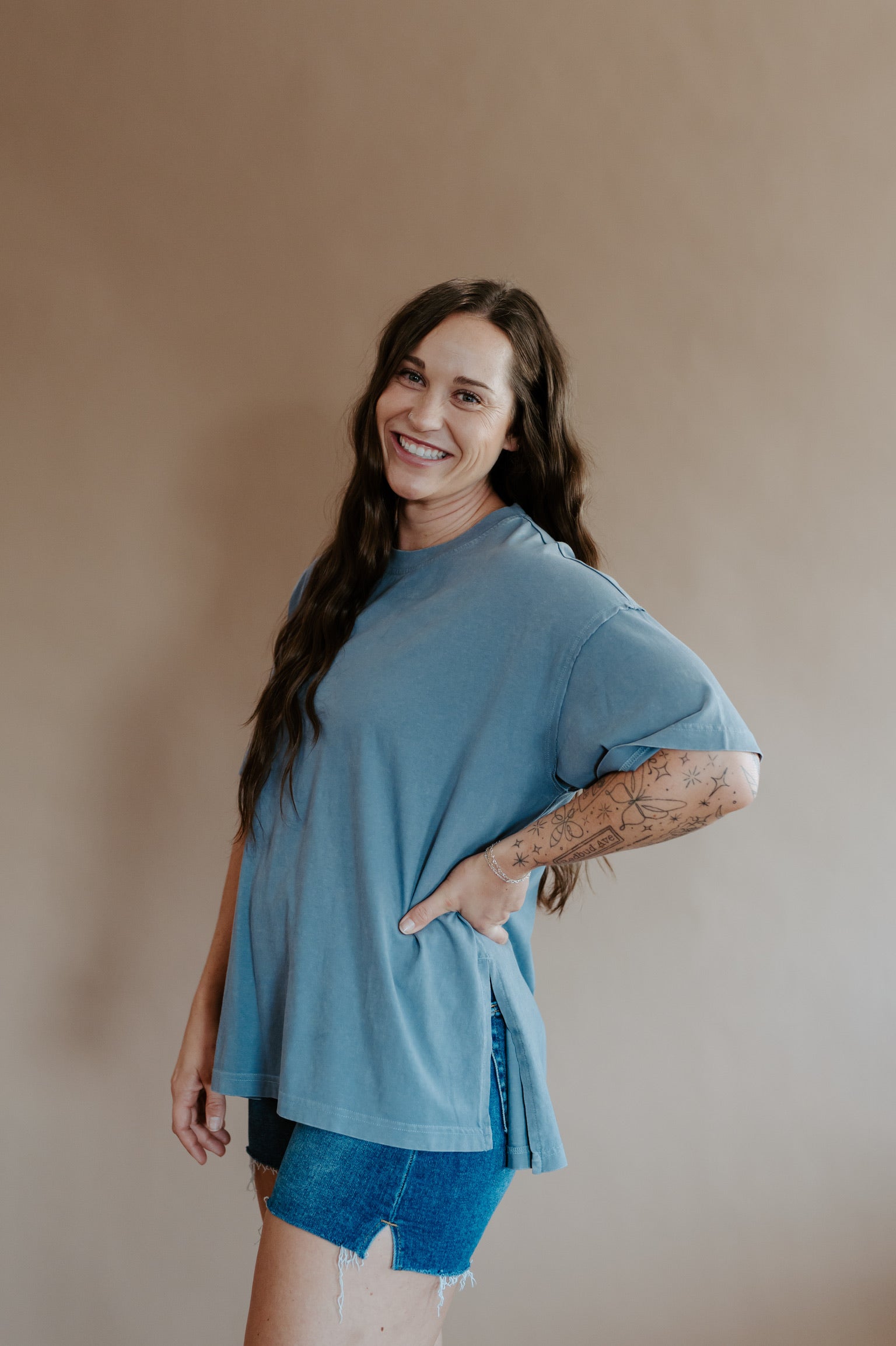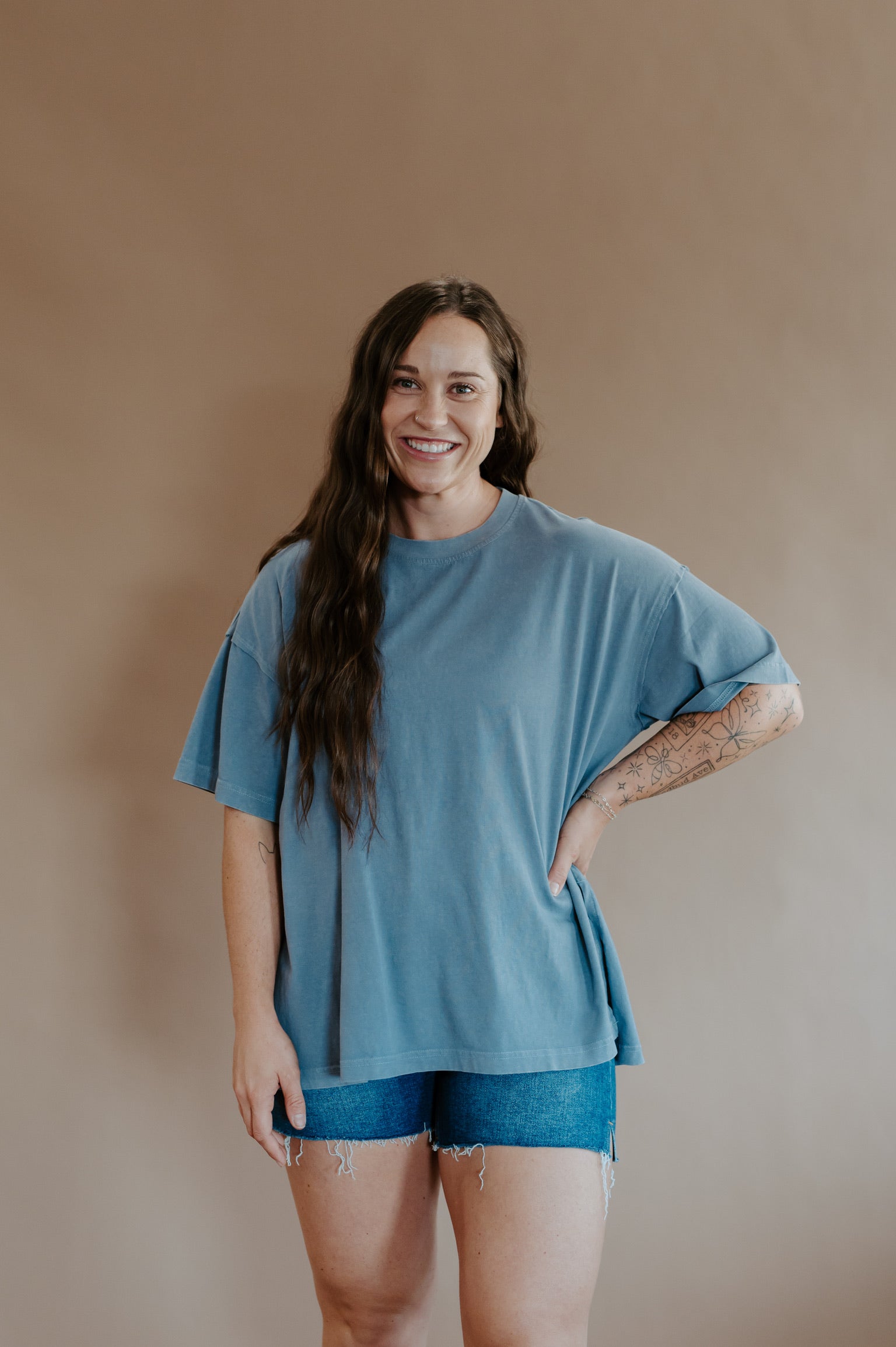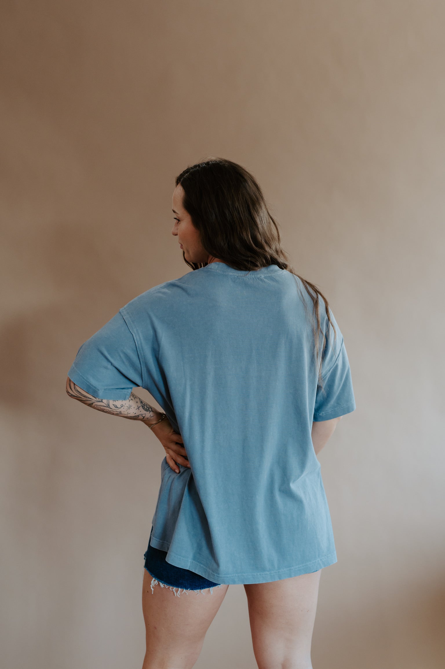 Embrace cozy vibes with the Rainy Day Tee, featuring a blue-grey mineral wash that adds a cool, worn-in look. Its oversized fit makes it perfect for layering or lounging, keeping you comfy and effortlessly stylish no matter the weather.