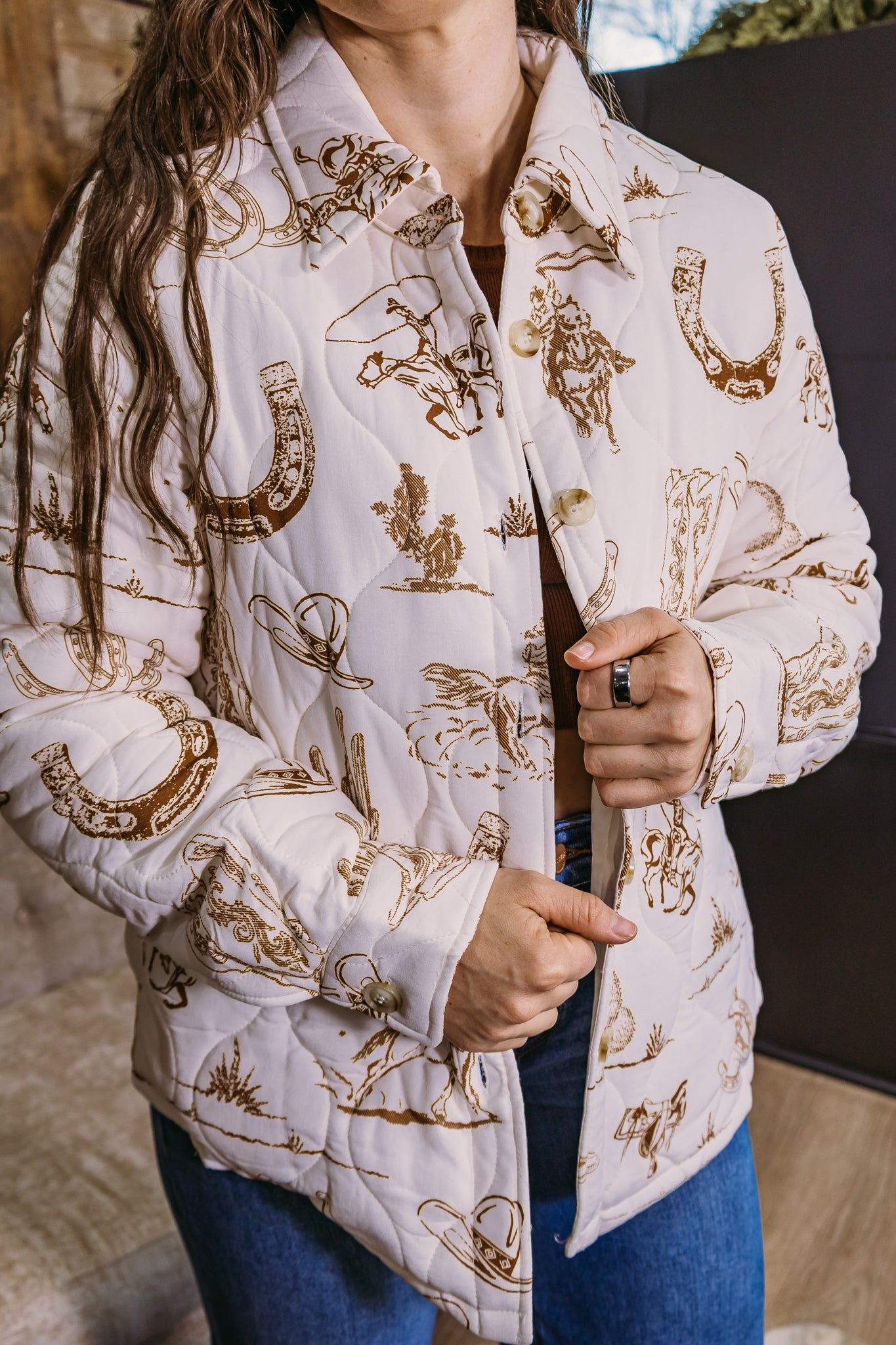 Classic western storytelling meets everyday warmth in Rodeo Heritage. This lightweight quilted jacket features an allover western-inspired print with horseshoes, riders, and ranch details in warm brown tones against a creamy backdrop. The soft quilting keeps it cozy without feeling bulky, making it perfect for layering through fall and winter.