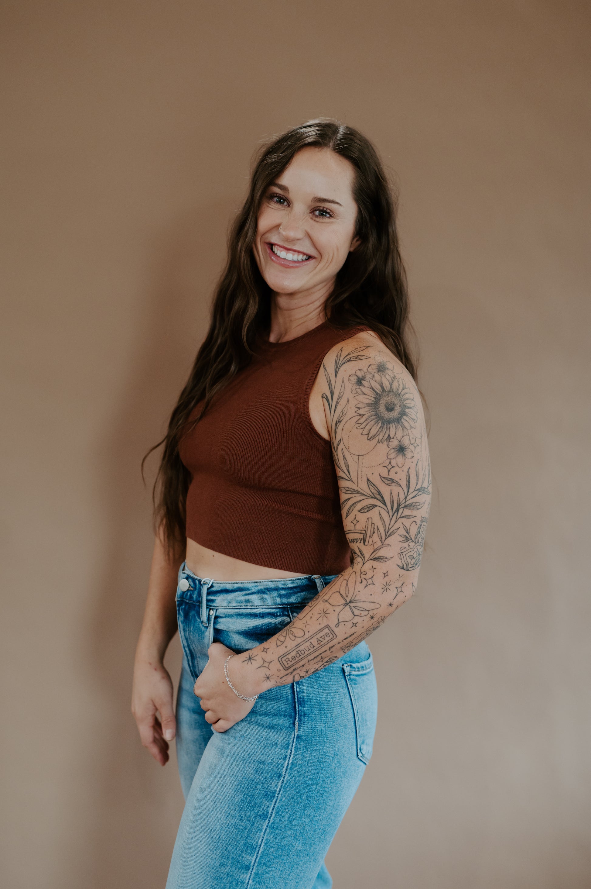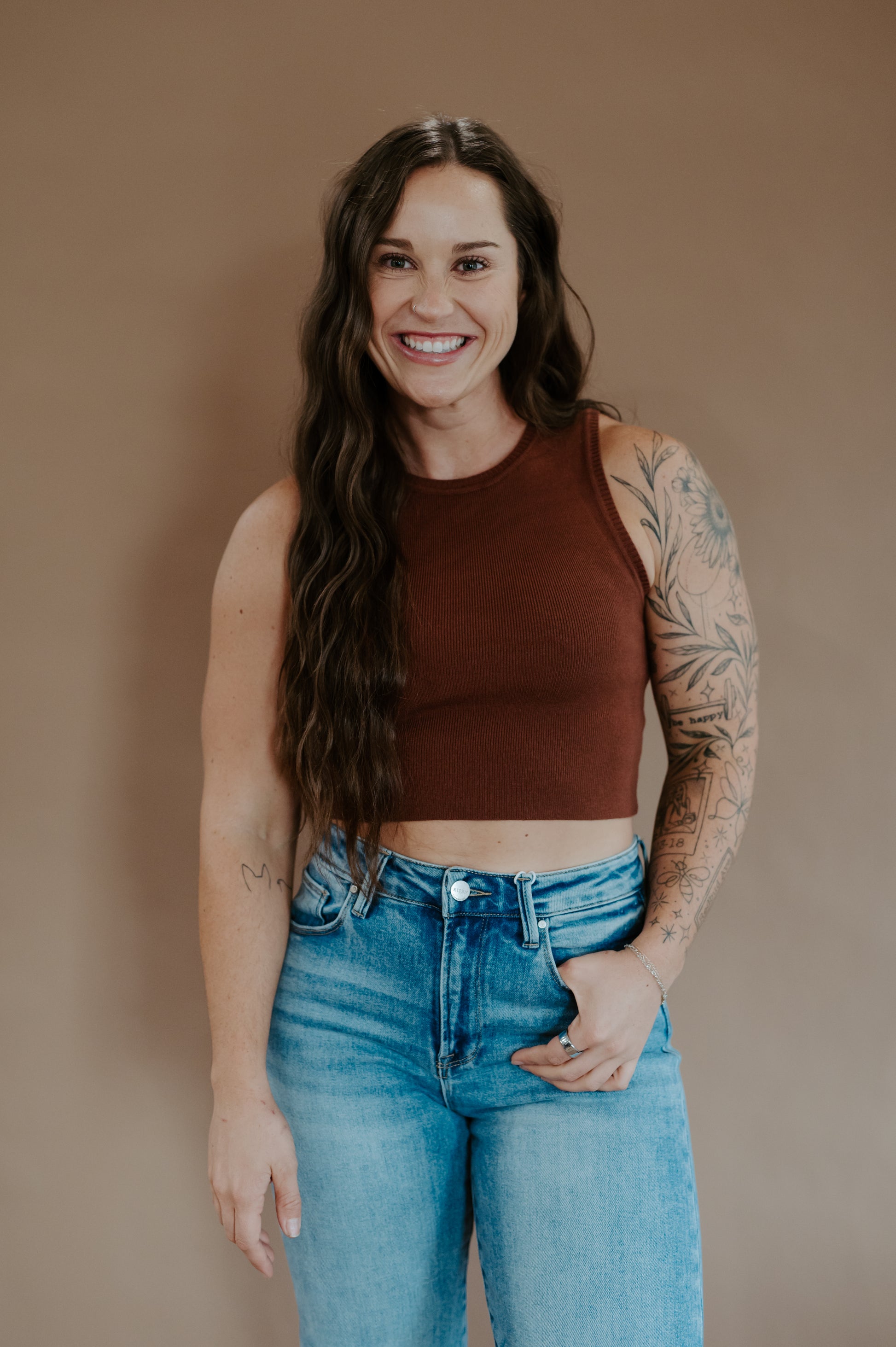 Rooted in western grit with a modern edge – the Saddle Knit Tank is that versatile piece you’ll wear on repeat. Designed in a rich chestnut shade, this soft knit tank has a cropped fit that layers effortlessly under jackets, blazers, or stands strong on its own with denim and boots. The clean silhouette keeps it polished, while the color nods to those dusty saddle tones we love out here in the West