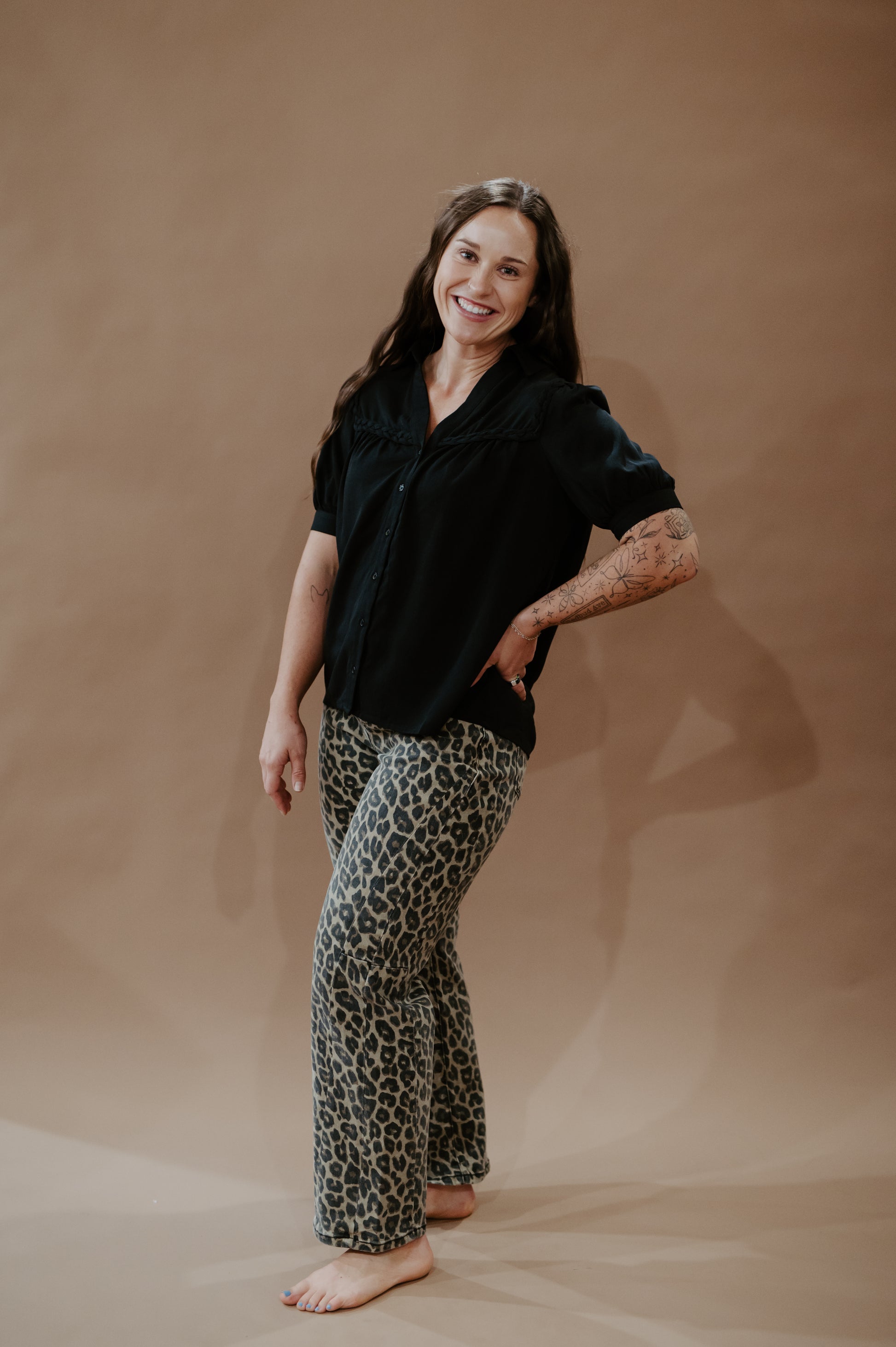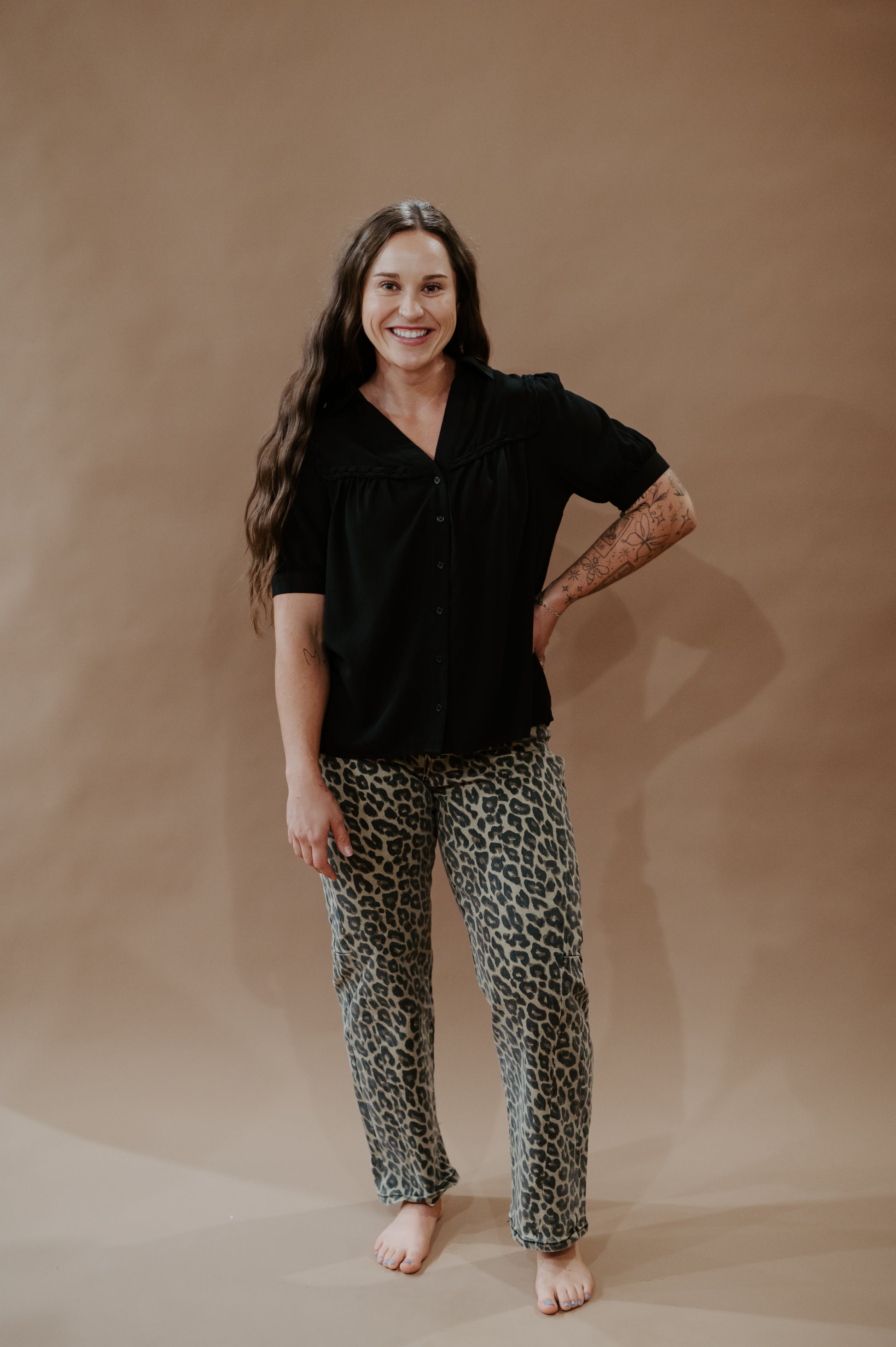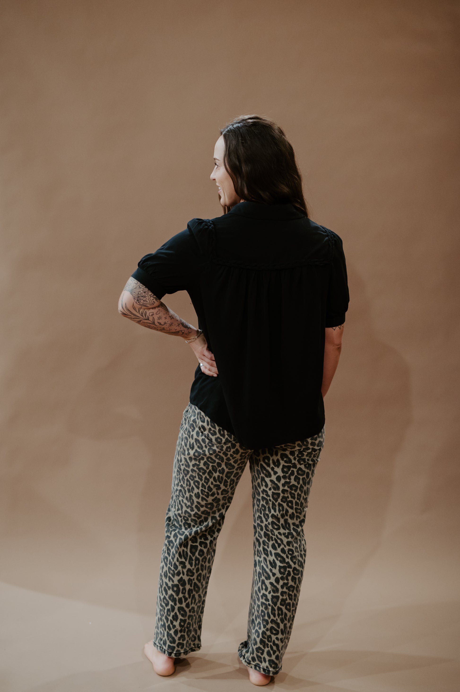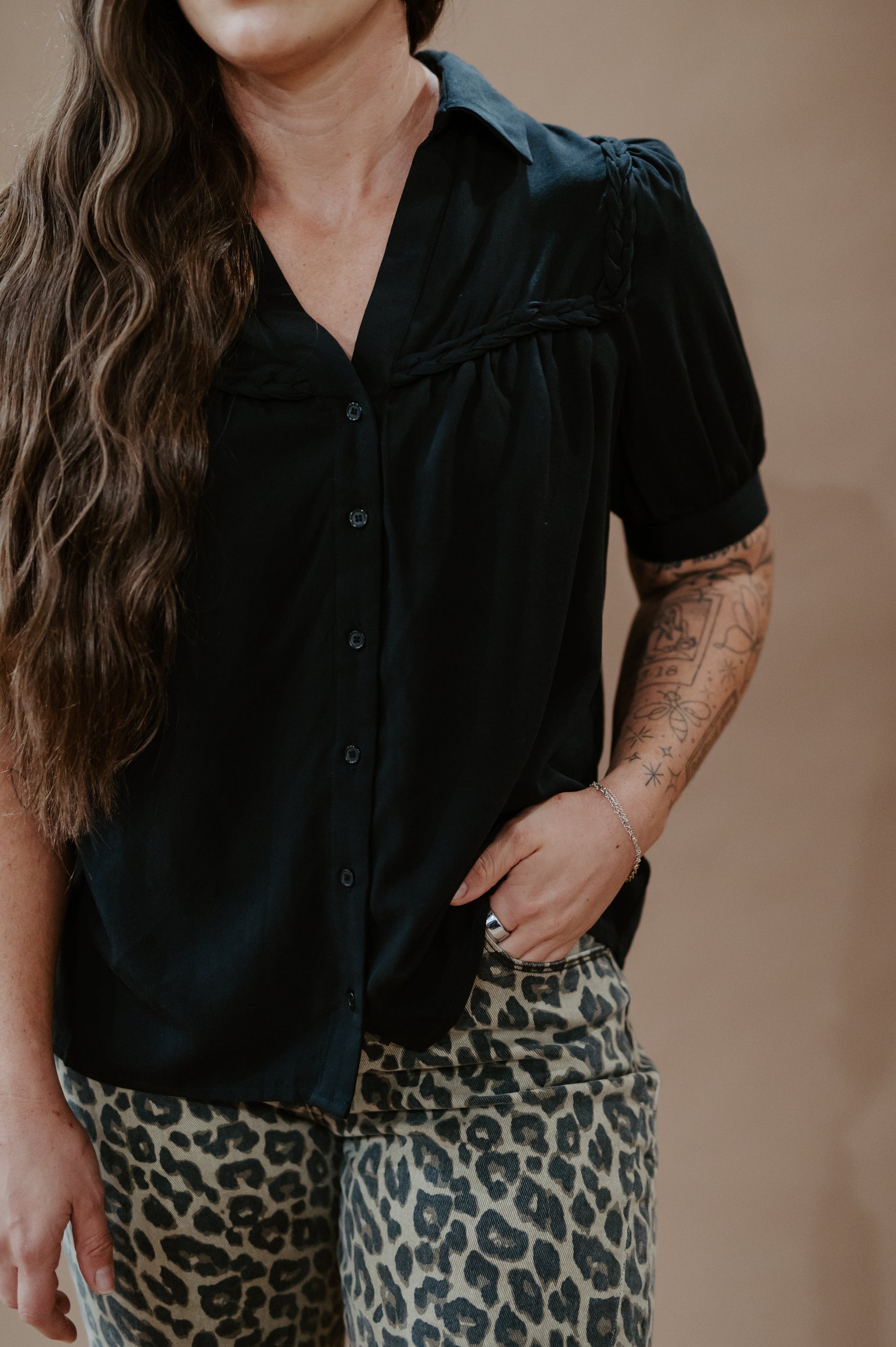 Classic black with a twist ✨ The Shadow Twist Top is your new elevated basic – simple, sleek, and just the right amount of detail. Featuring a button-down front, collared neckline, and subtle braided trim across the chest and shoulders, this blouse is where timeless meets unique. The lightweight fabric and short sleeves make it perfect for year-round wear – dress it up with trousers for the office, or pair it with denim and boots for a casual western-chic vibe.
