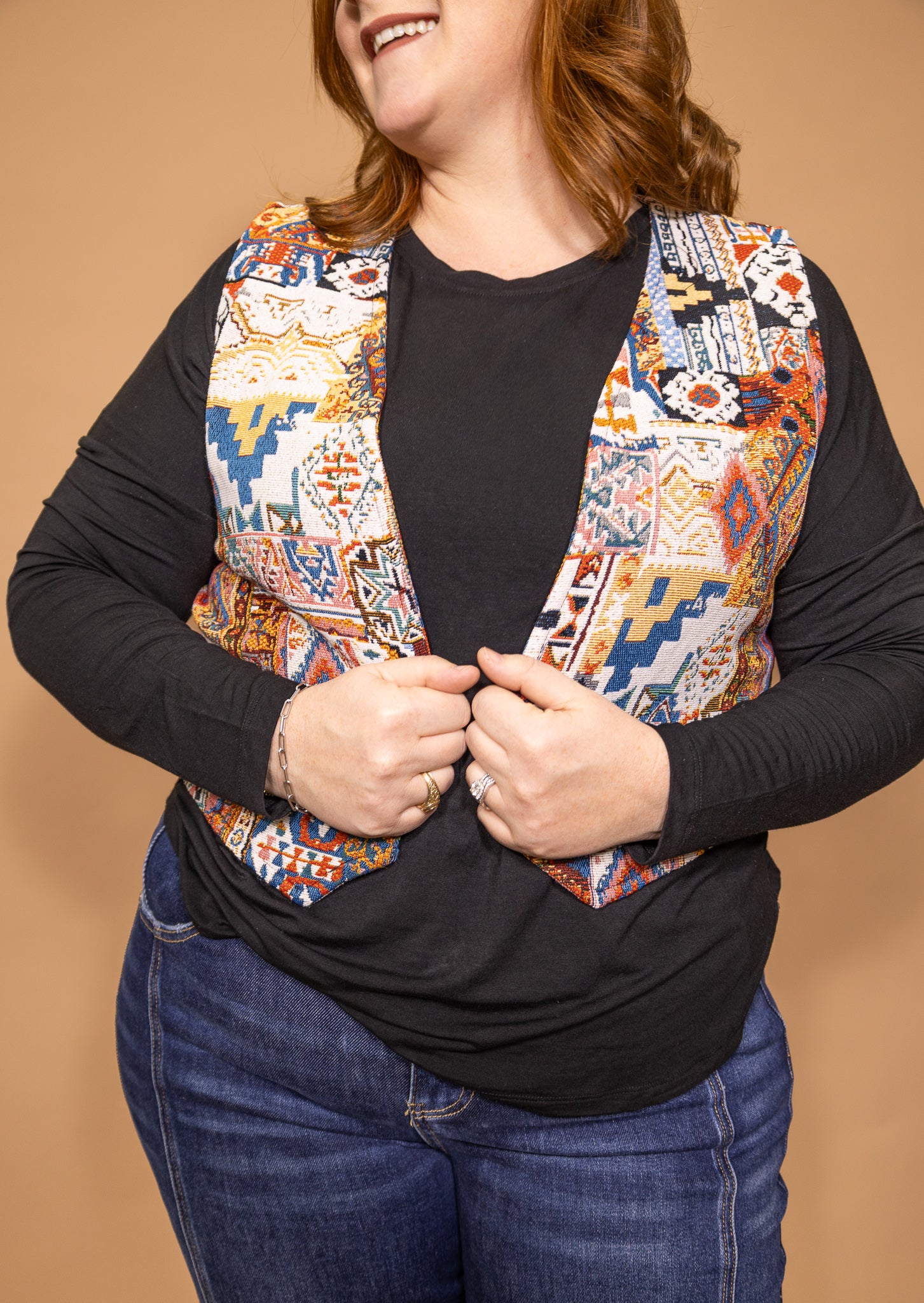The perfect finishing layer for crisp days and cozy nights. Sierra Sunset features a rich, tapestry-style Western print in warm sunset tones that instantly elevates any outfit. Designed with an open-front silhouette for easy layering, it pairs beautifully over graphic tees, long sleeves, or lightweight knits. Add it to denim for an effortless boutique look with just the right touch of Western flair.