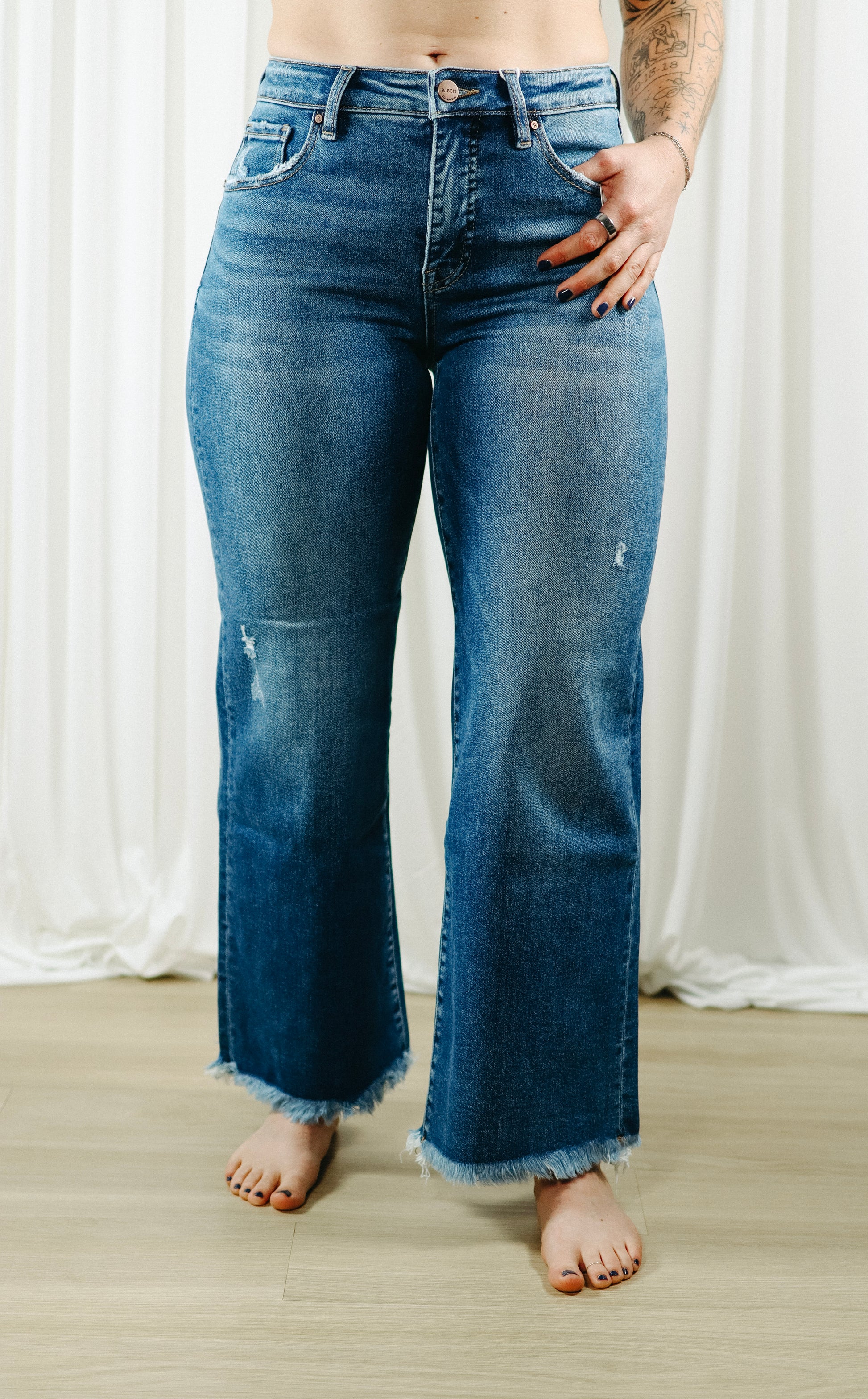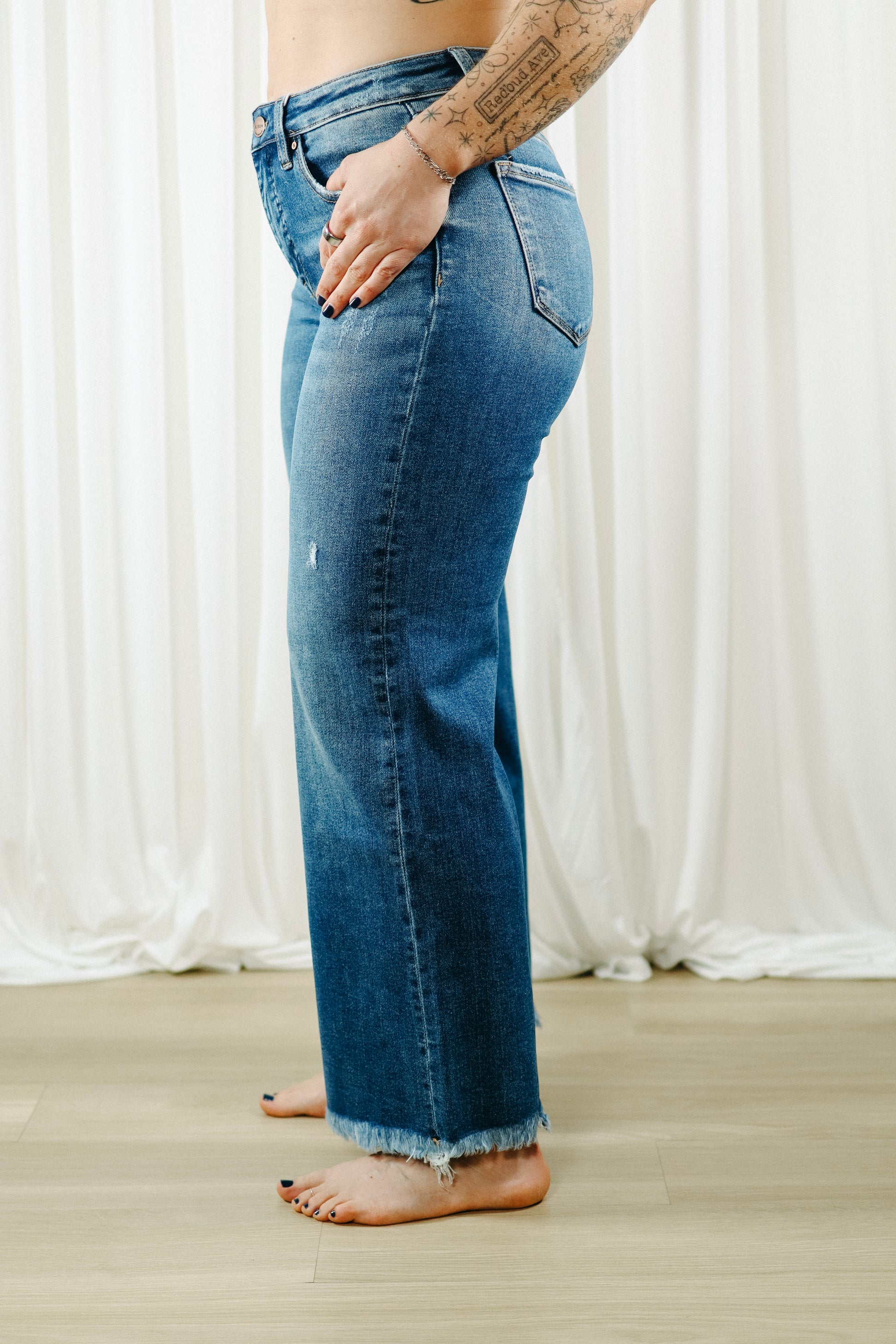 The medium wash has natural fading in all the right places, plus subtle distressing for that lived-in feel. And that raw, frayed hem? Just enough edge without being too much.