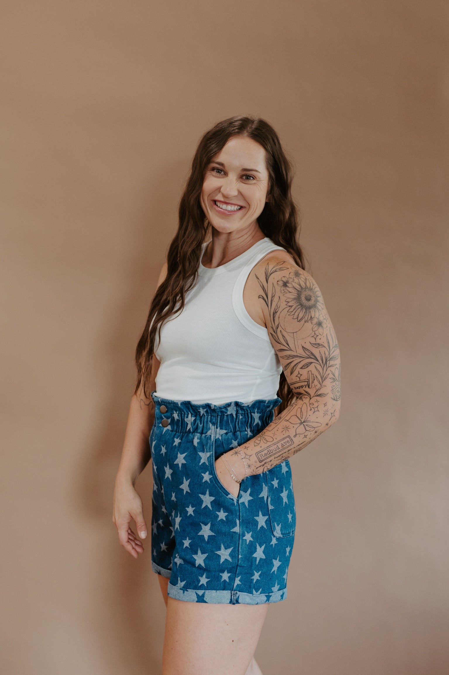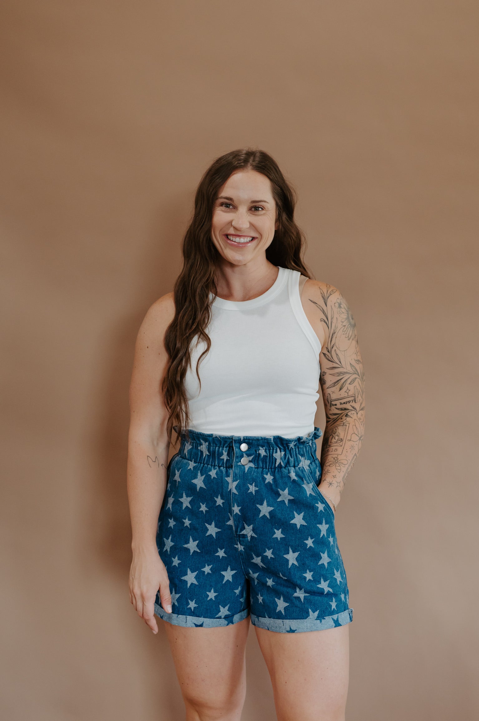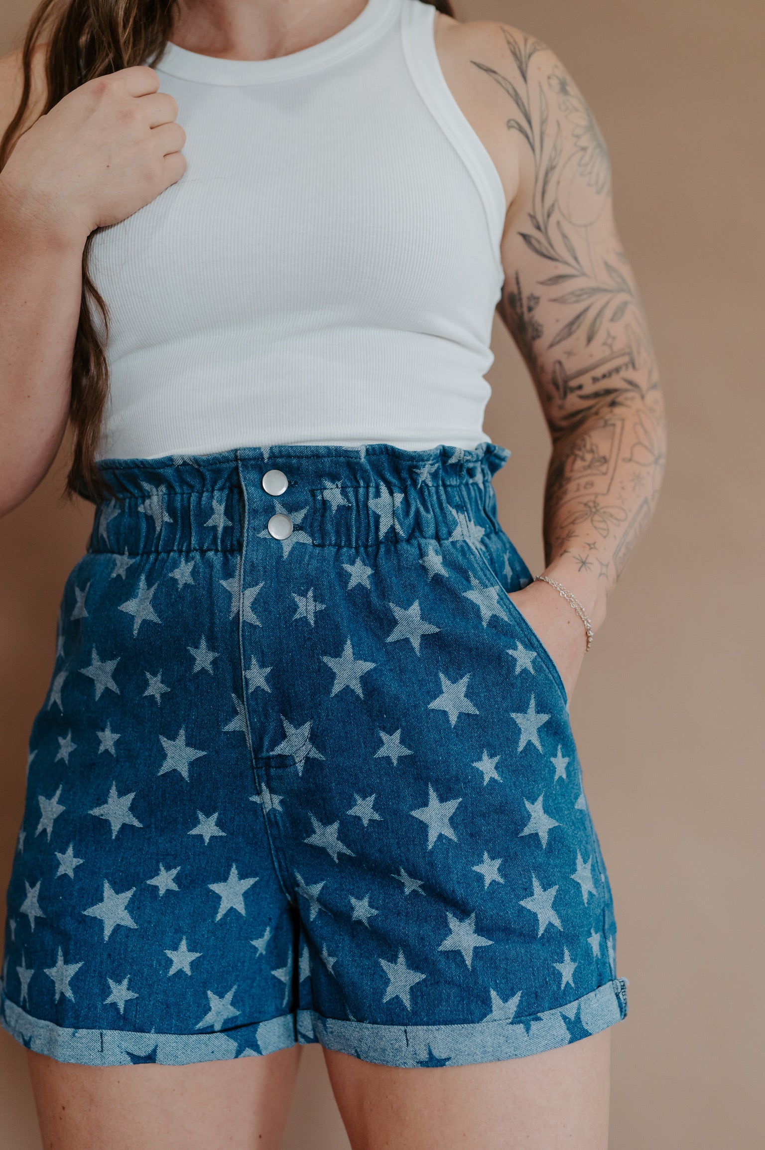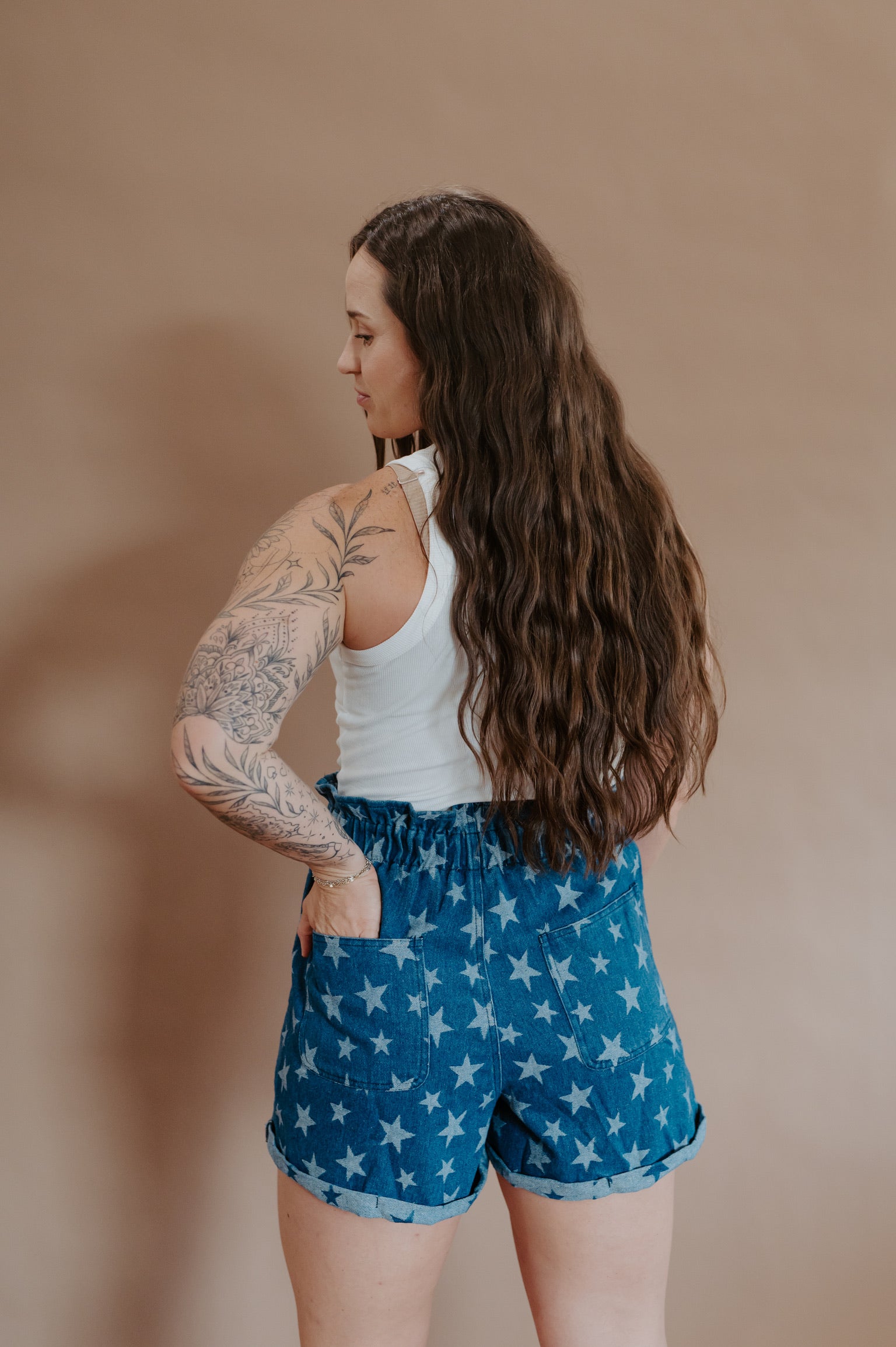 Add a burst of fun to your outfit with these denim paper bag shorts adorned with a charming star print. The cinched waist offers a trendy, comfy fit, while the playful pattern makes them perfect for sunny days and casual hangouts. Embrace effortless style and a touch of sparkle wherever you wear them!