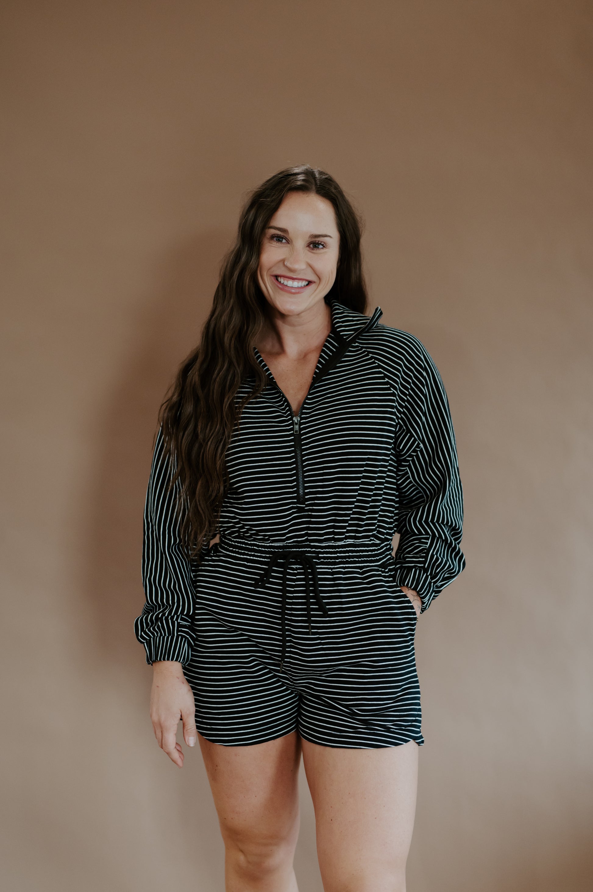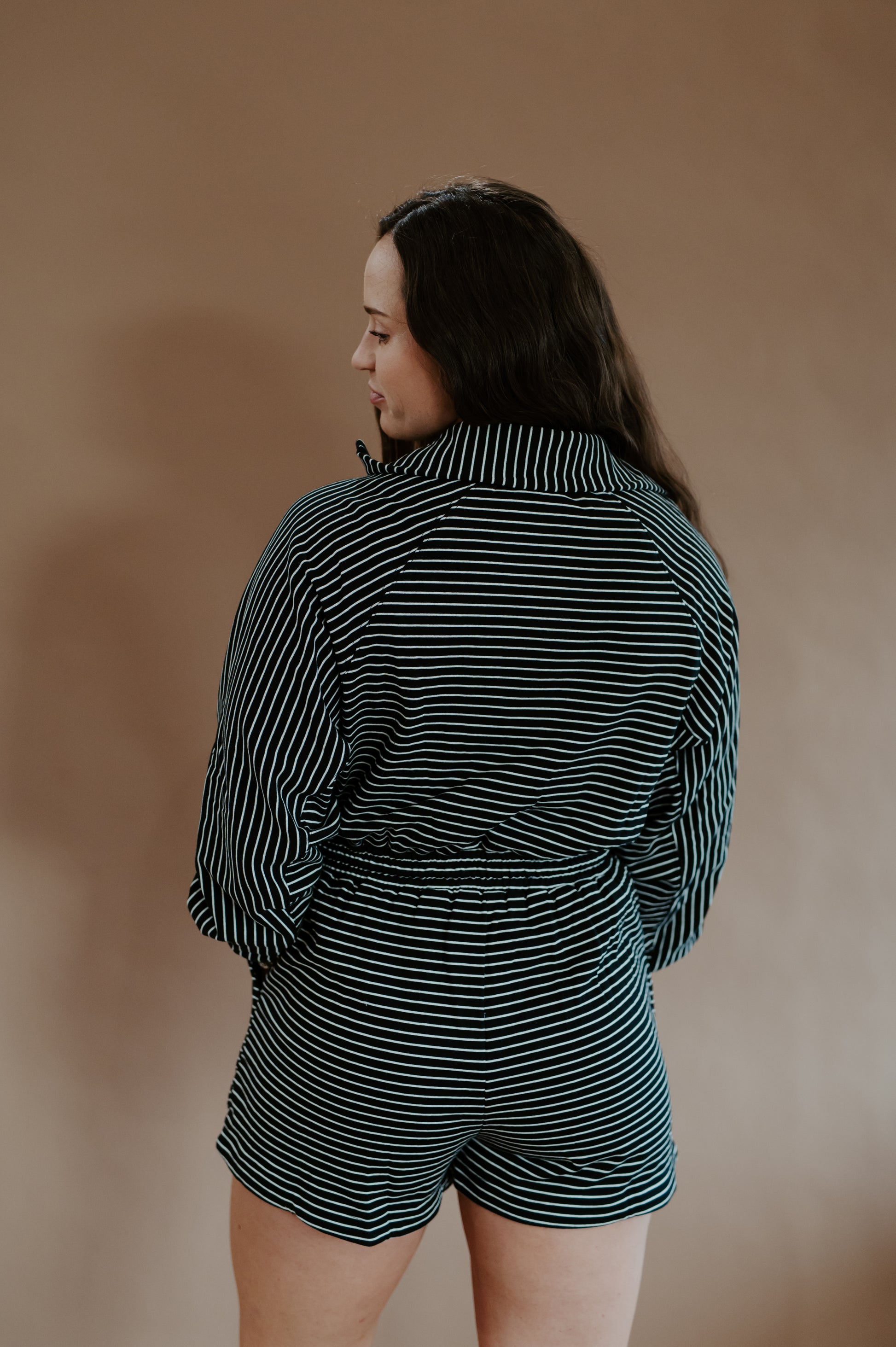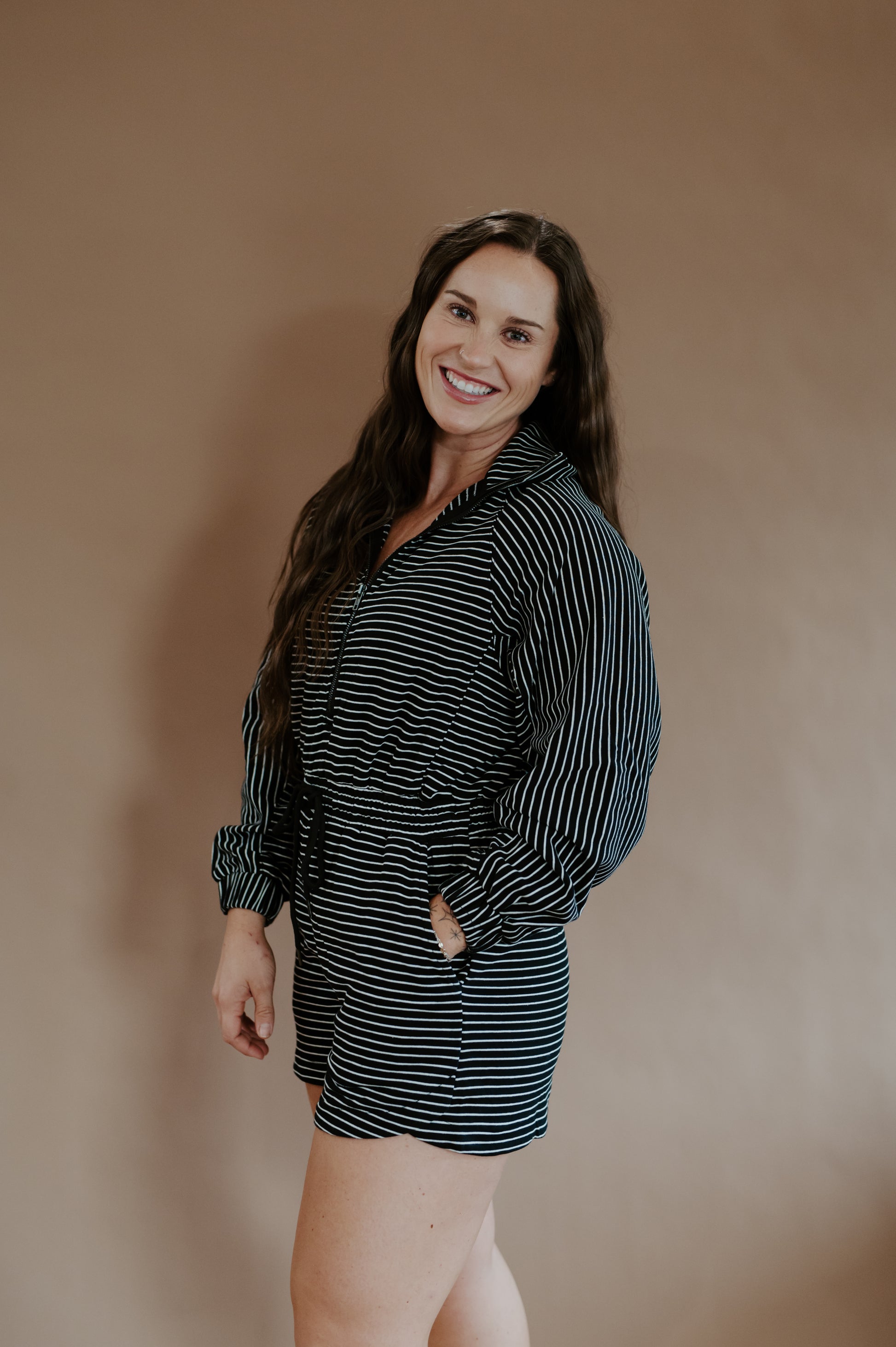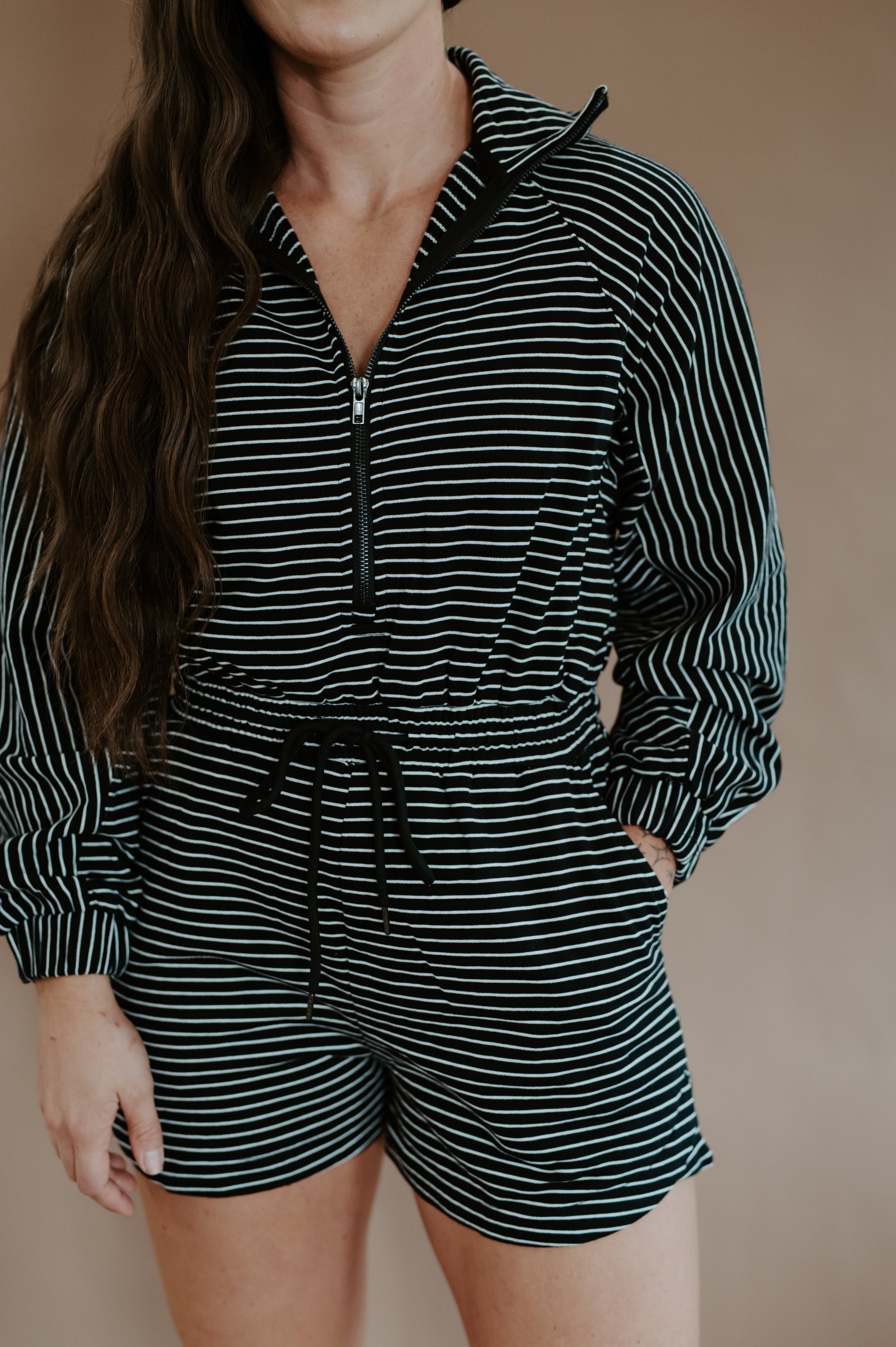 Meet your new go-to romper—the Blair. This black-and-white striped beauty is the perfect blend of laid-back comfort and chic everyday style. Designed with a half-zip front, adjustable drawstring waist, and long sleeves, it gives you a flattering fit while keeping things casual and effortless. The soft, lightweight fabric makes it comfy enough for lounging, yet put-together enough to wear out and about.