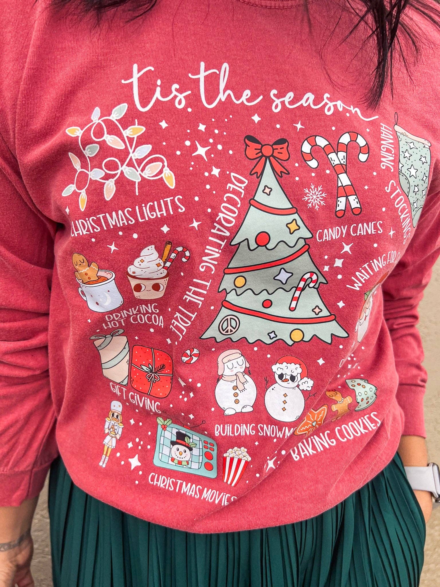 Deck the halls in festive style with this playful long sleeve Christmas tee. Featuring a cheerful "Tis the Season" design, it's the perfect cozy layer for holiday gatherings, casual winter outings, or anyone who loves spreading seasonal cheer year-round. The rich crimson hue adds warmth and character to your wardrobe. Soft, comfortable, and ready to become a holiday favorite—grab yours before the season passes!