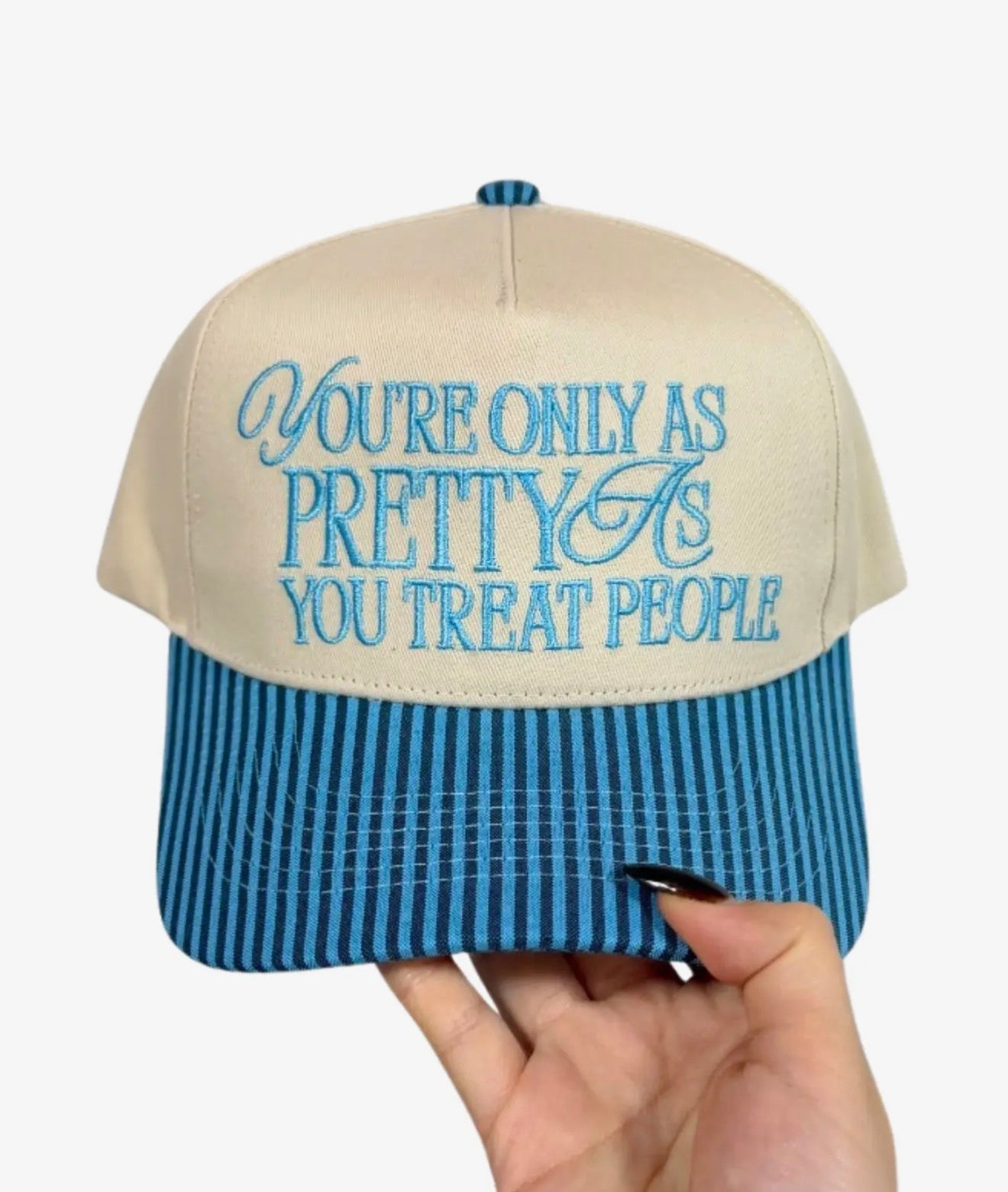 A cream and blue trucker hat featuring the embroidered phrase “You’re Only As Pretty As You Treat People.” Finished with a bold striped brim for the perfect mix of cute and statement. The easiest way to top off any outfit. 🤍