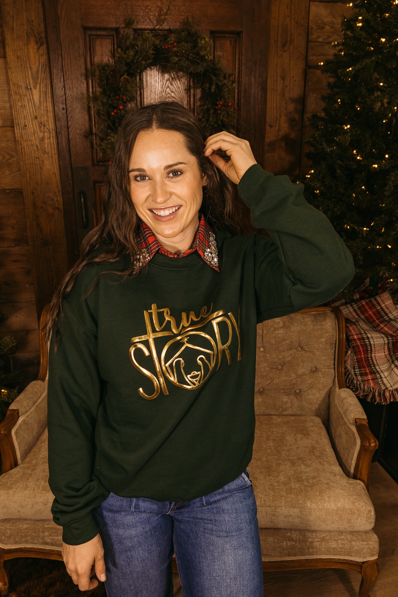 True Story Crewneck This crewneck celebrates what matters most—a vibrant green that feels both festive and grounded, perfect for layering over our plaid corporate collar or wearing as your everyday reminder. With a nod to the season's deeper meaning, it's a piece that lets your faith and values shine through in a way that's genuine, comfortable, and authentically you. Because the true story never goes out of style.