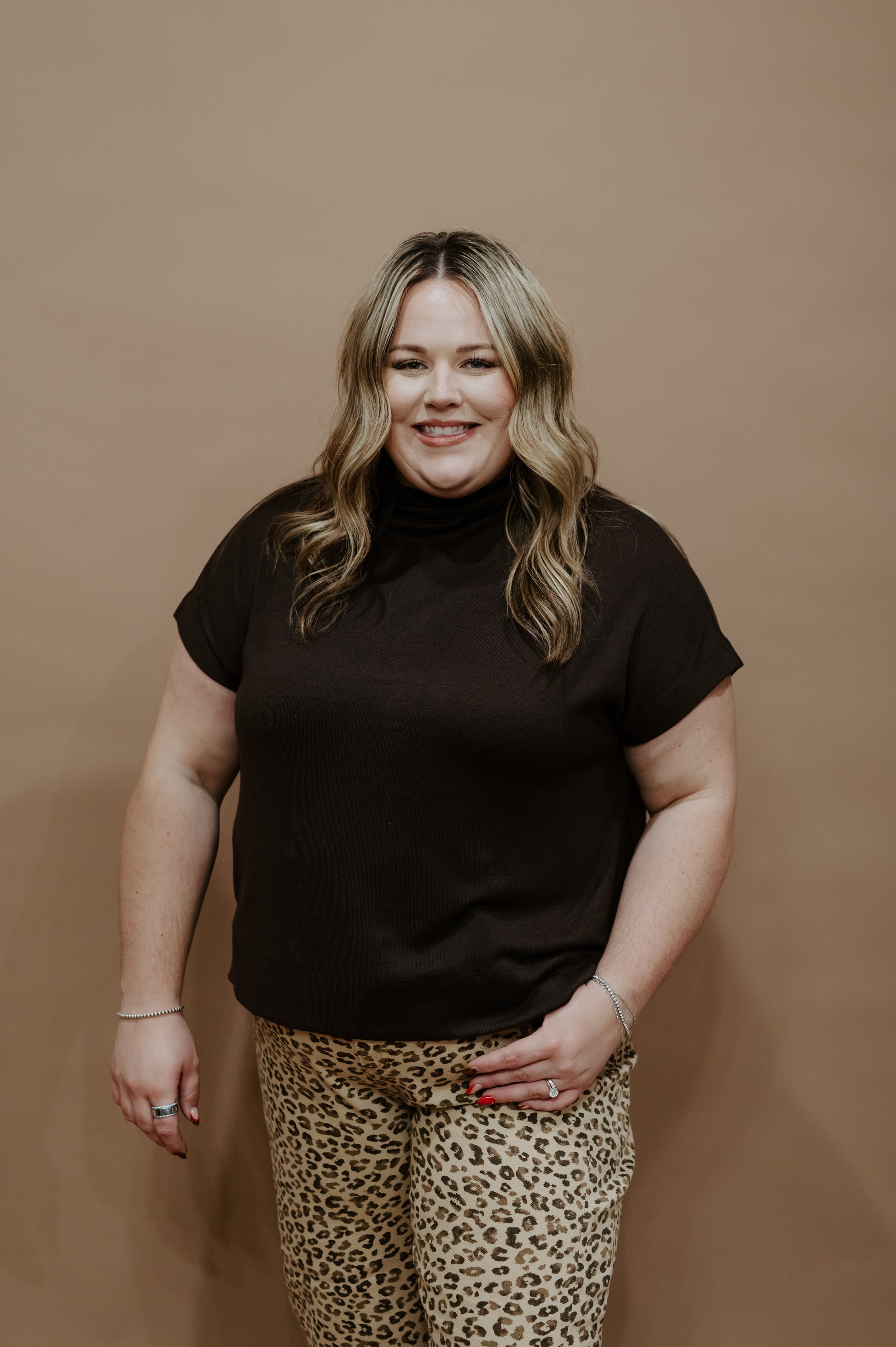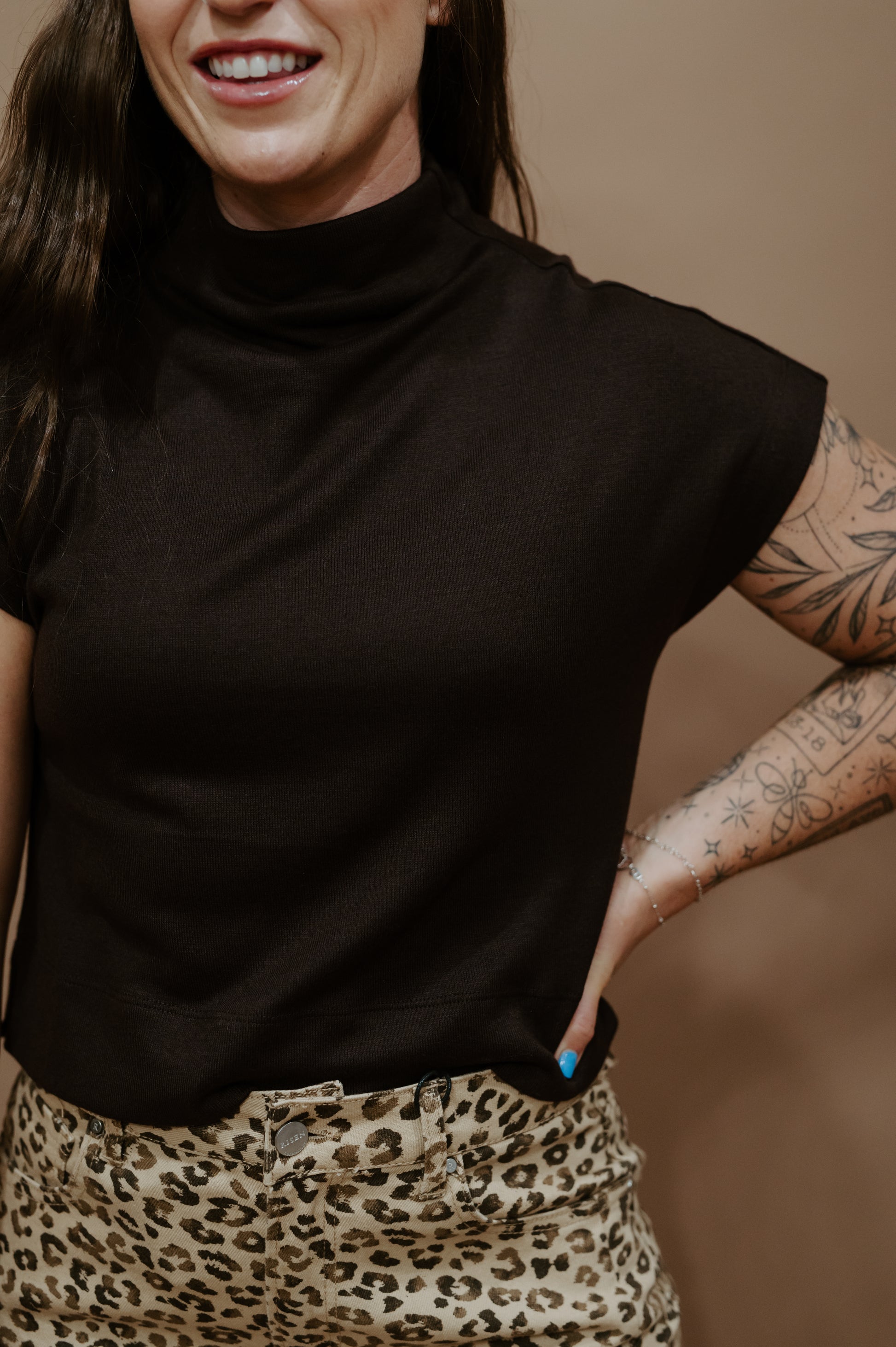 Sleek, minimal, and effortlessly chic – the Urban Mocha Top is the definition of modern versatility. Designed in a rich mocha brown, this mock-neck knit features a soft, lightweight feel with a relaxed silhouette that drapes just right. The cap sleeves give it a polished edge, making it perfect for layering or wearing solo.