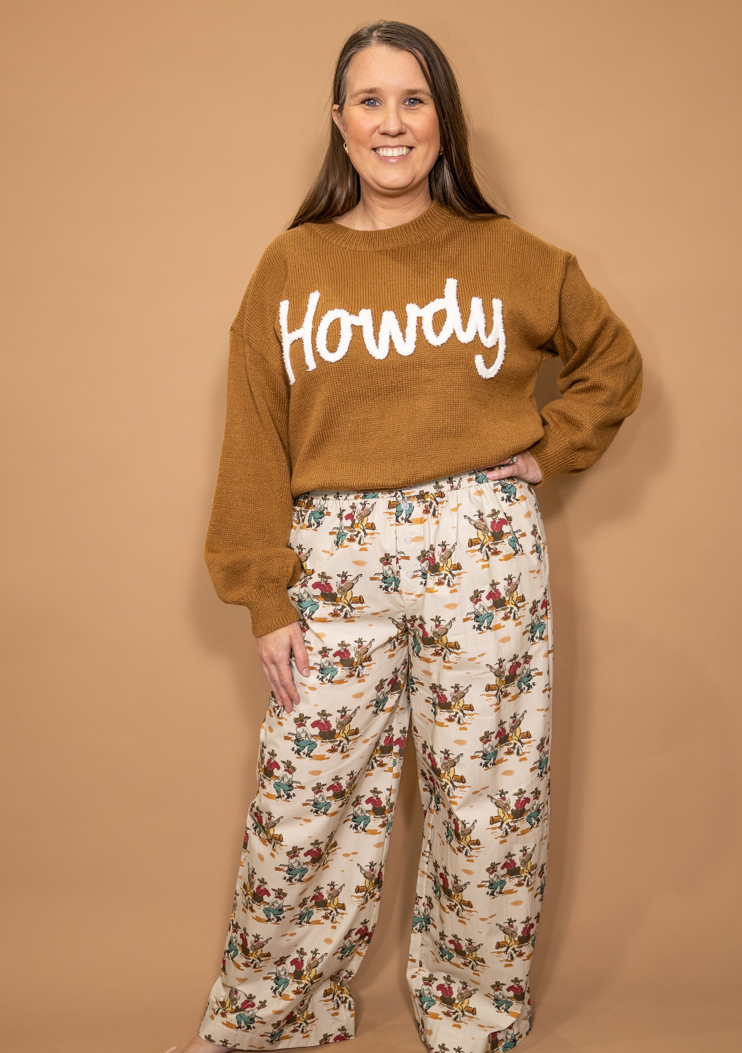 Fun, comfy, and full of western charm. These relaxed-fit pants feature a playful cowboy wagon print that brings personality to even the coziest outfit. Designed with a stretchy elastic waistband and functional button detail, they’re made for lounging, running errands, or pairing with a chunky sweater for an effortlessly cute fall look. Easy, breathable, and guaranteed to spark compliments.