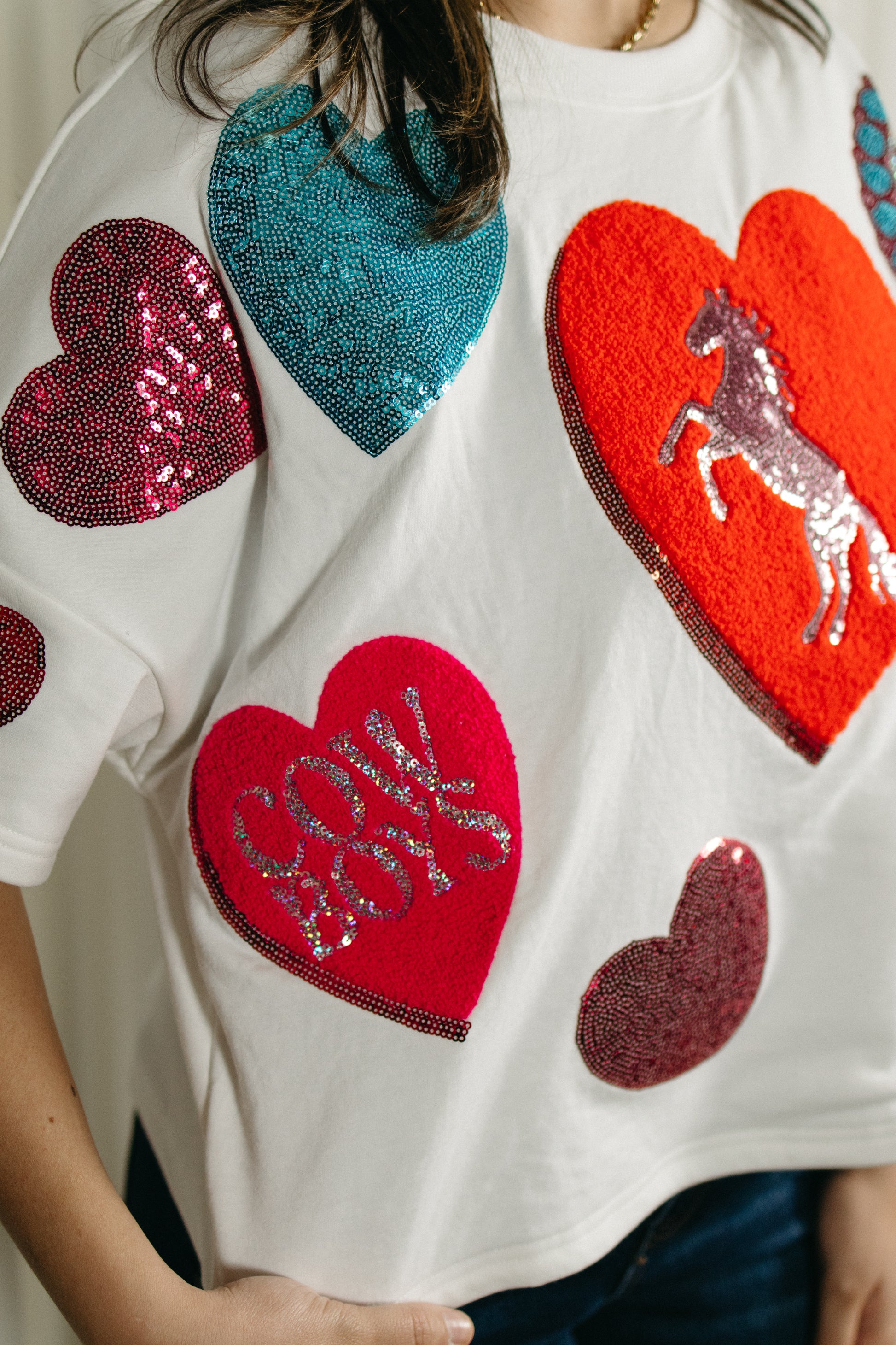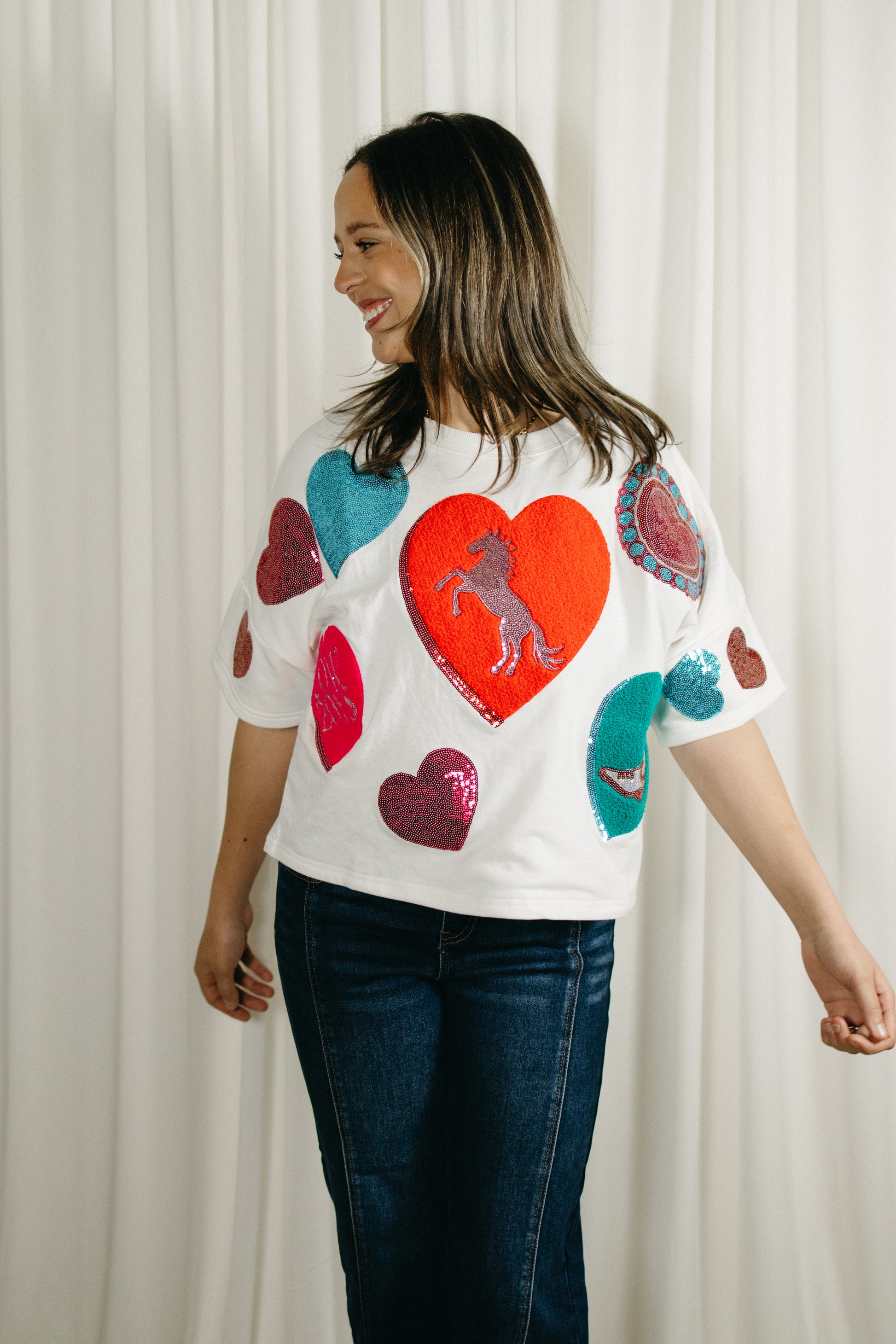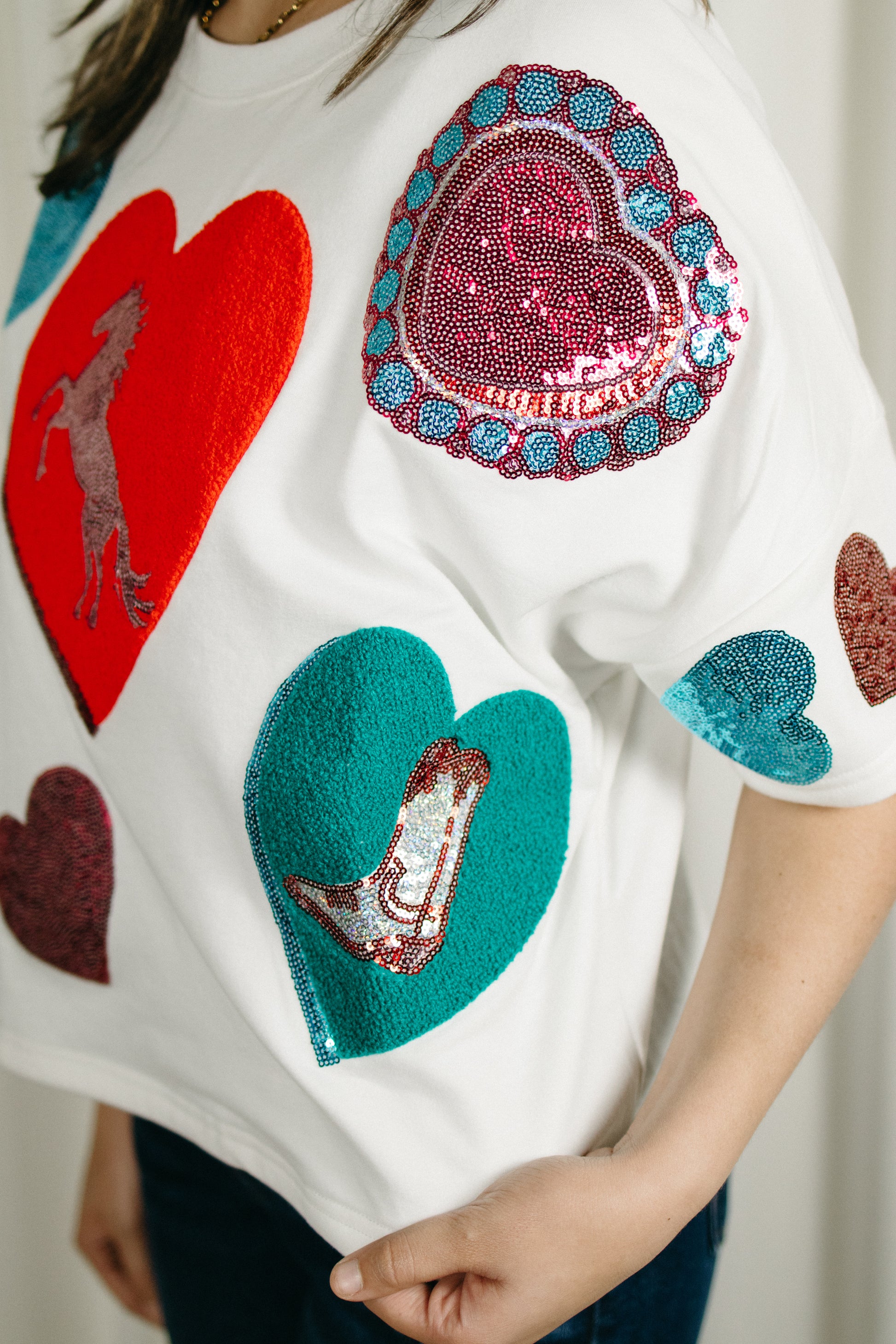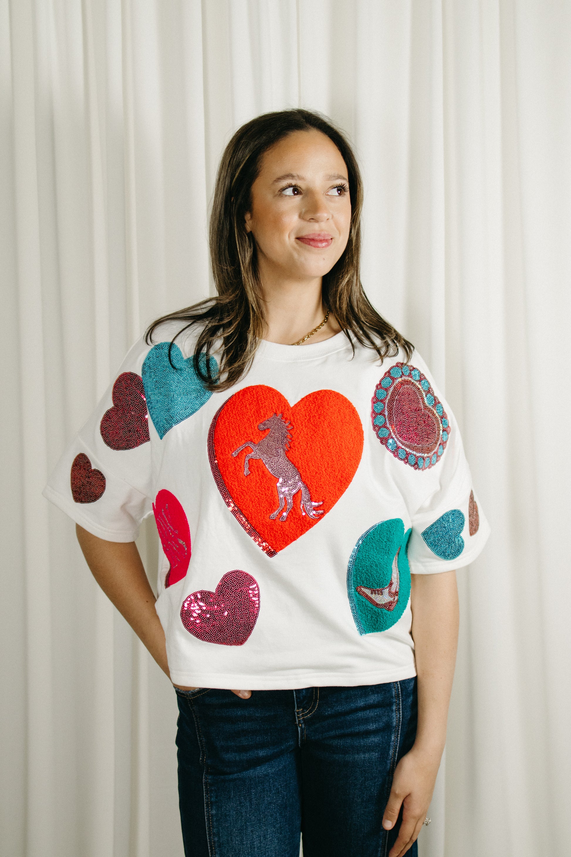This statement tee is covered in bold heart details with a fun western twist that brings all the charm. Easy, relaxed fit with eye-catching pops of color that do all the talking. Sheโs comfy enough for everyday but cute enough to turn heads.