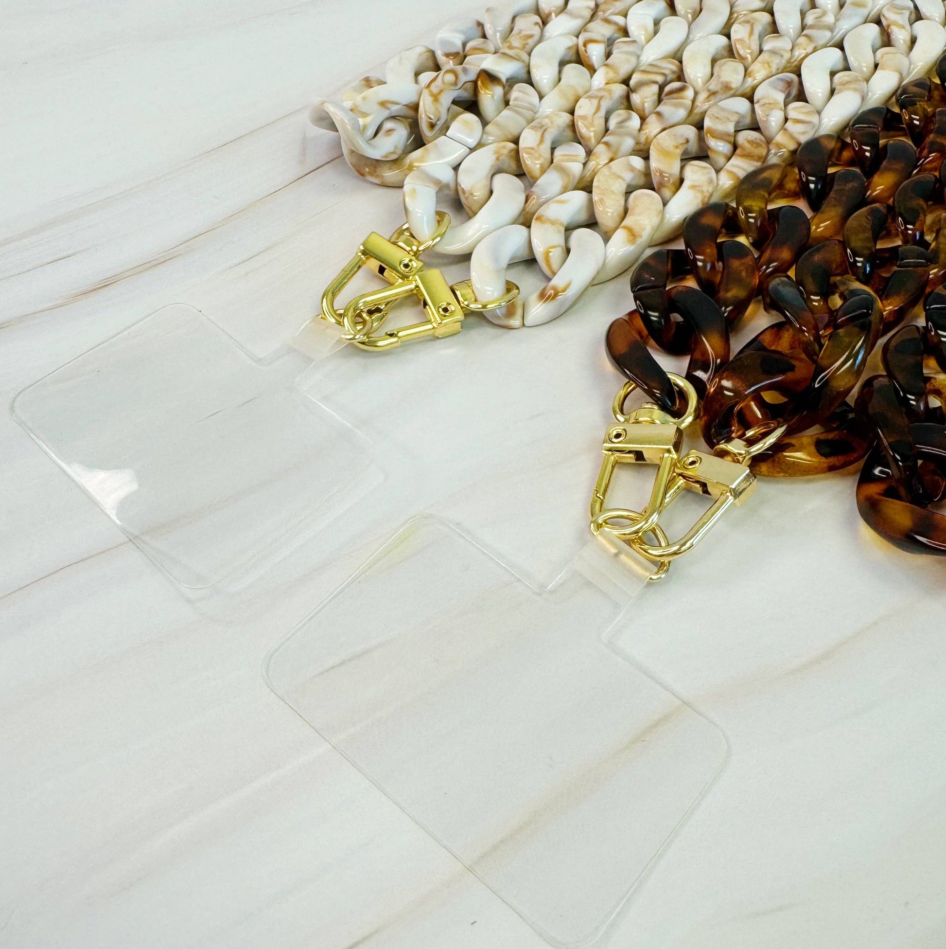 Attach this versatile lanyard to your phone, bags/wallets, ID or keys for hands-free convenience. The beautiful tortoise patterned acrylic chain features golden hardware and includes a cello card for easy attachment. Keep your essentials close and secure with the Wink Lynk Multi Function Chain Lanyard Dimensions: approximately 0.8 " x 43" 18k gold plated brass, acrylic links Lead and Nickel free