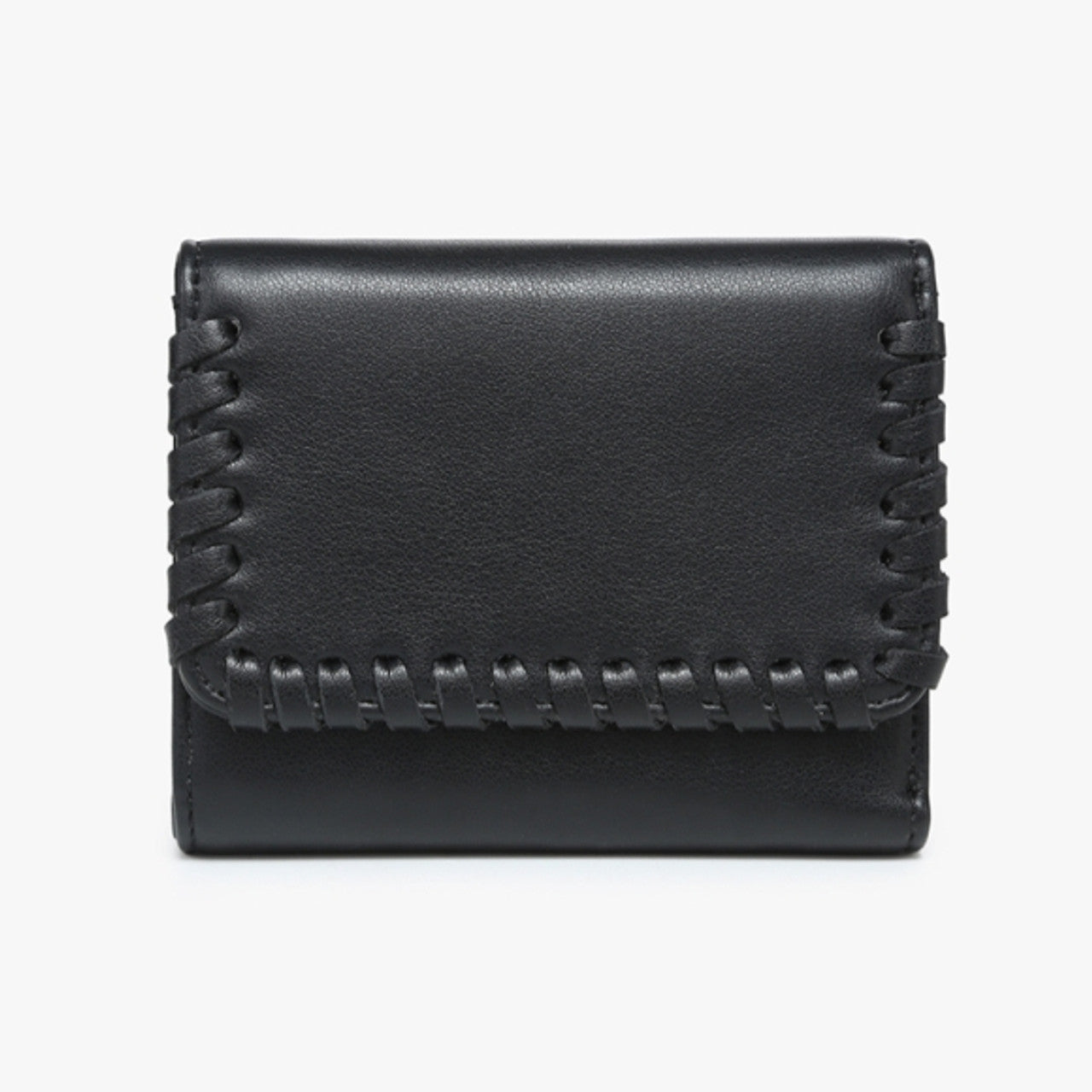 This tri-fold wallet offers both style and functionality with its whipstitch detailing and practical interior featuring an ID holder and card slots, all crafted from vegan leather for a cruelty-free accessory option.