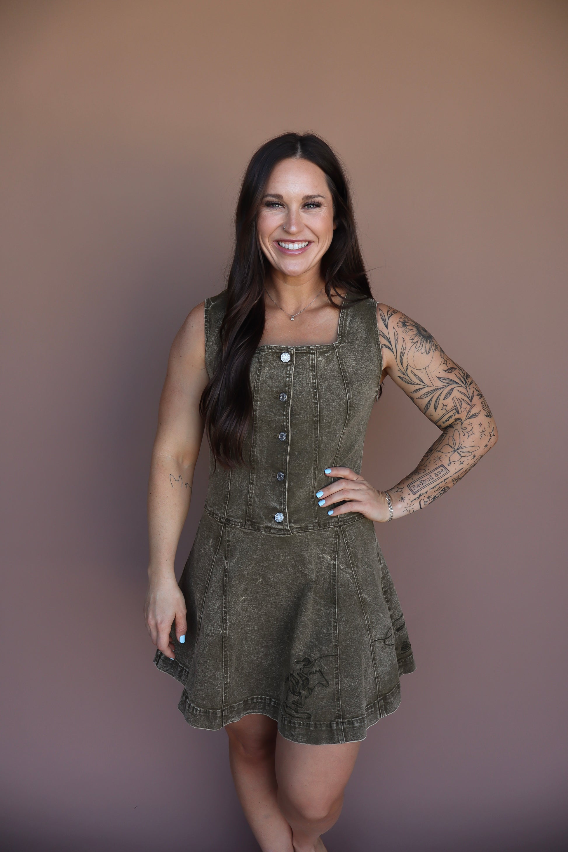 Unleash your inner cowgirl with this flirty minidress! Made from stretch denim, it features a playful square neckline, classic button front, and charming Western-inspired embroidery. Don't forget the fit-and-flare silhouette and garment-washed finish for the perfect touch of sass.